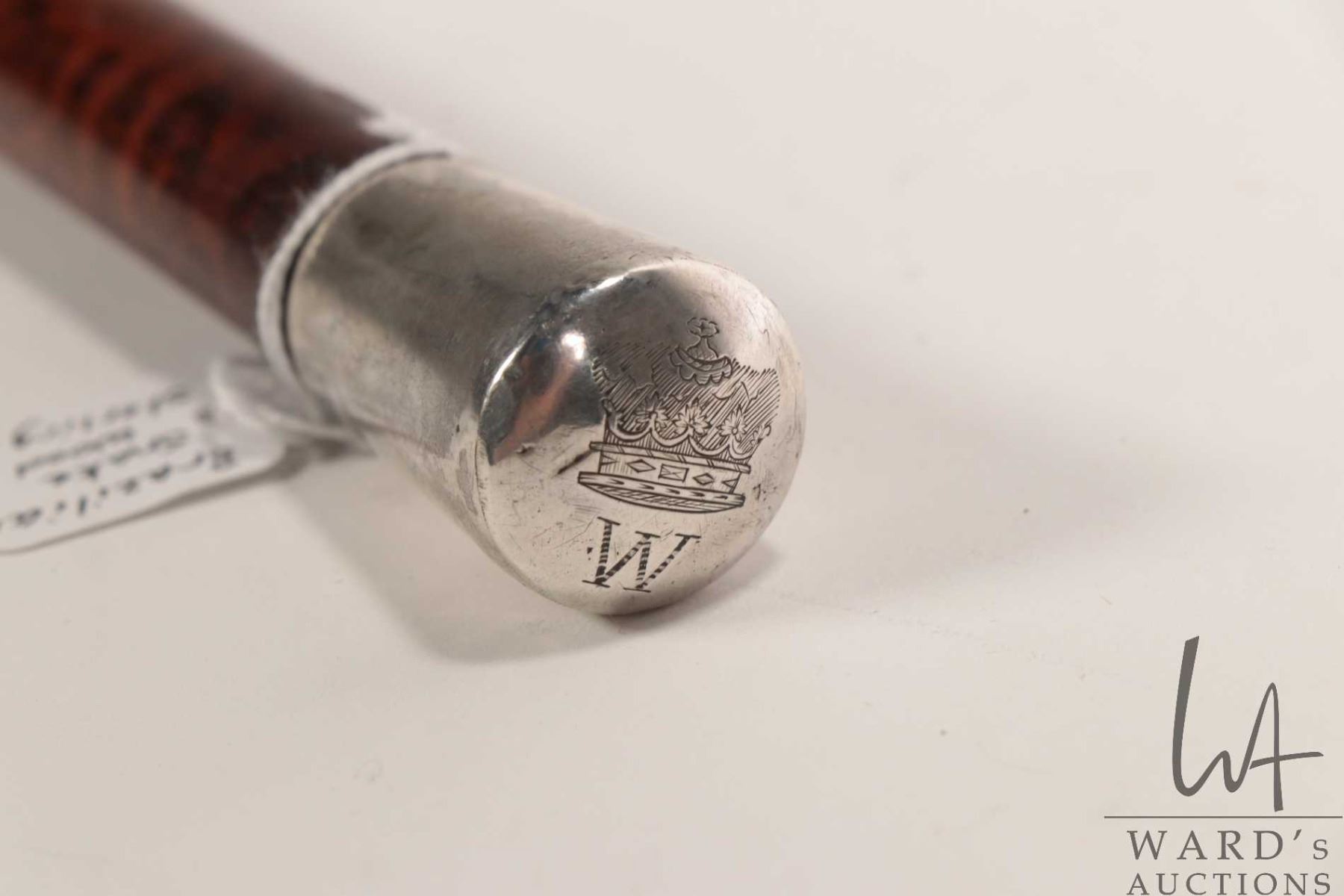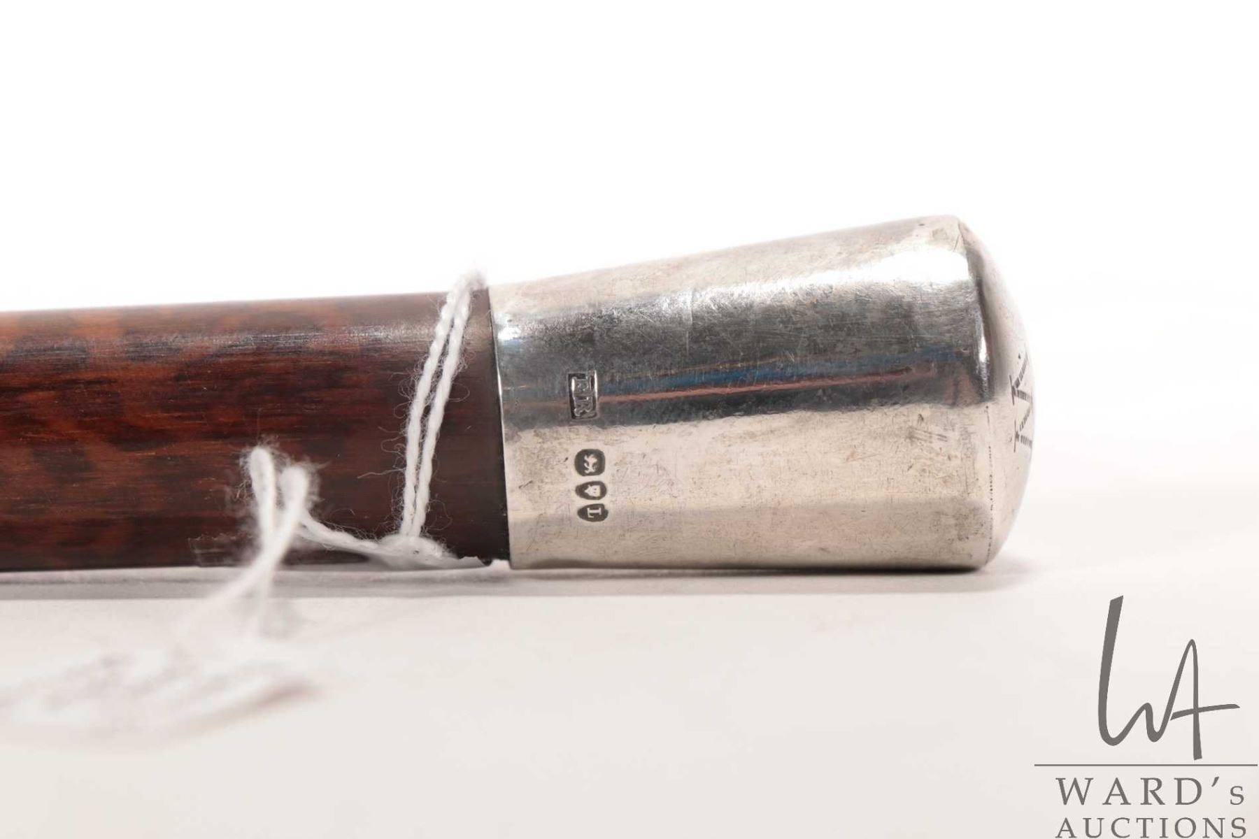 Antique Brazilian snakewood walking stick with sterling silver top marked with British hallmarks, 36