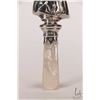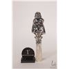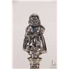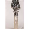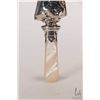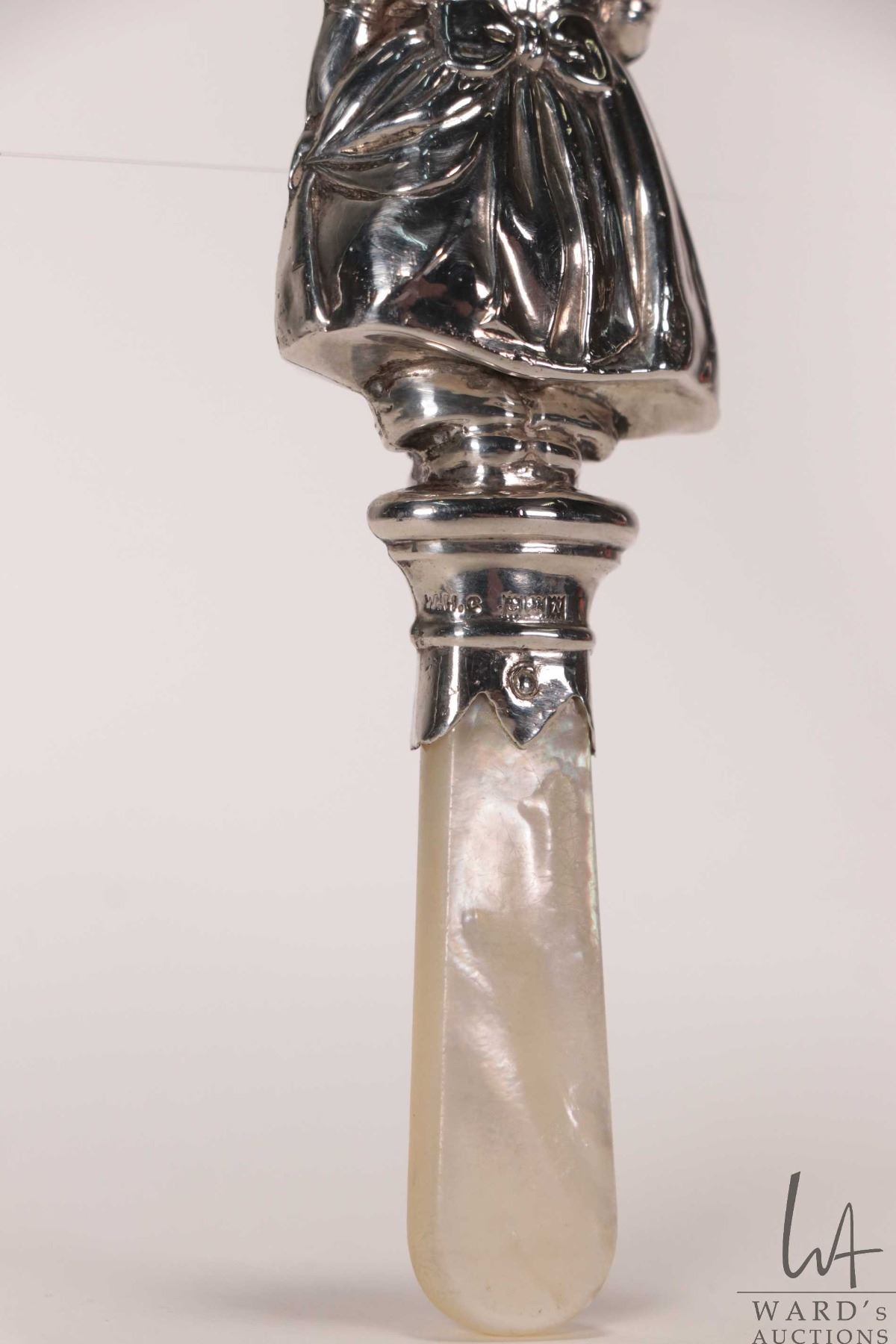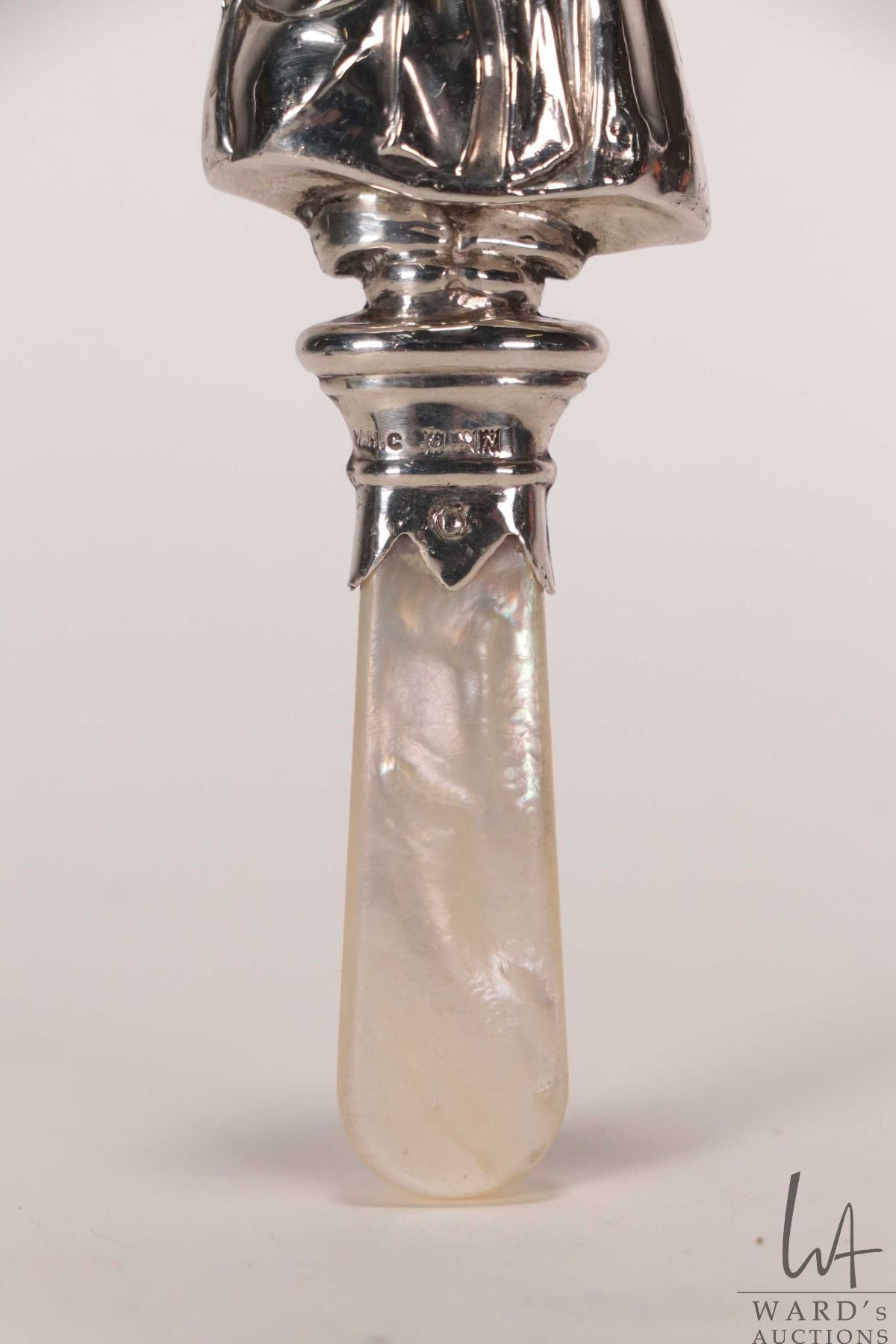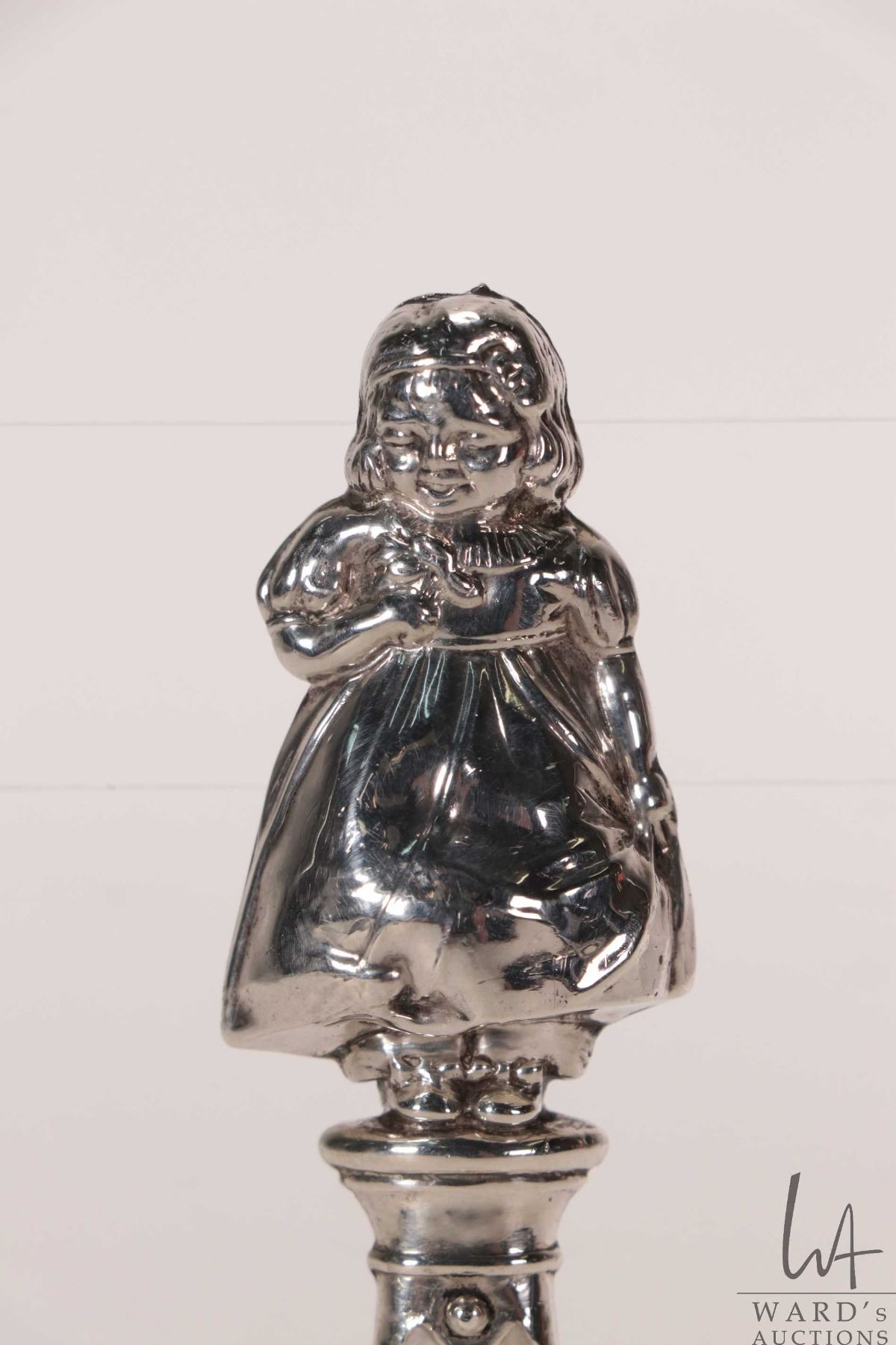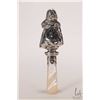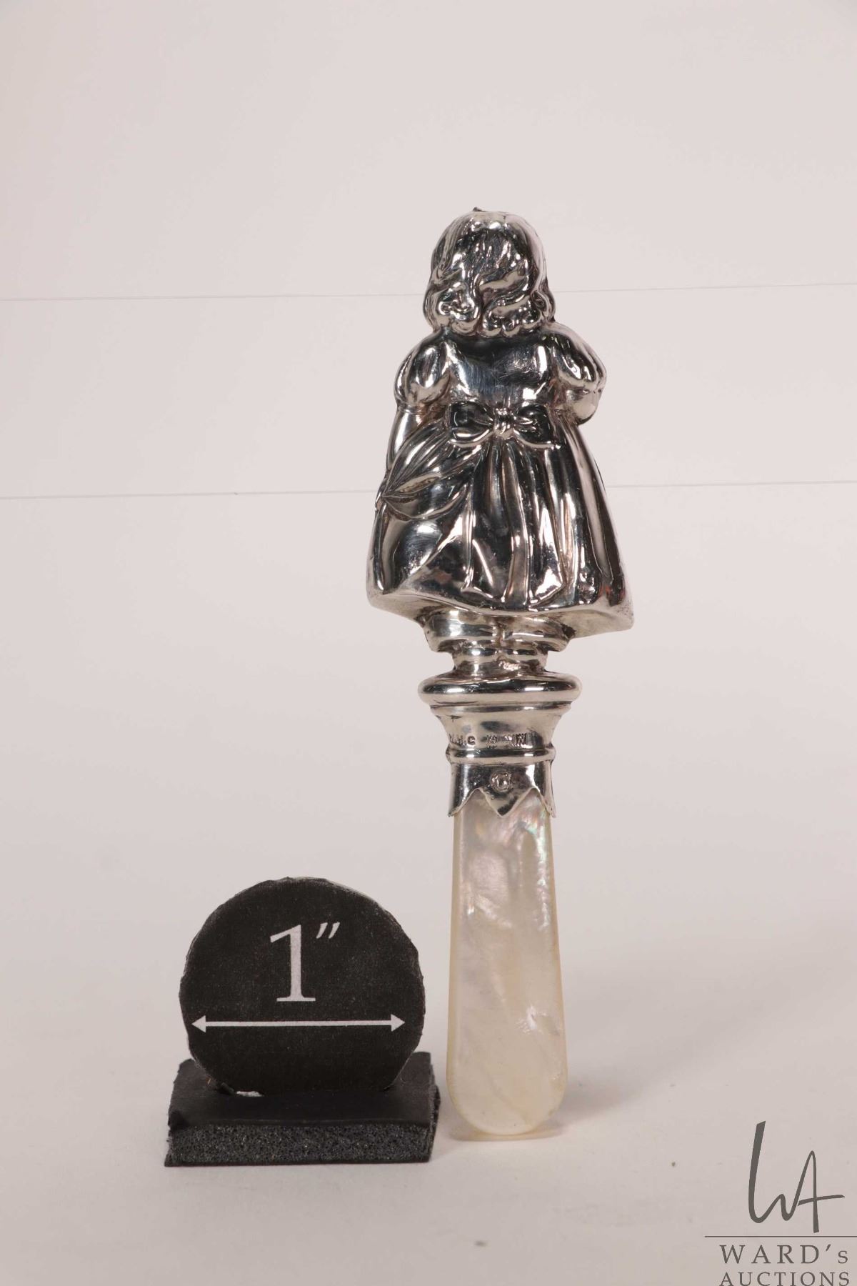 Antique British hallmarked sterling silver baby motif rattle with mother-of-pearl gum soother