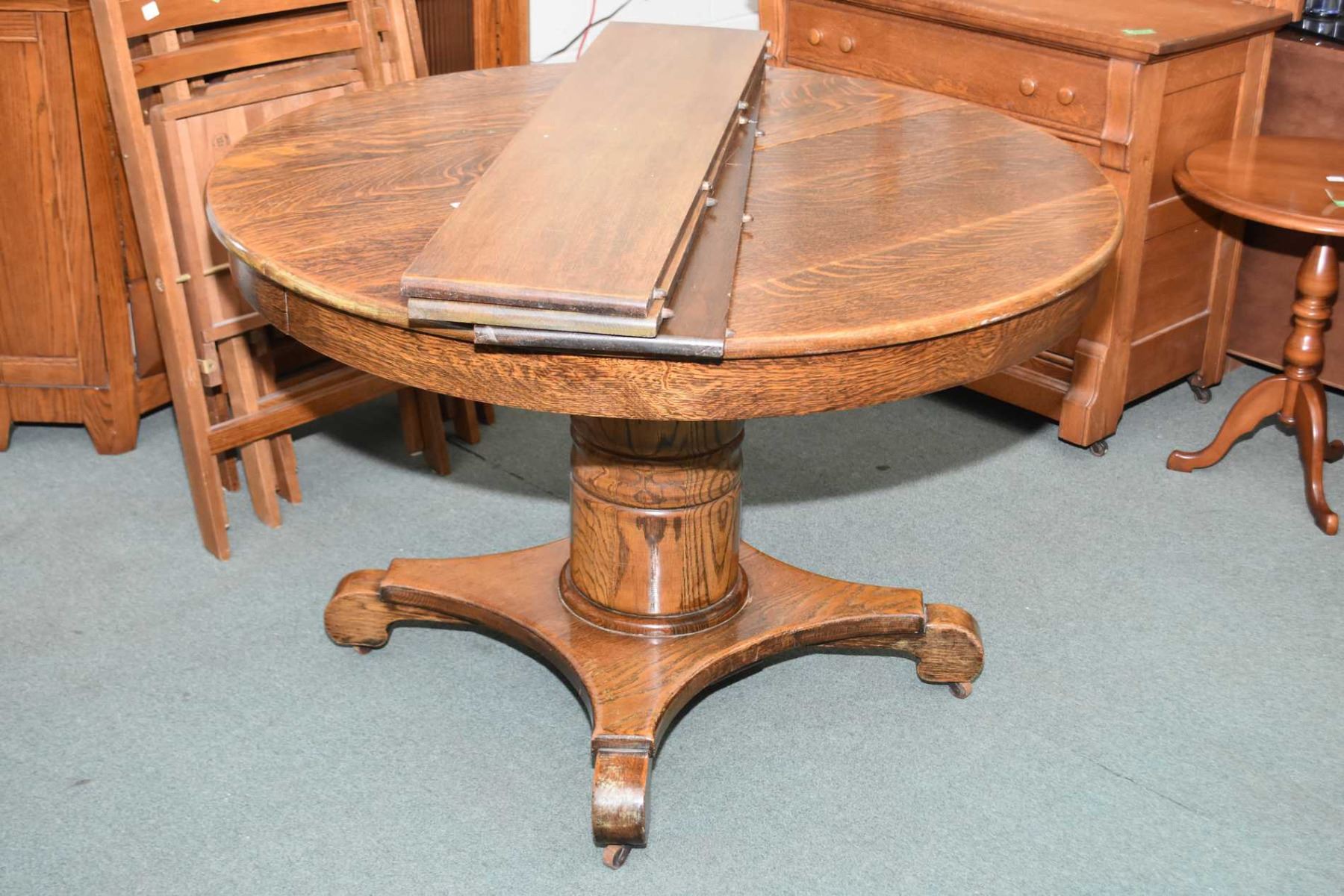 Antique Canadiana oak 44" round dining table with three insert leaves