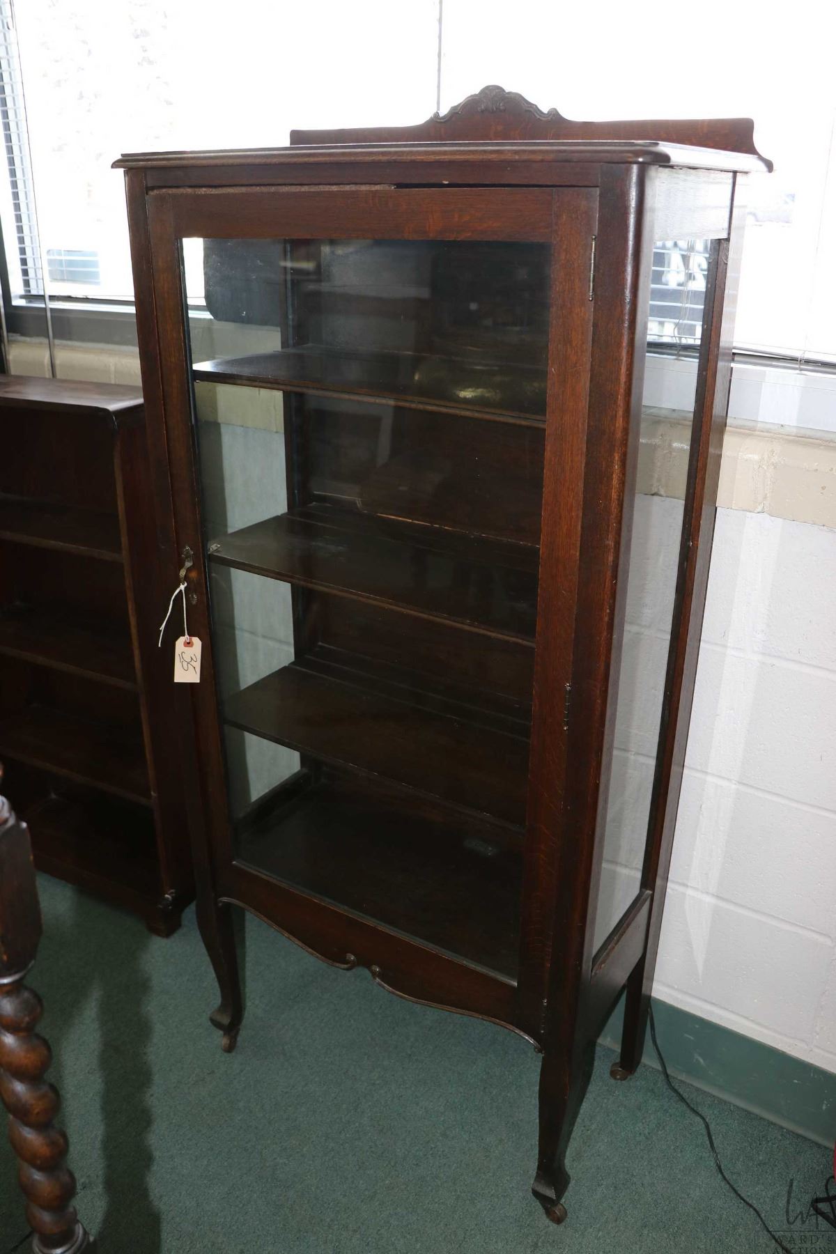 Antique Canadiana single door curio cabinet on metal castors, 59" in height