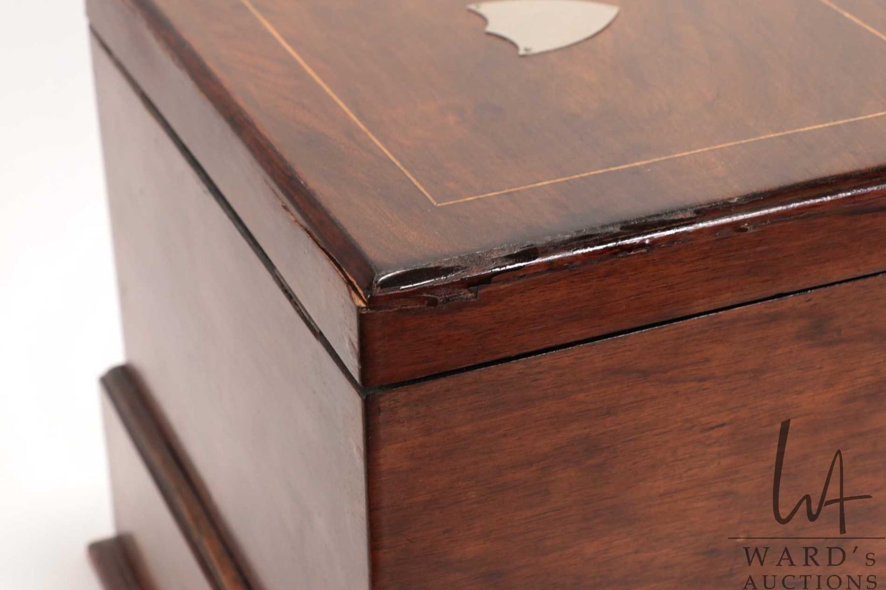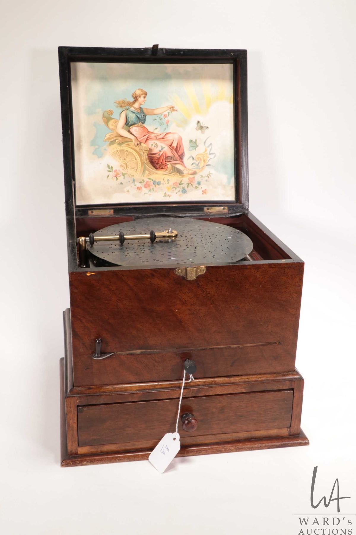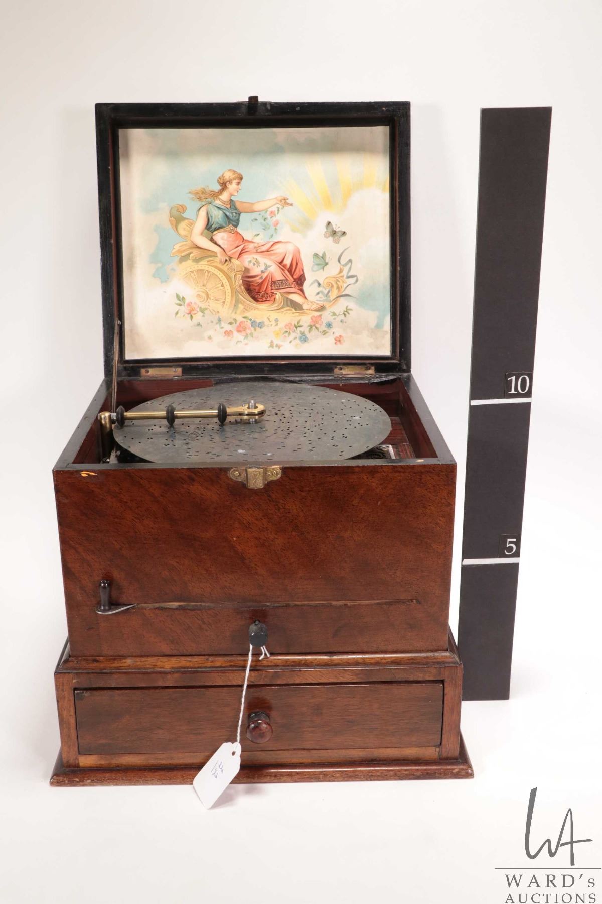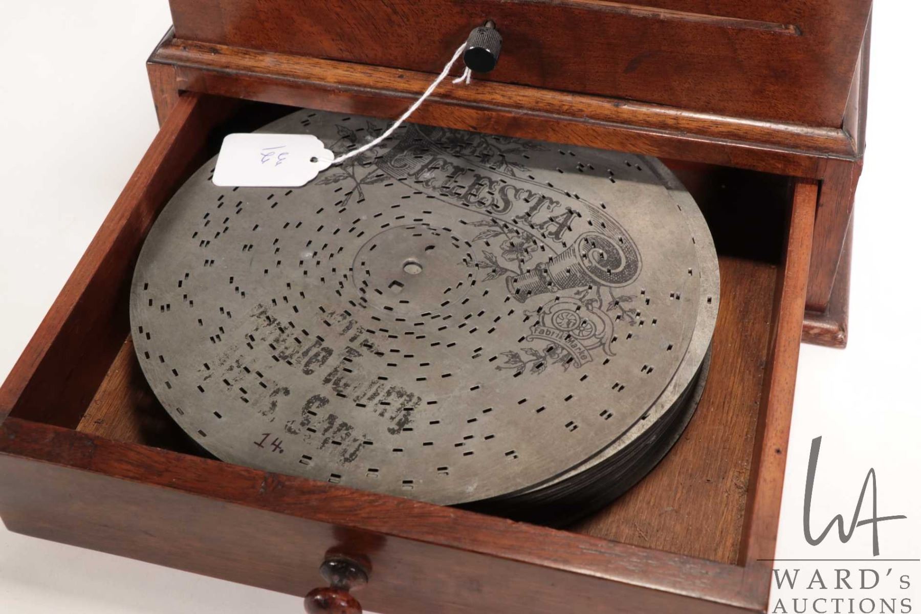 Antique Celesta music box with seventeen punched steel music discs, in fruit wood case with flip top and drawer base, working at time of cataloguing, 10" H X 12" W X 11" D
