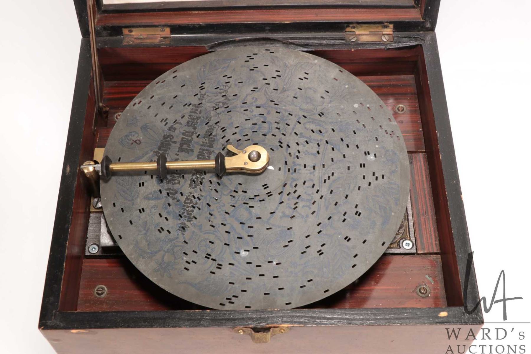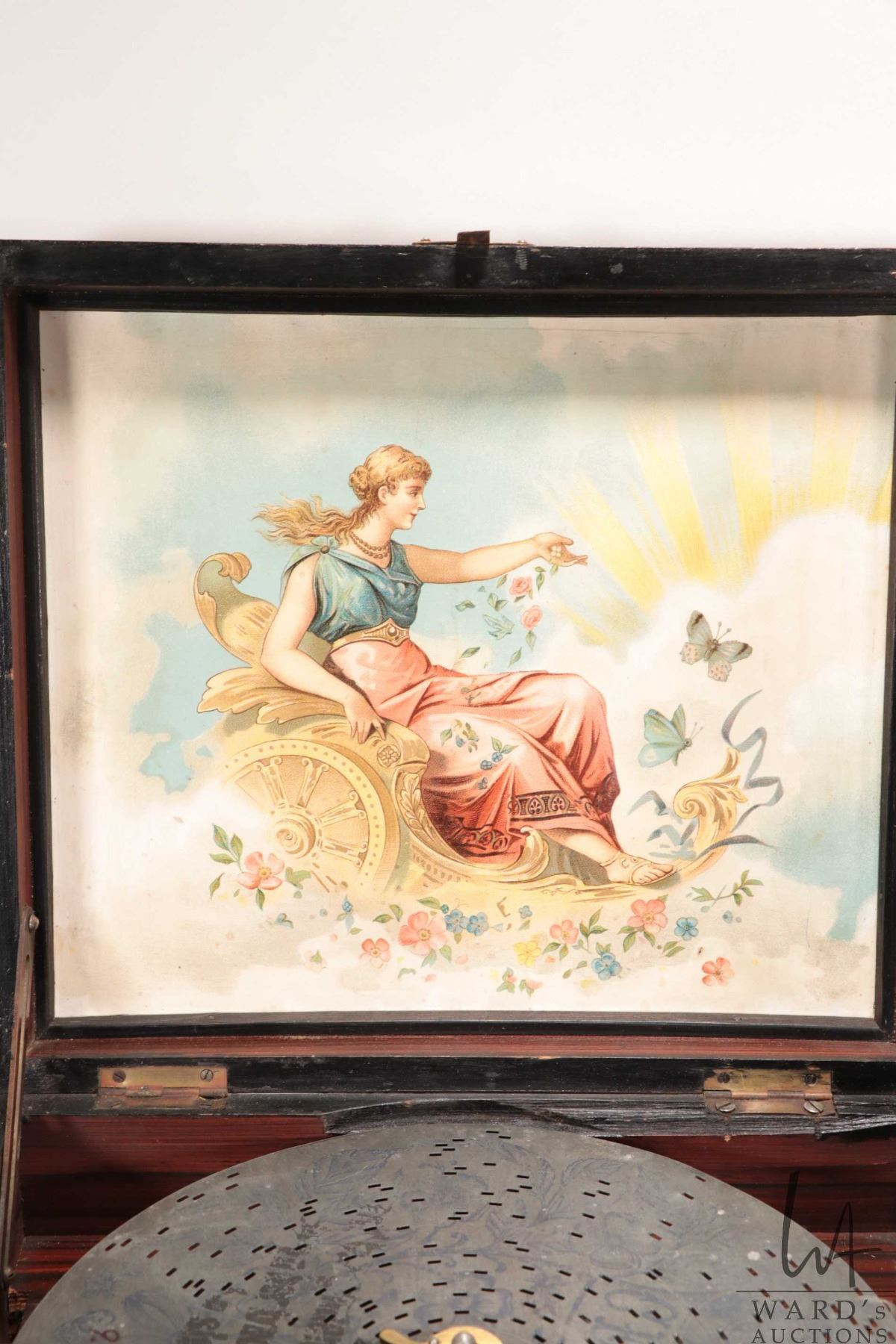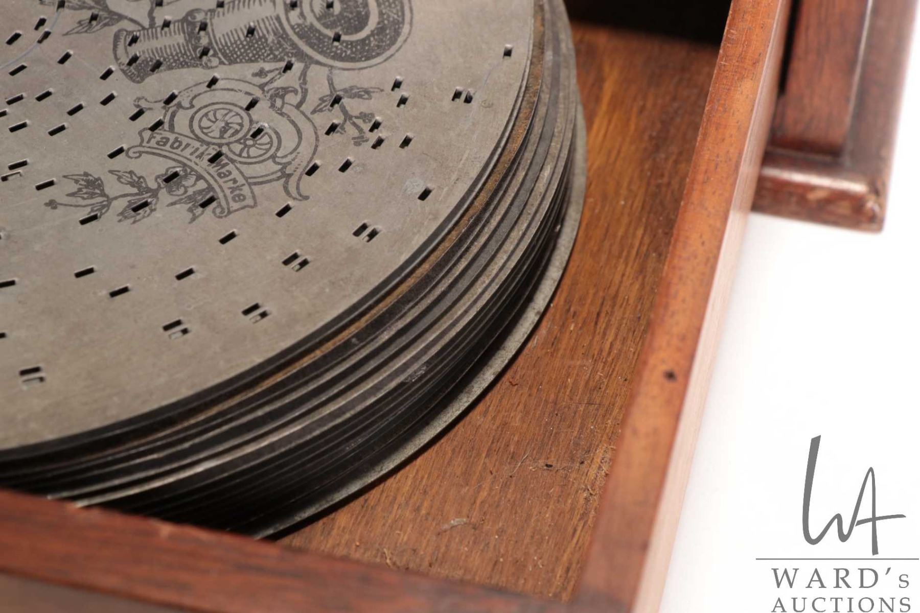Antique Celesta music box with seventeen punched steel music discs, in fruit wood case with flip top