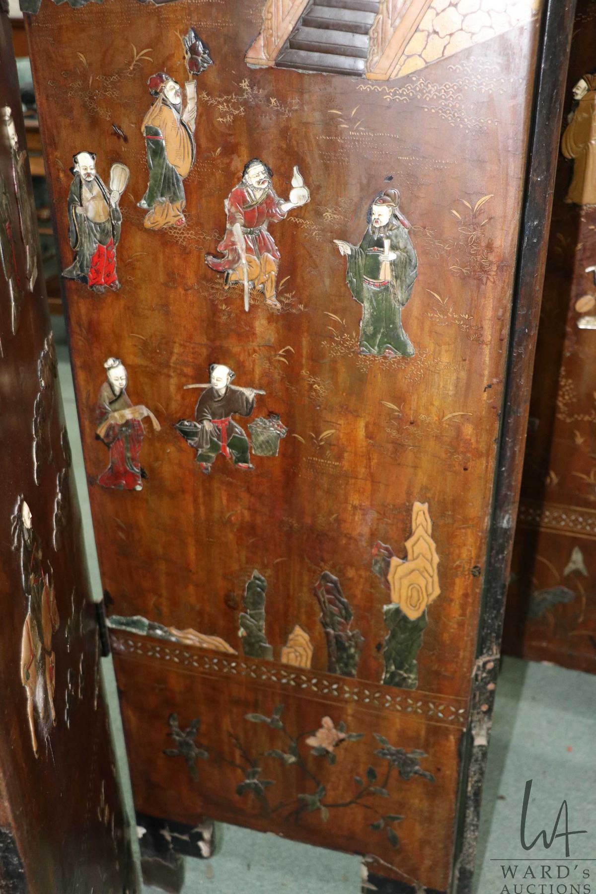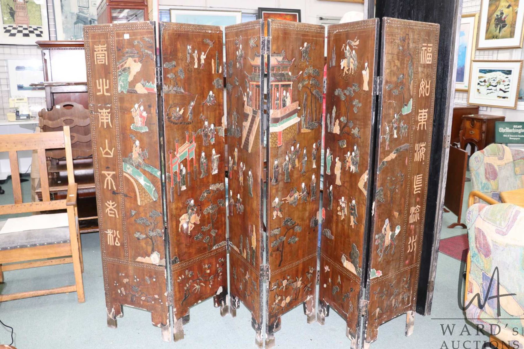 Antique Chinese Coromandel kuancai lacquered, six panel screen with inlaid ivory, mother-of-pearl, soapstone and jade, purportedly 18th century, each panel 61" X 15", note: some lifting and missing pieces. Canadian buyers only. Cannot ship outside Canada