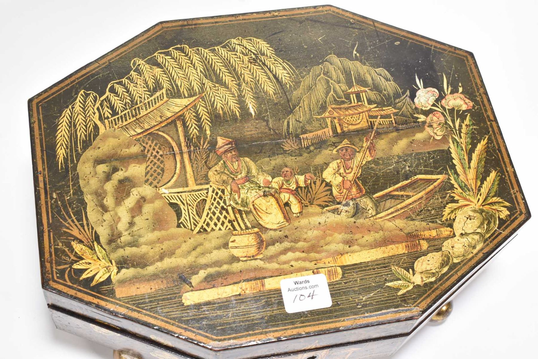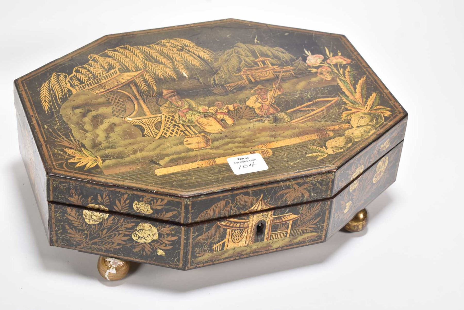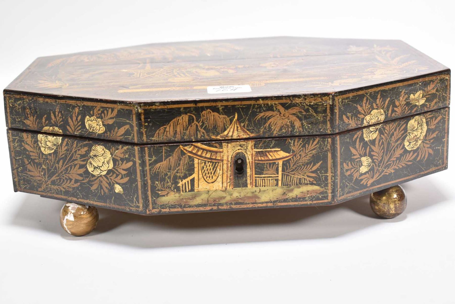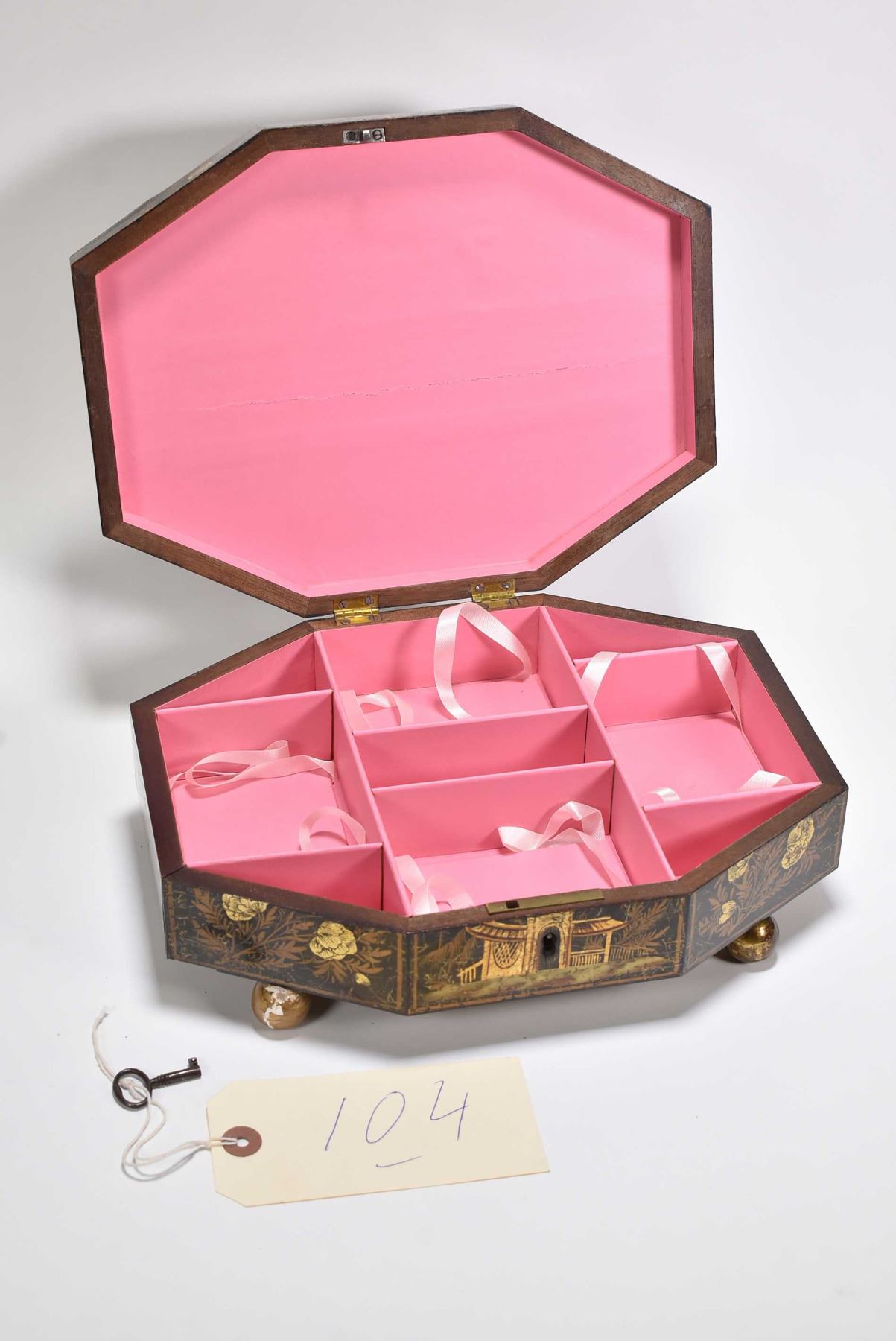 Antique Chinese lacquered and hand painted jewellery casket with original key, has been relined, 11" X 8 1/2"