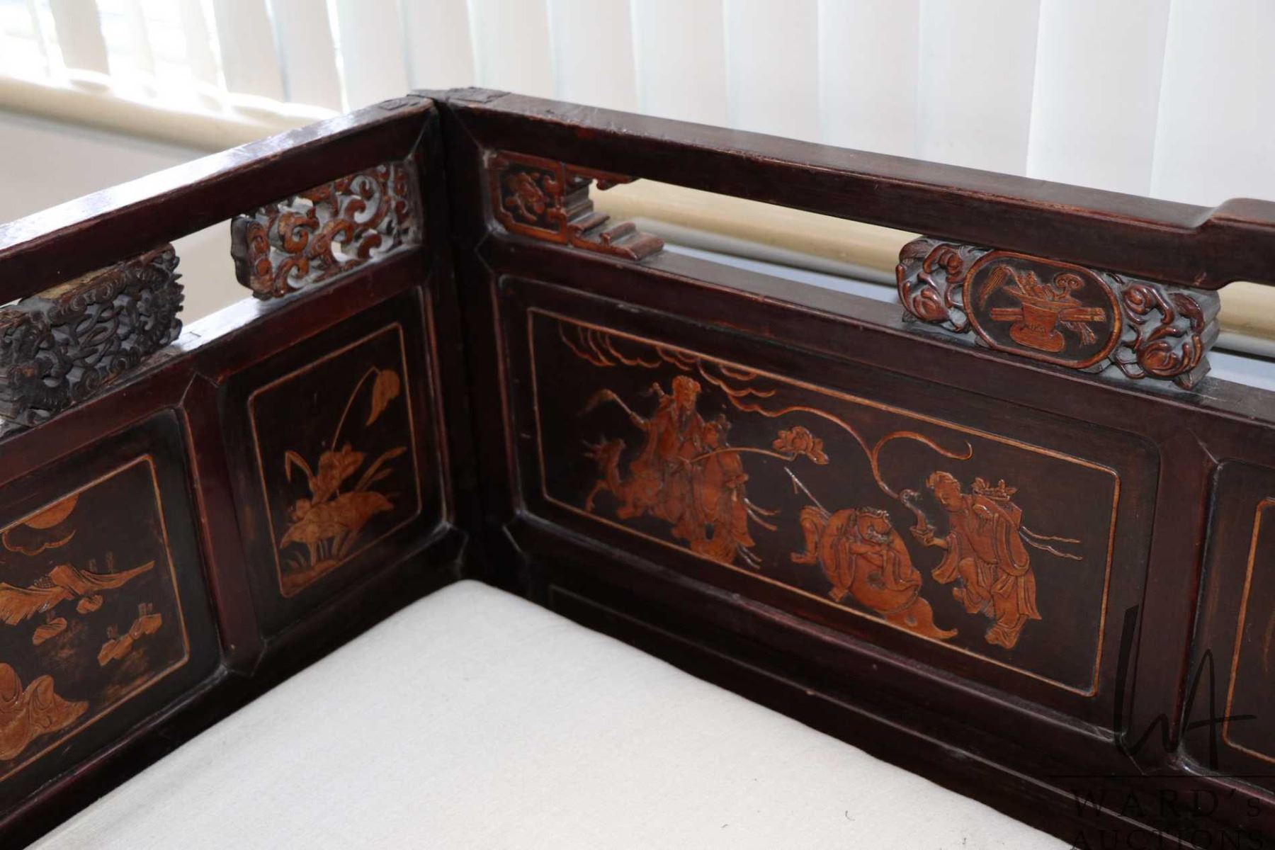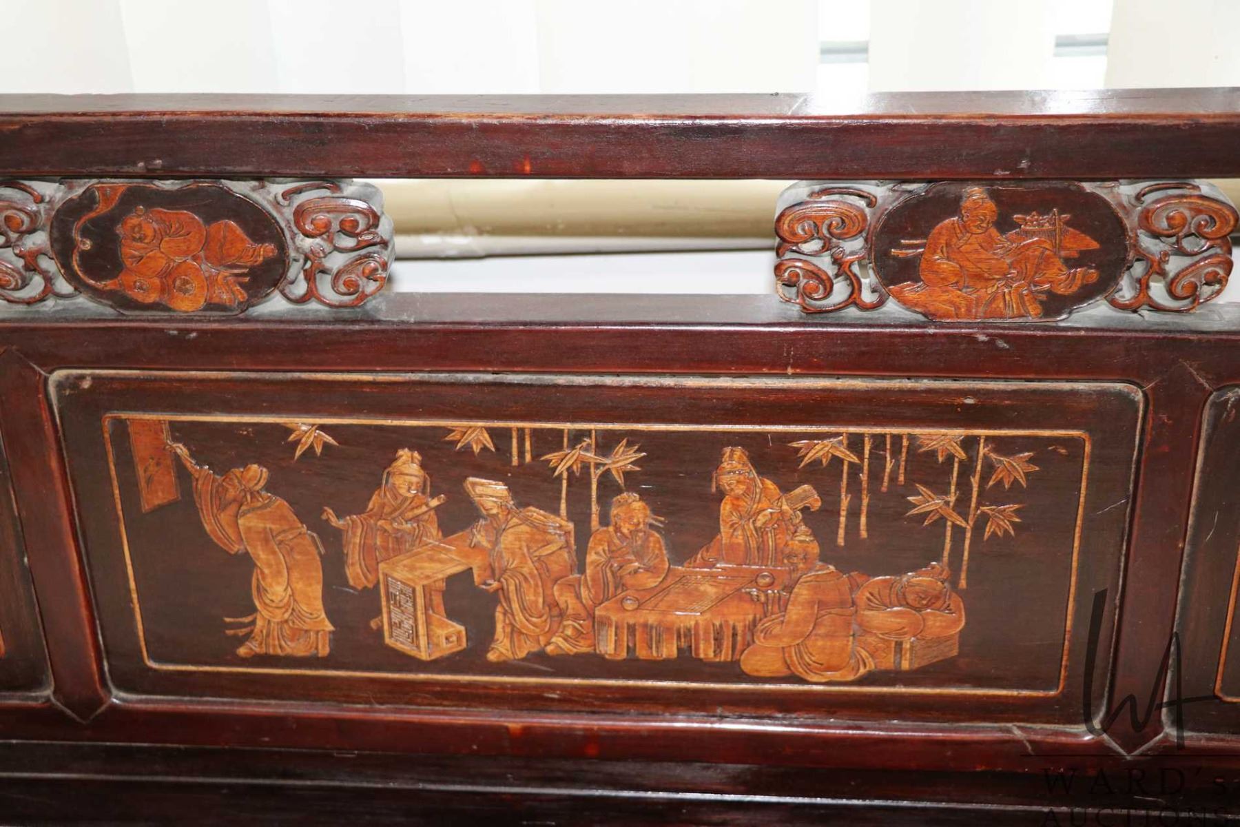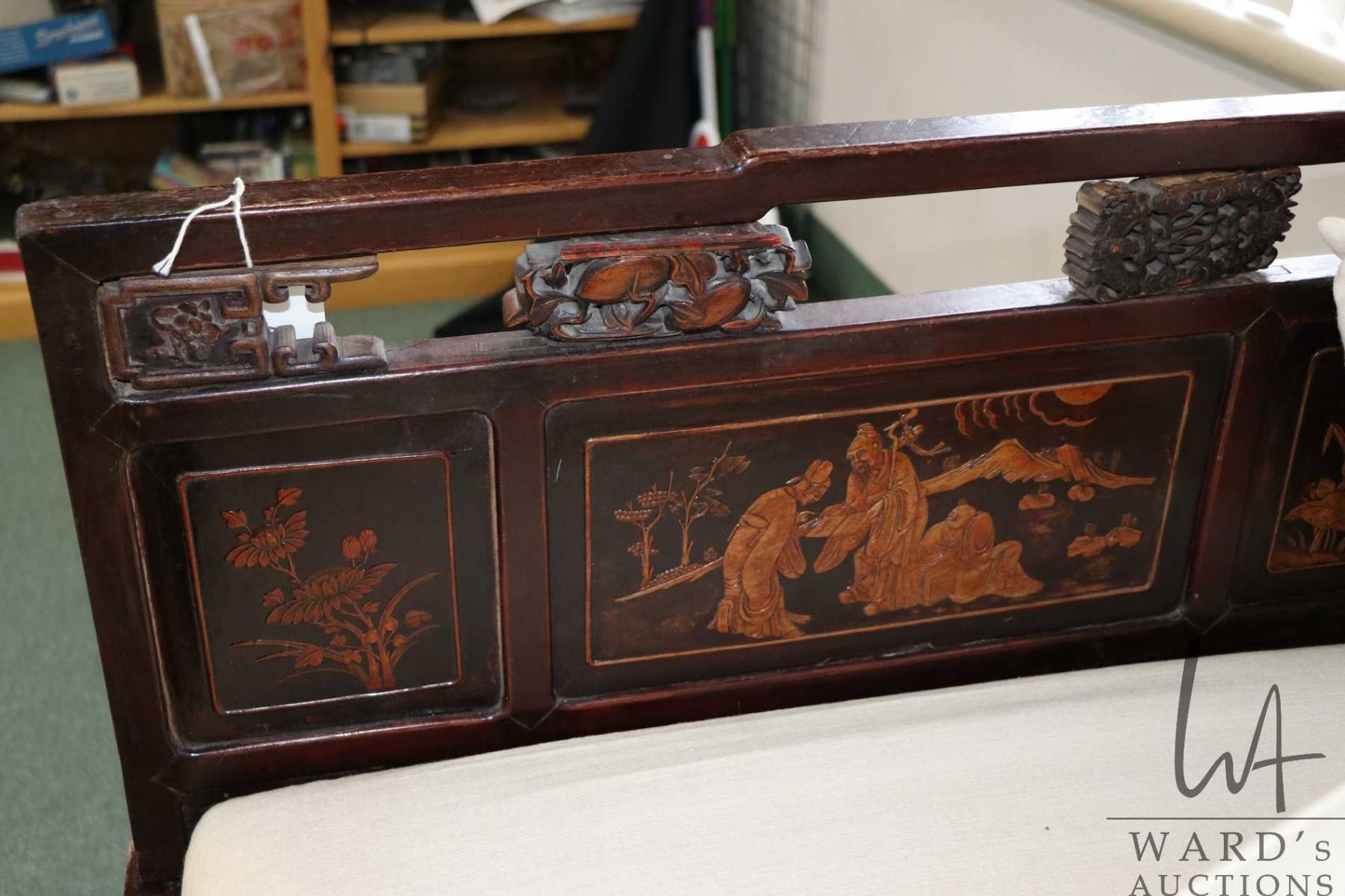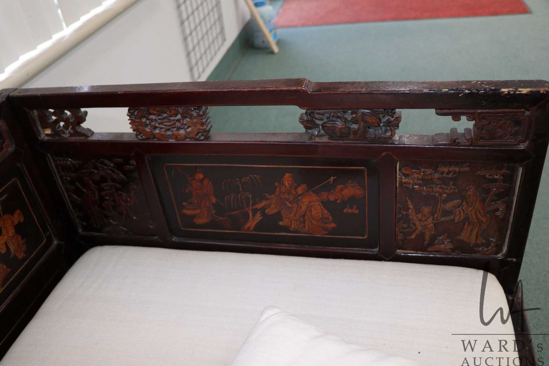 Antique Chinese opium bed with carved figural and floral panels, upholstered seat and pillow back, note some insert carvings need reattaching, appears complete, 79" X 35"