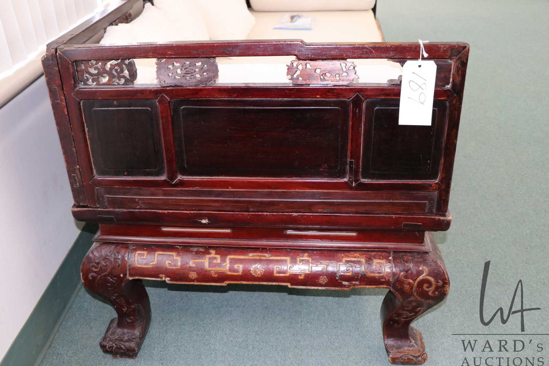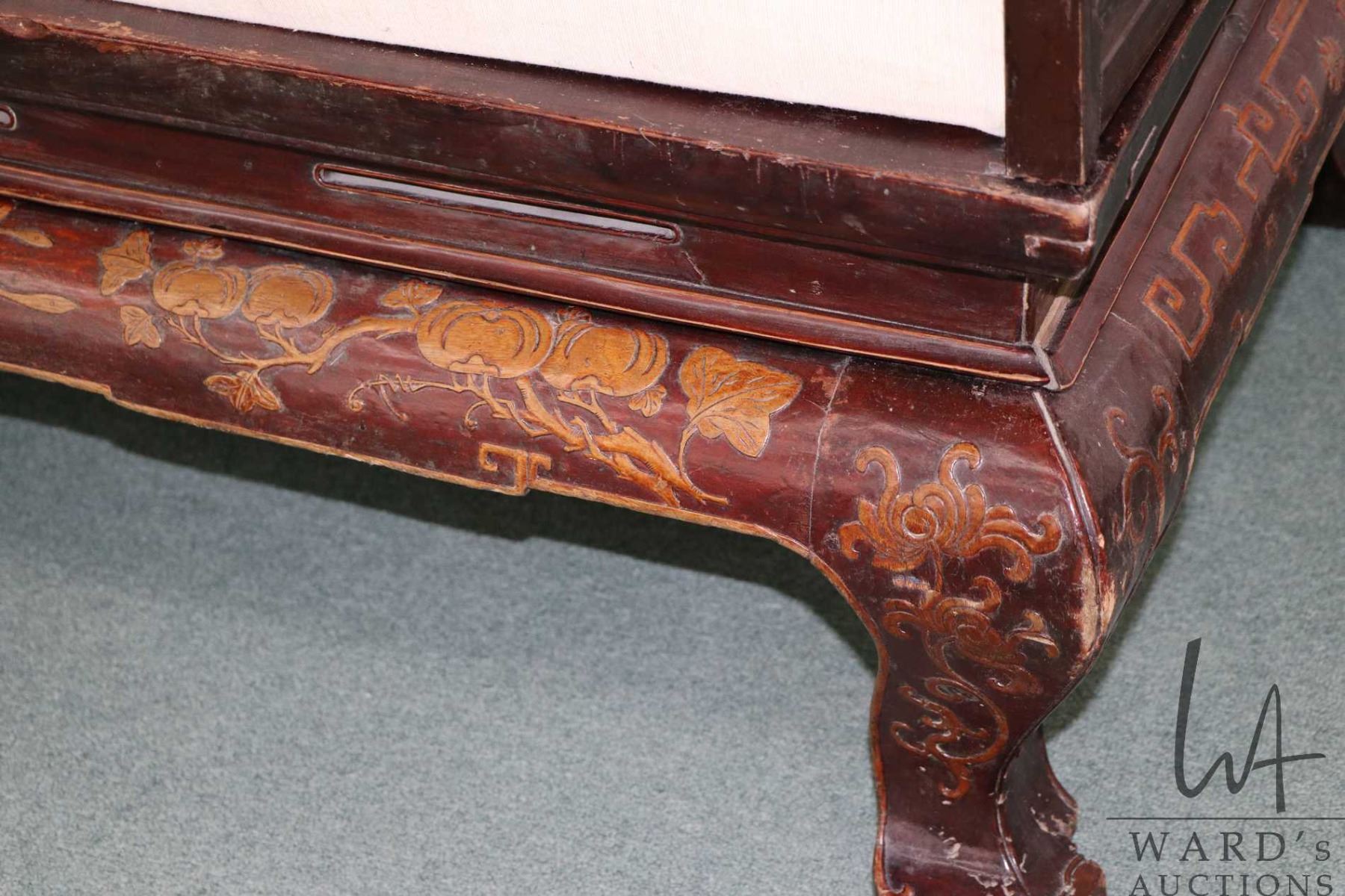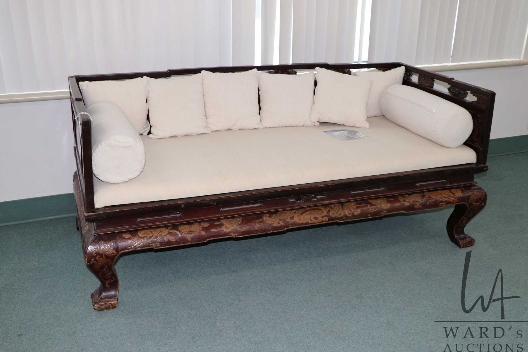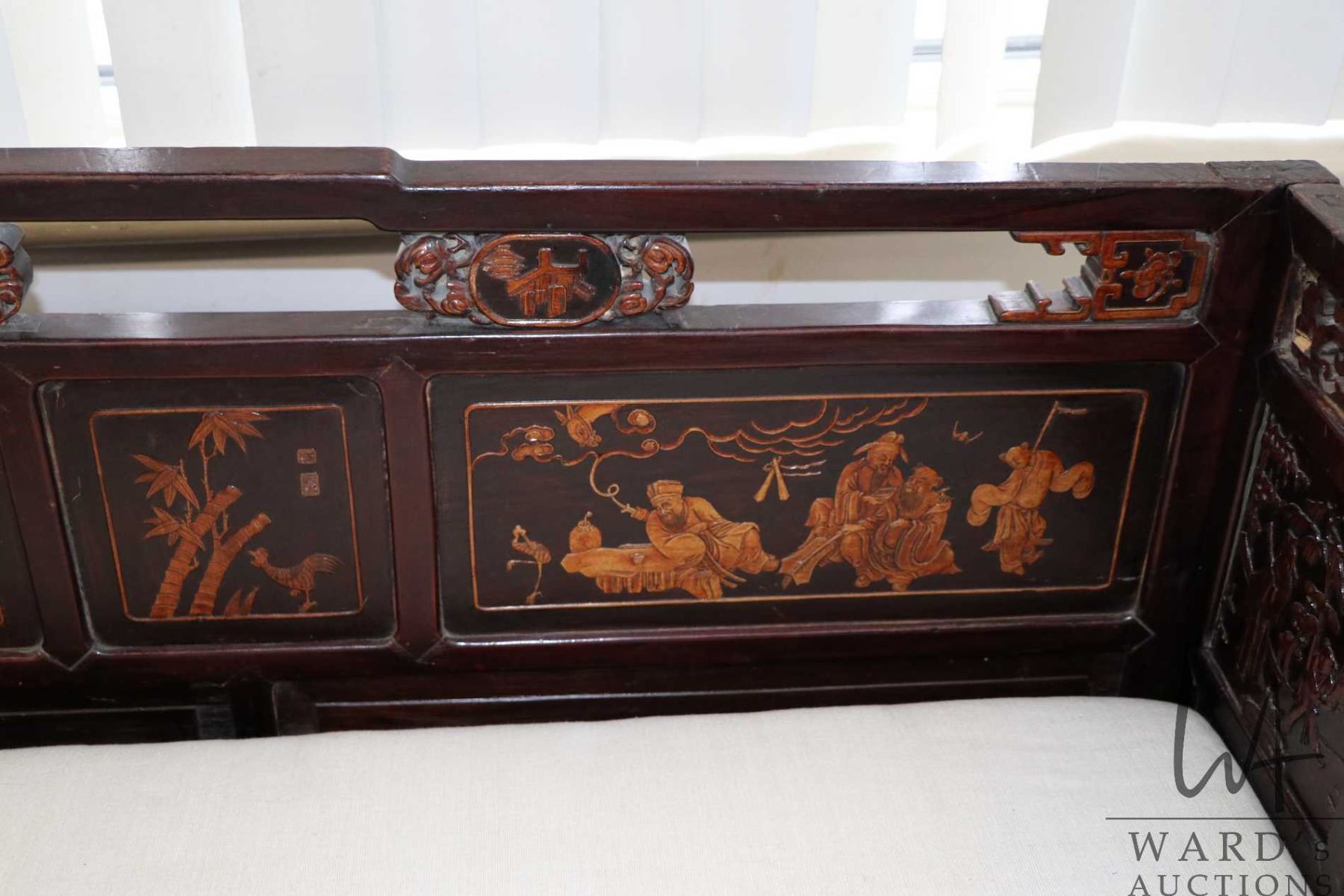 Antique Chinese opium bed with carved figural and floral panels, upholstered seat and pillow back, note some insert carvings need reattaching, appears complete, 79" X 35"