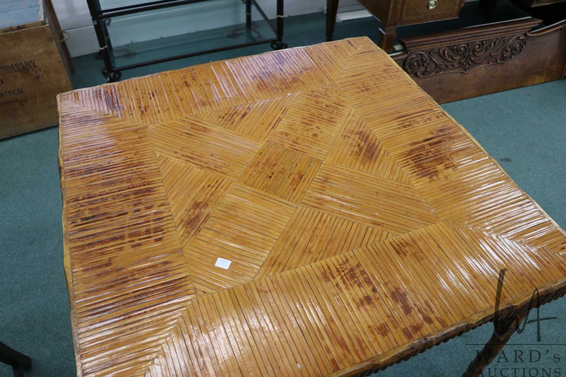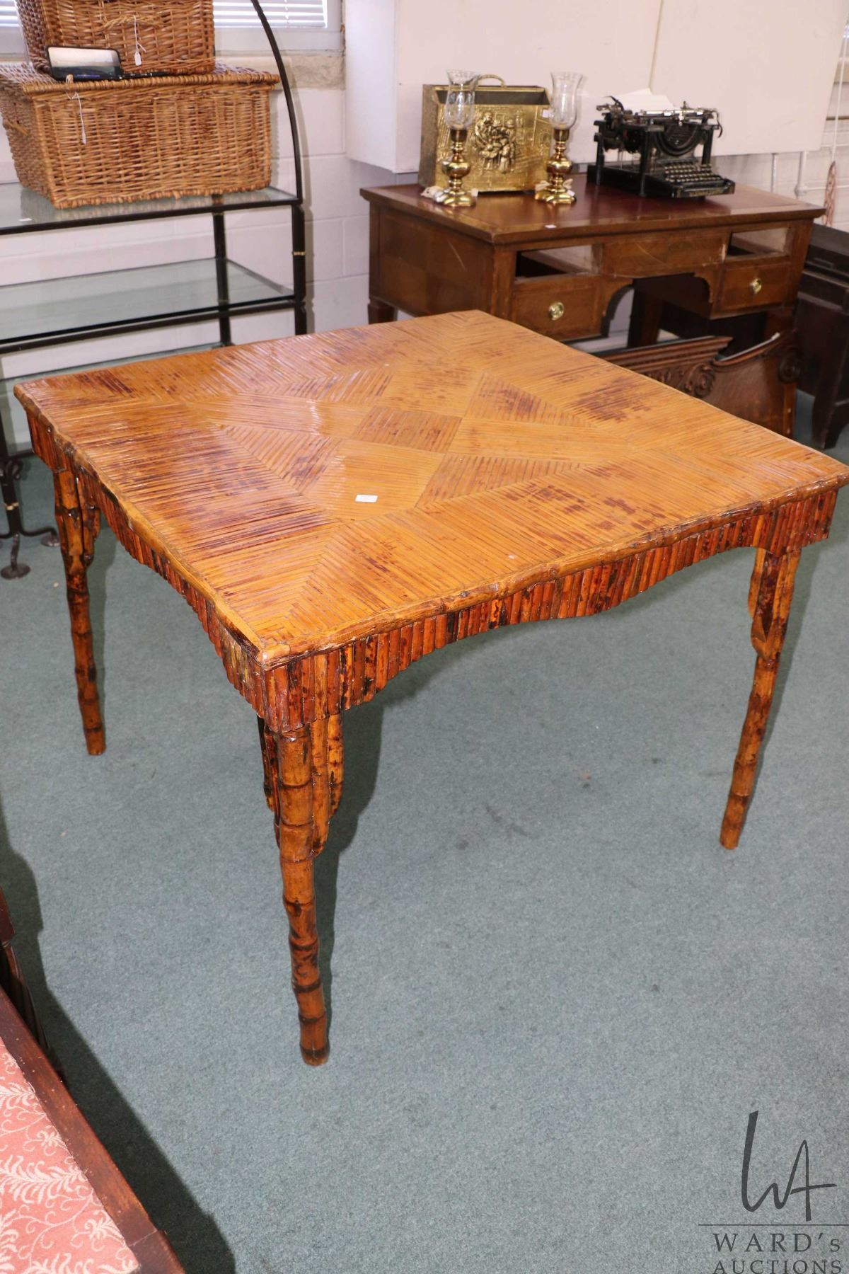 Antique Chinoserie style bamboo card table with parquet design top, 29" H X 36" square