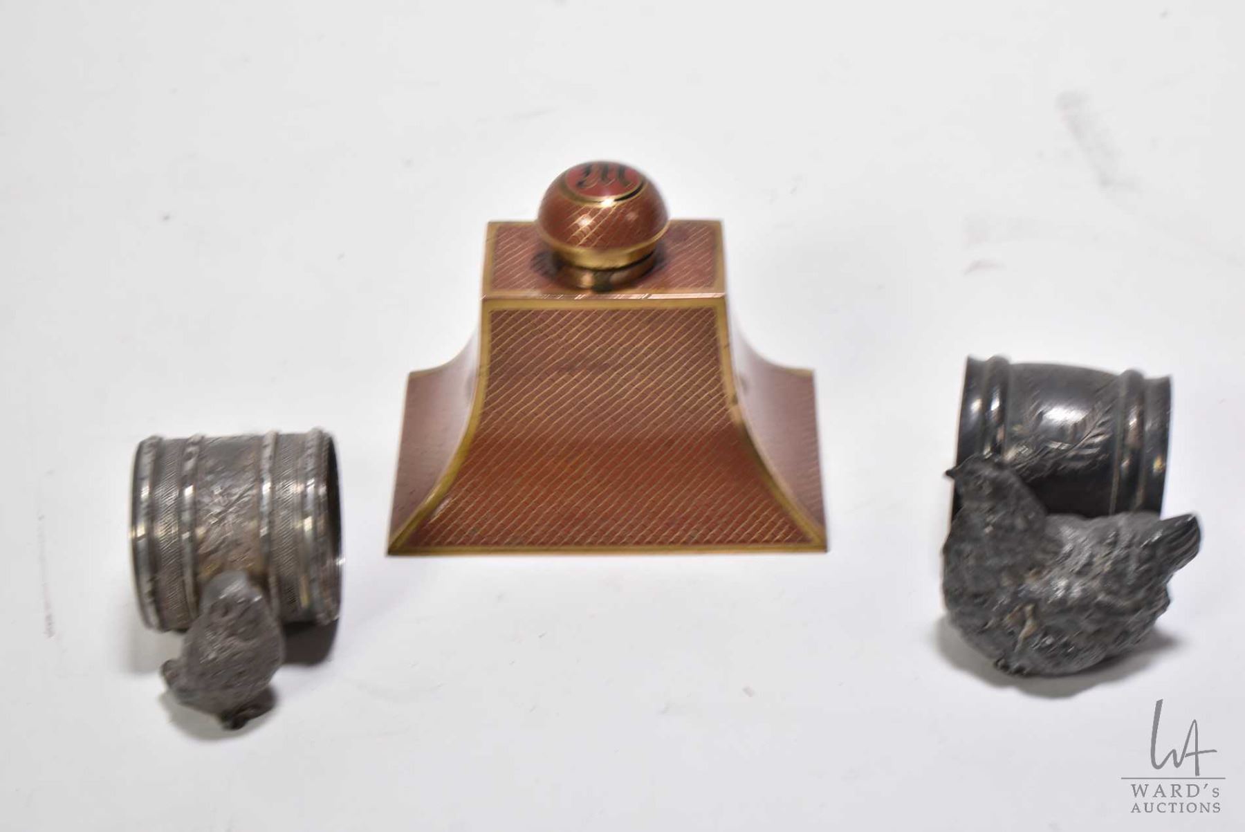 Antique Cloissone inkwell with initialled lid (M) 3 1/2" in height plus two antique silverplate chick motif napkin rings