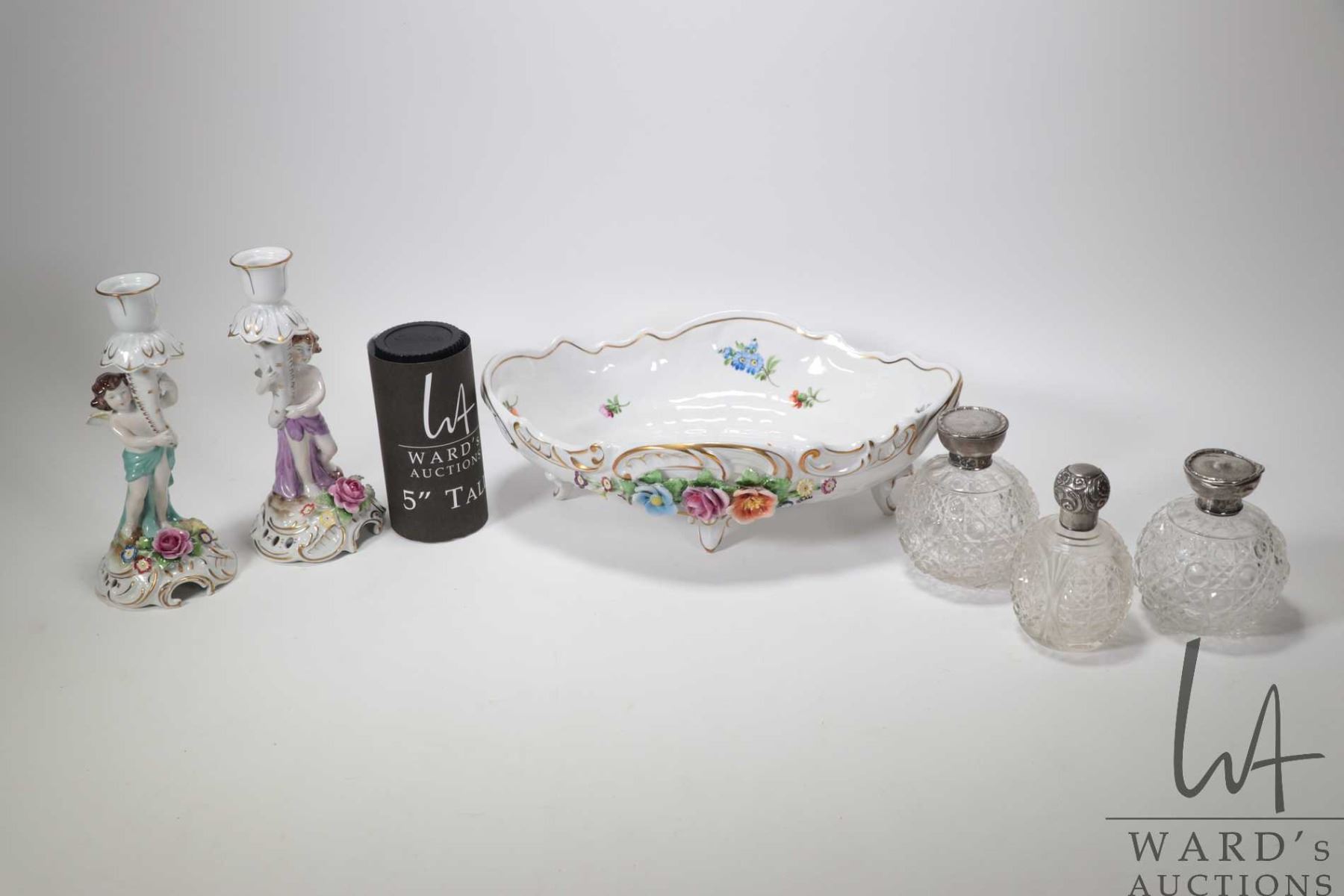 Antique Dresden footed center bowl 12 1/2" and a pair of matching candlestick, plus three antique crystal perfumes with sterling silver stops