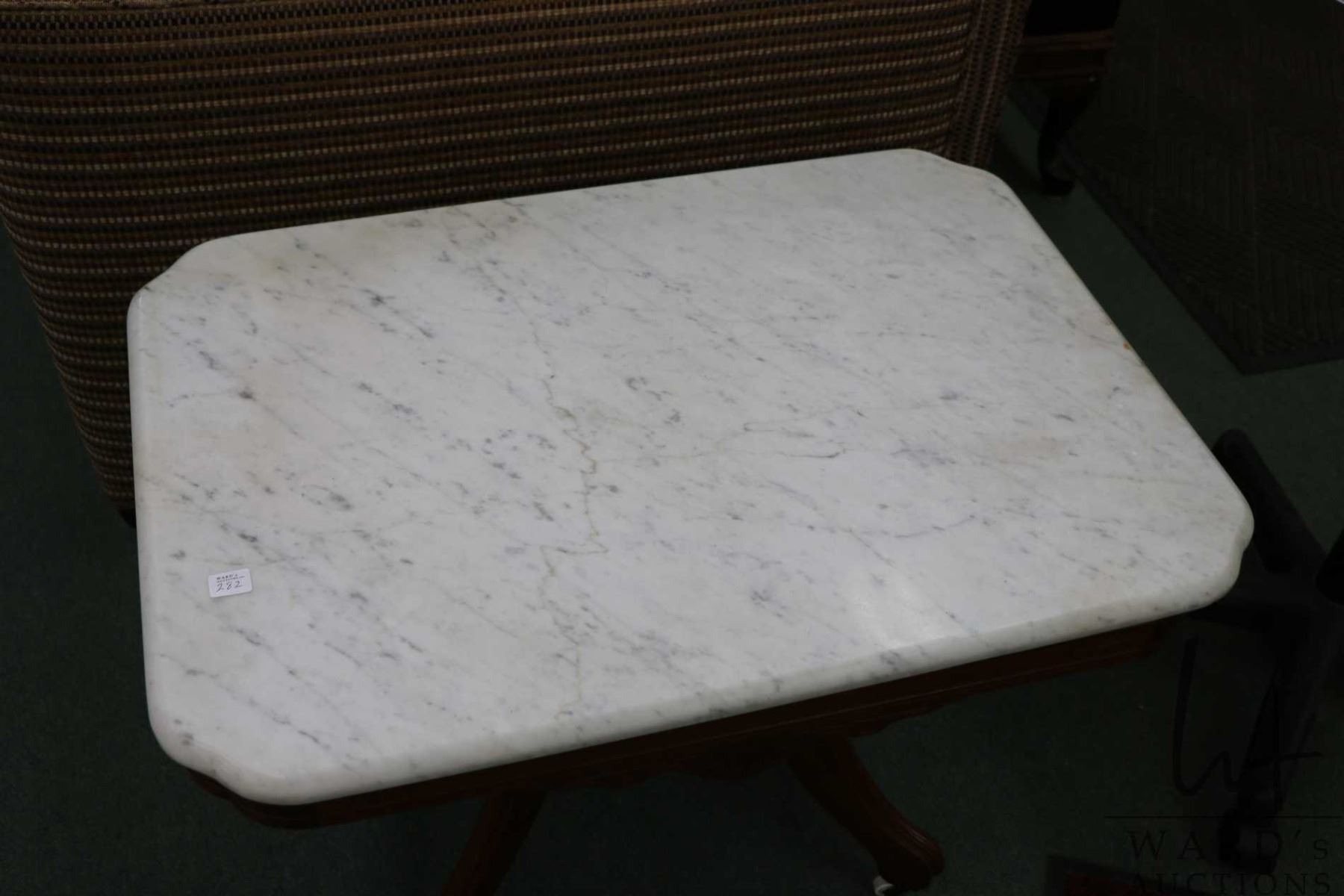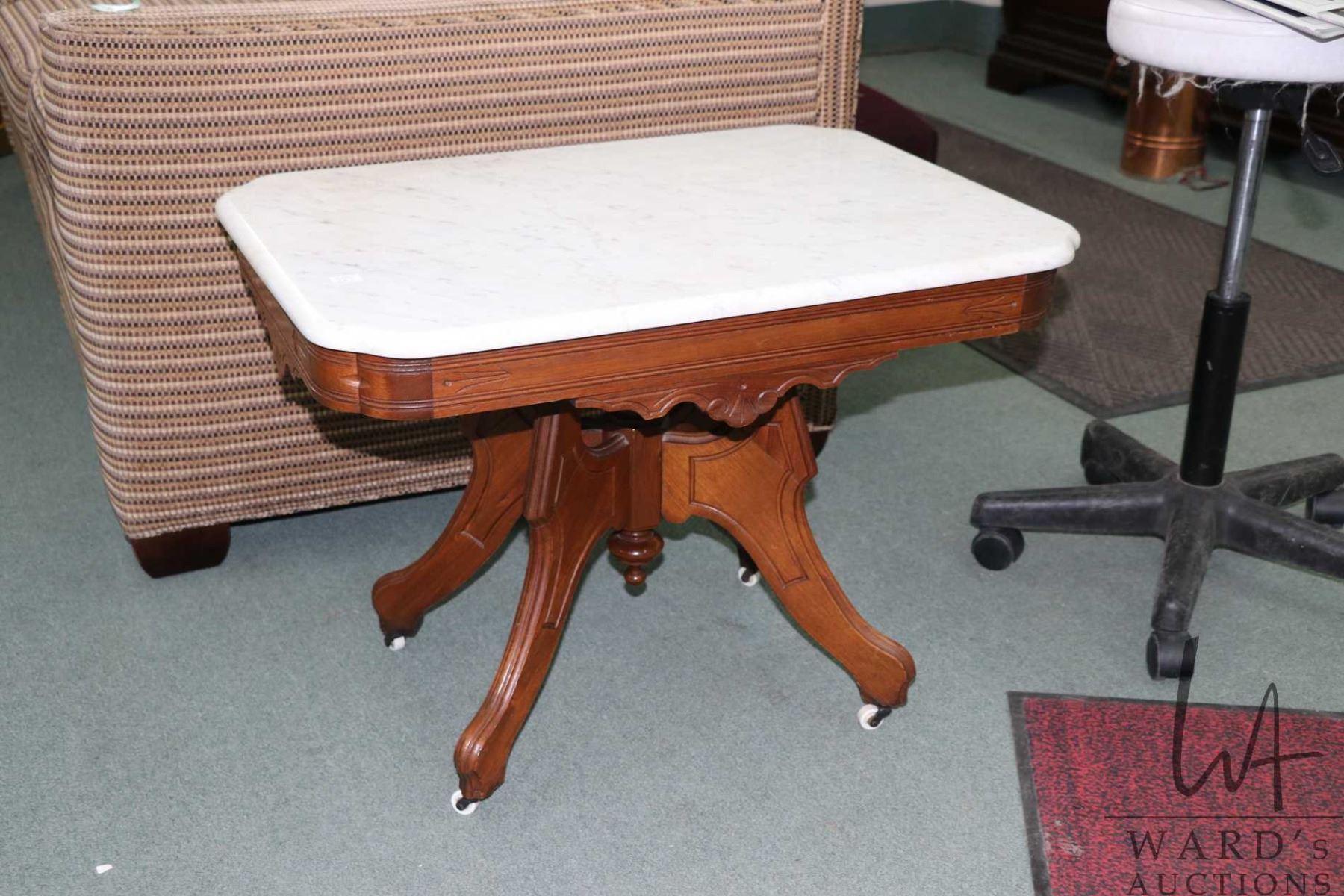 Antique Eastlake marble top coffee table with porcelain castors, 22" H X 29" X 20"