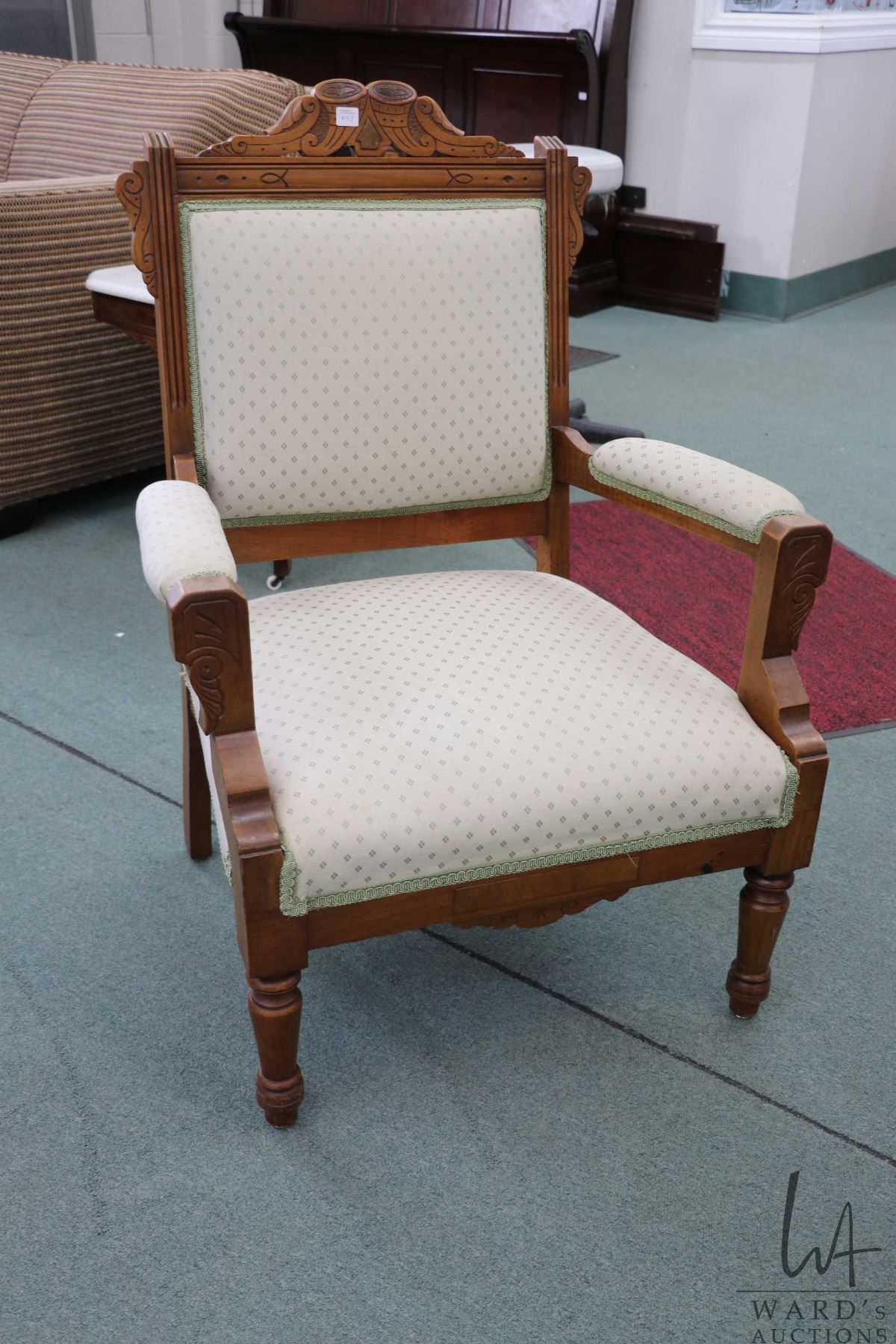 Antique Eastlake open arm parlour chair with carved back and low seat height 14"