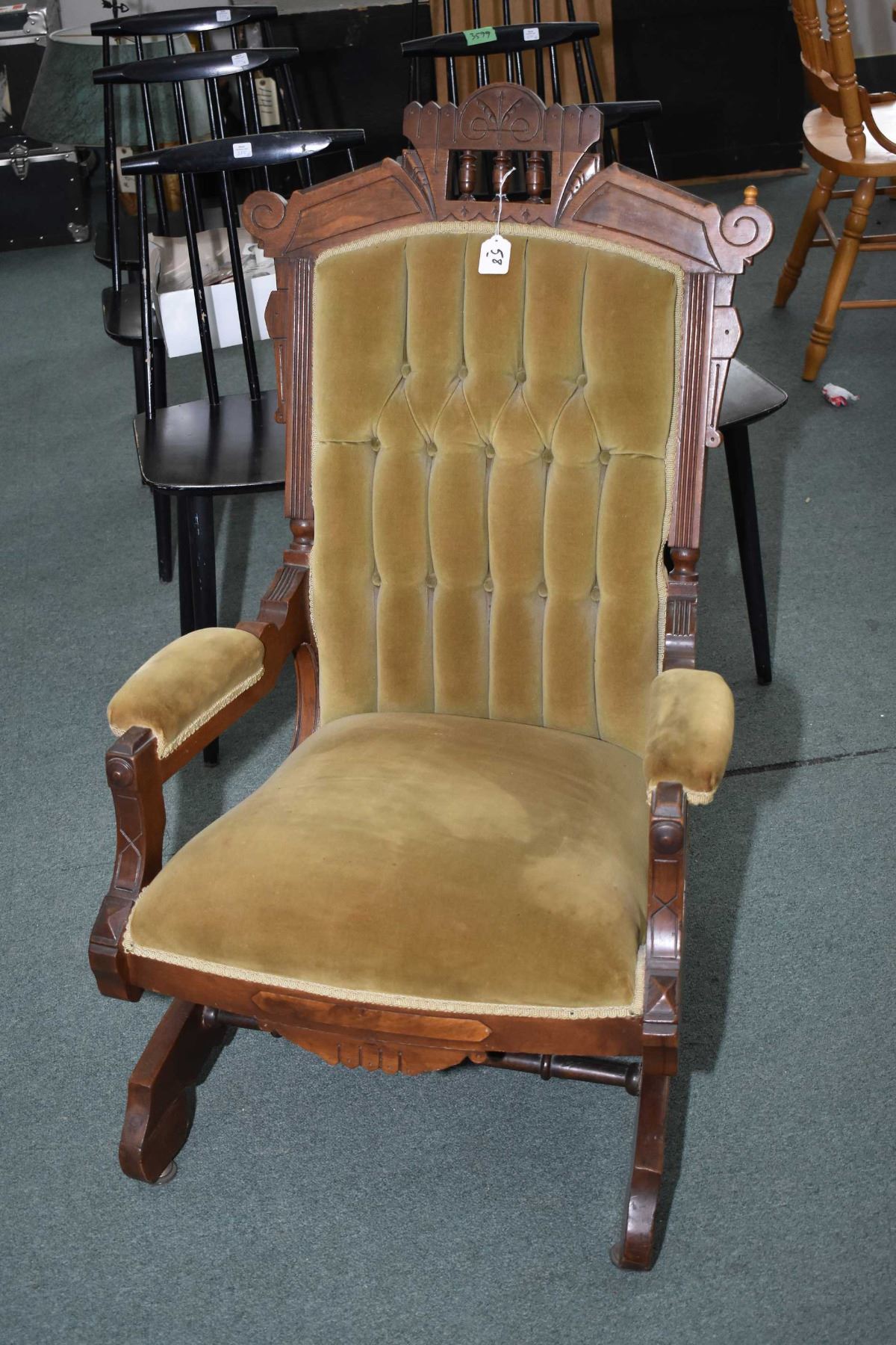 Antique Eastlake platform rocker with button tufted upholstery and open arms
