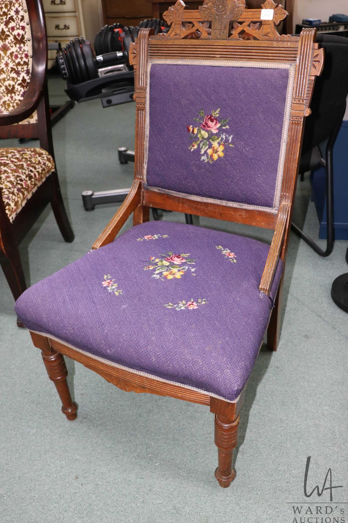 Antique Eastlake side chair with decorative wood and needle point upholstry