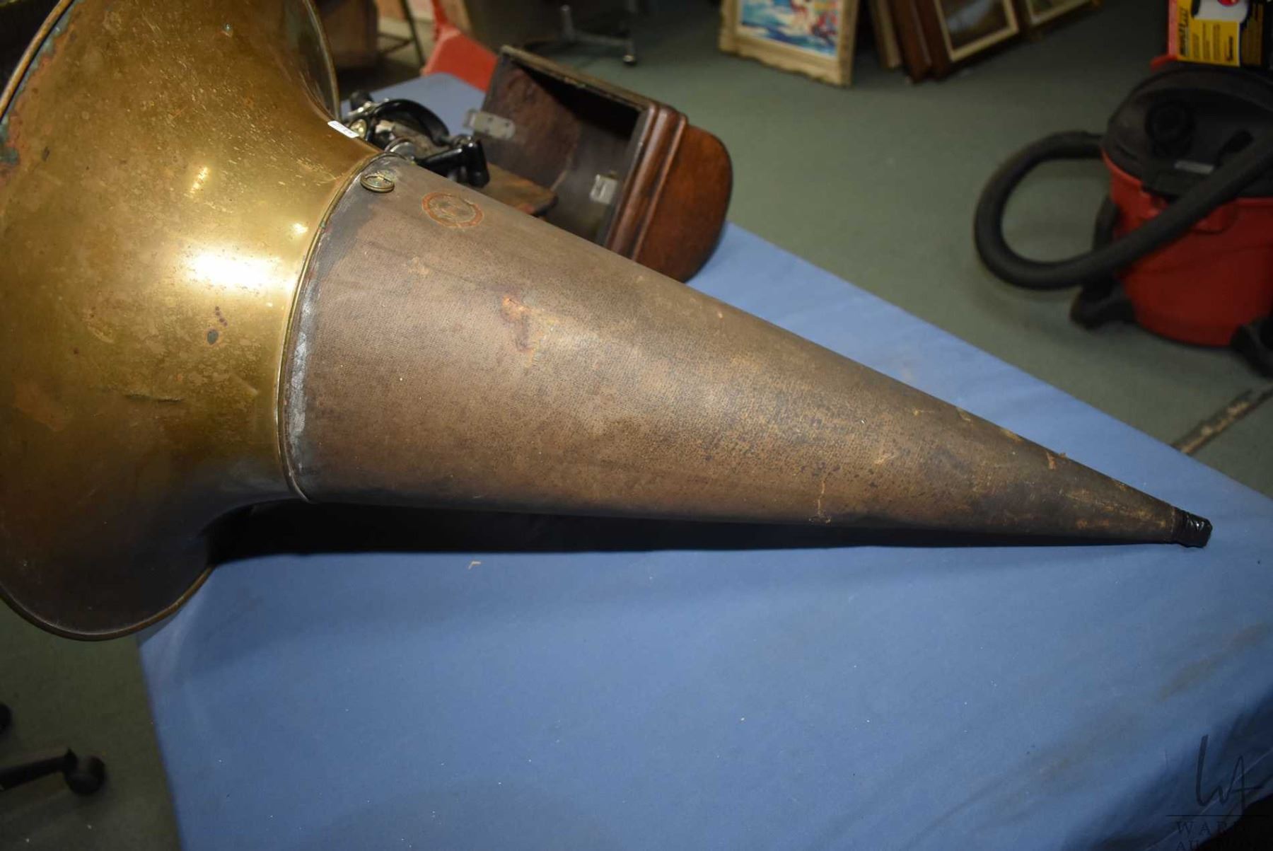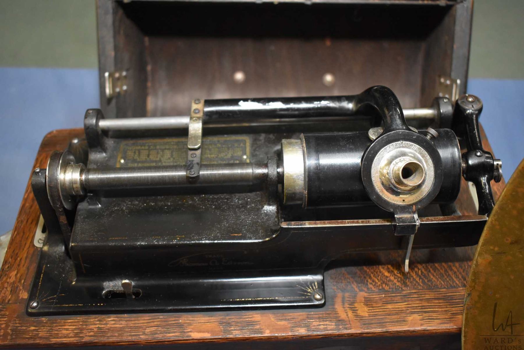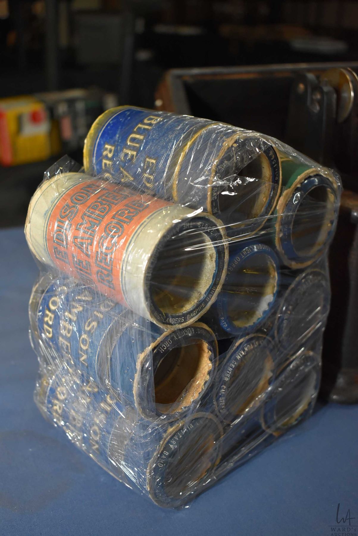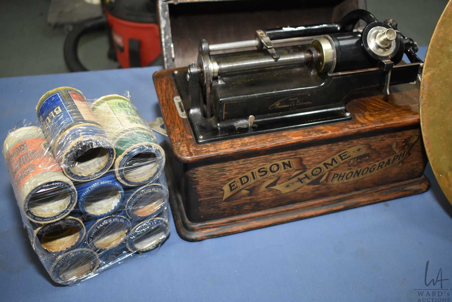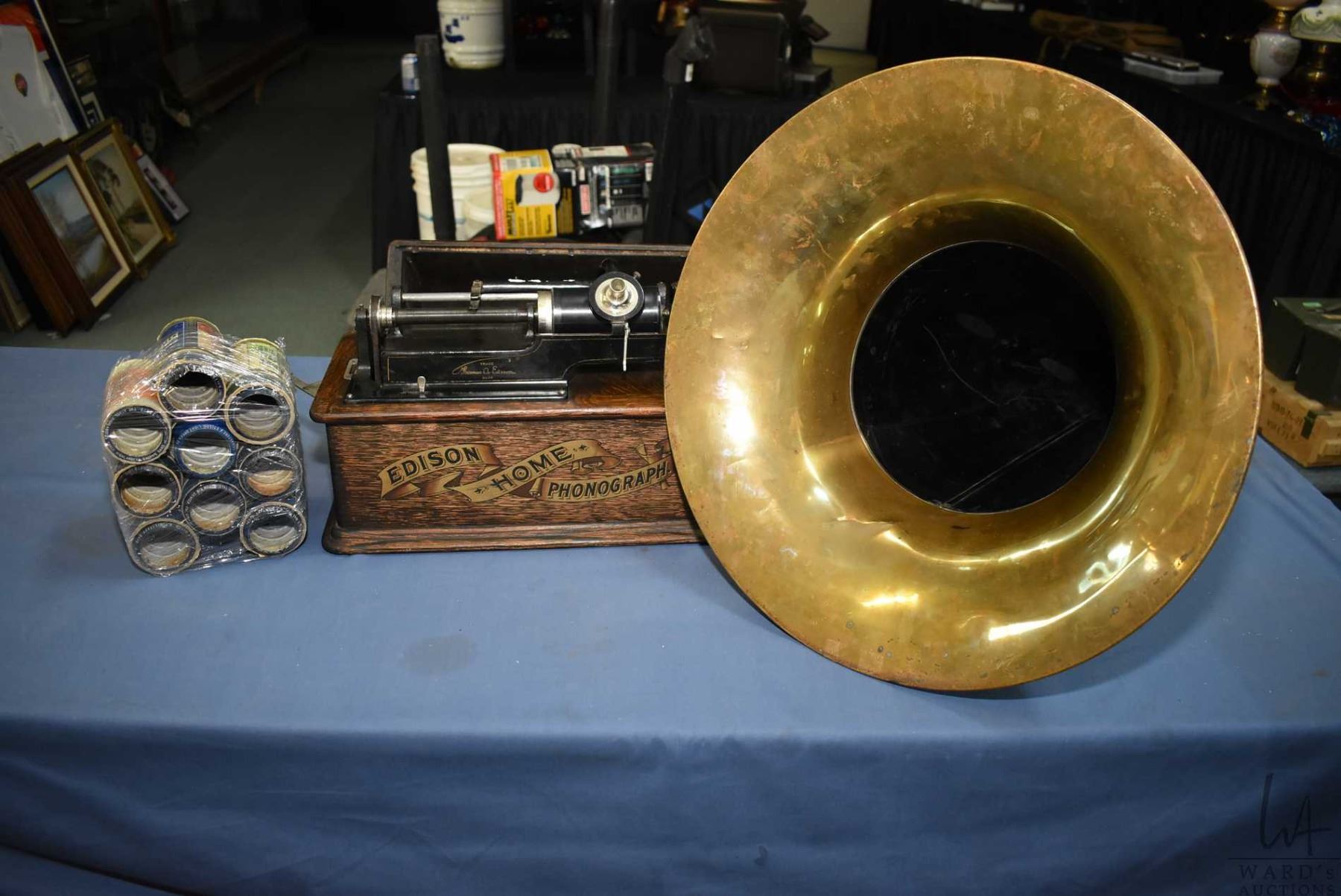 Antique Edison Home phonograph, serial no. H205444 with ten wax cylinders and large external horn marked Silk Finish Horn, note missing bracket to attach to phonograph. Note: This lot cannot be shipped. Local pickup only