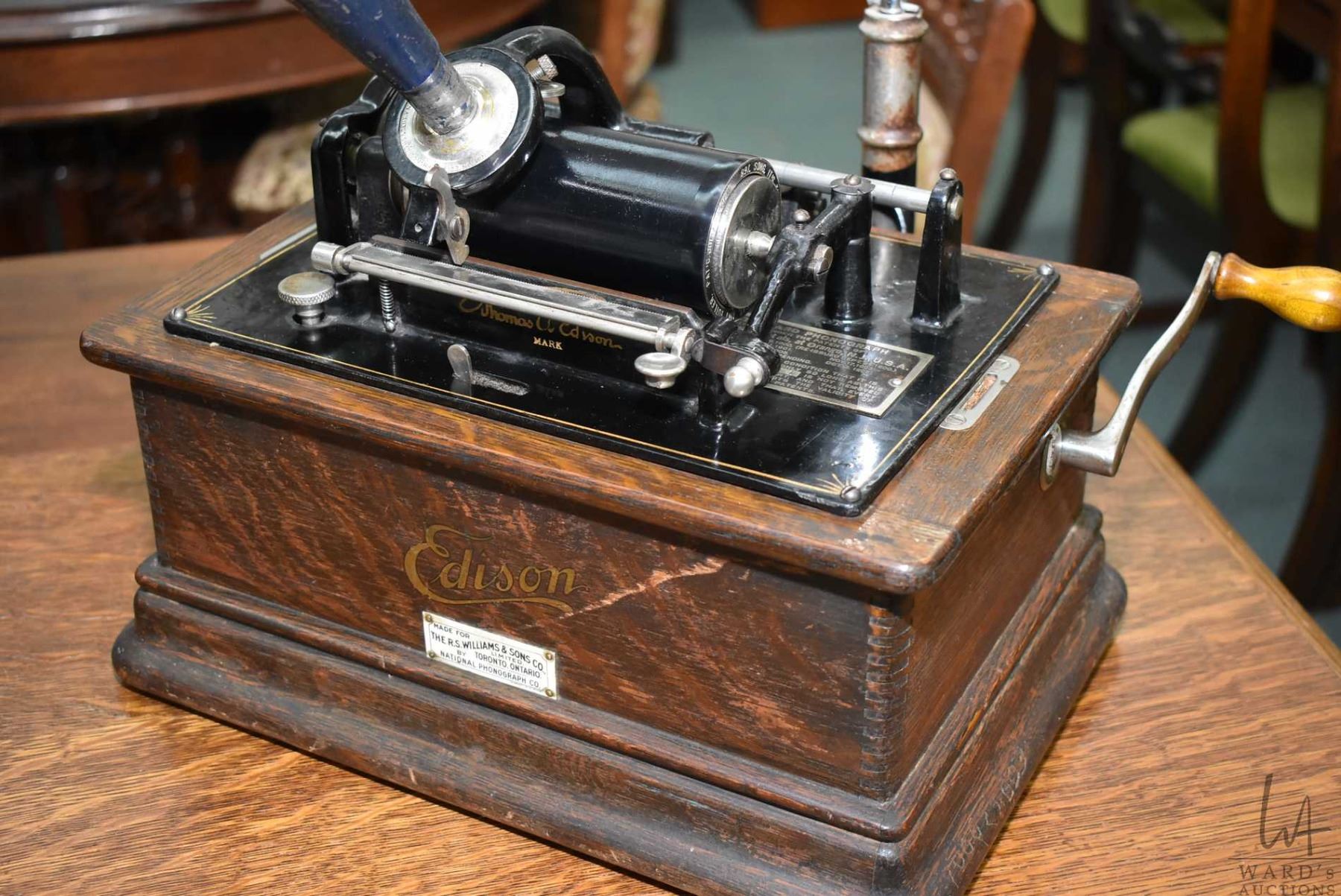 Antique Edison Standard phonograph, serial no. 492541 marked "Made for the R.S. Williams & Sons, Toronto Ontario by National Phonograph Company", complete with Thomas Edison Standard external horn with handpainted blossoms, includes 10 wax cylinder, working at time of cataloguing