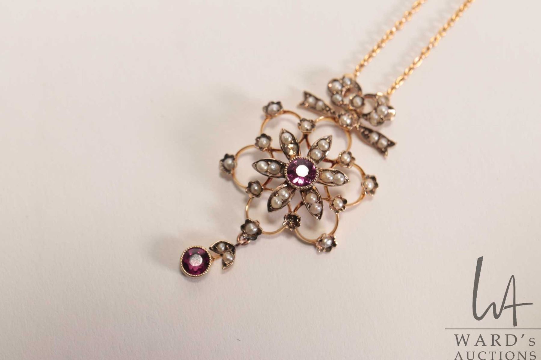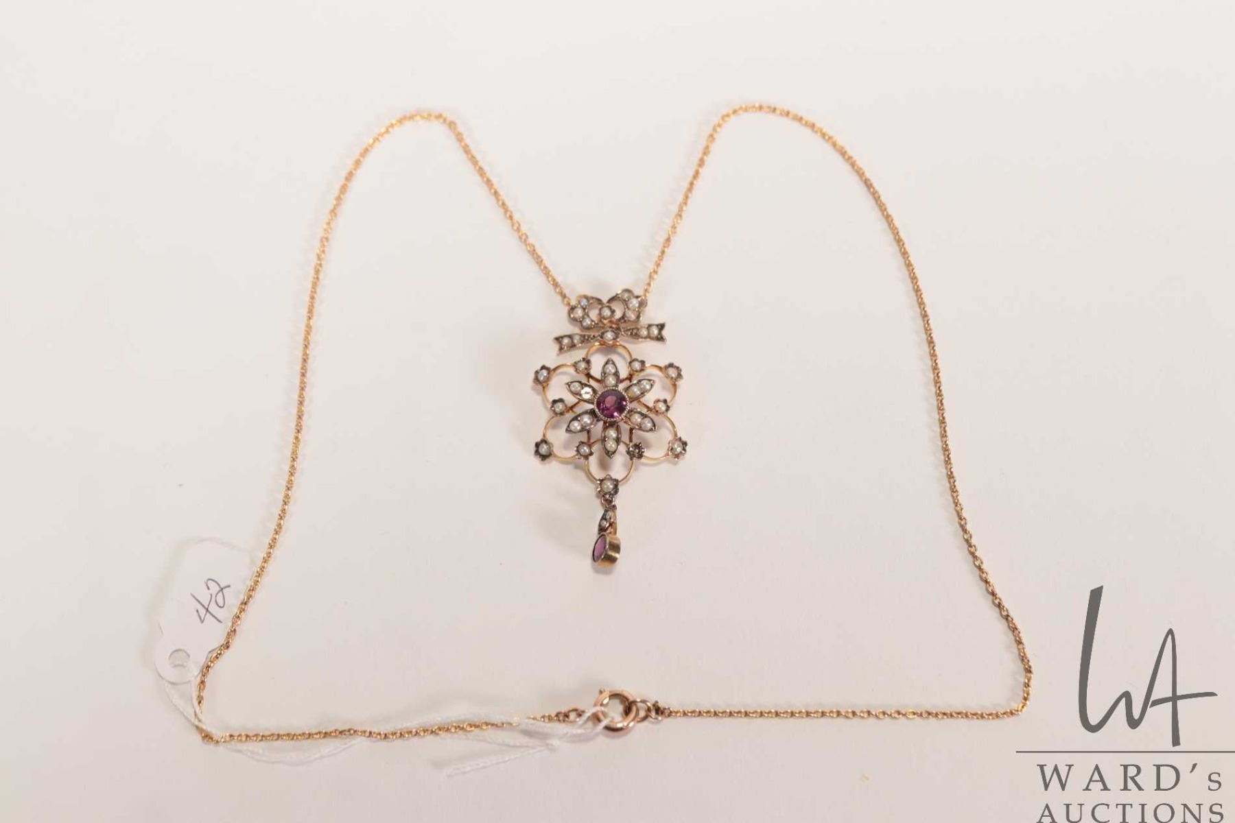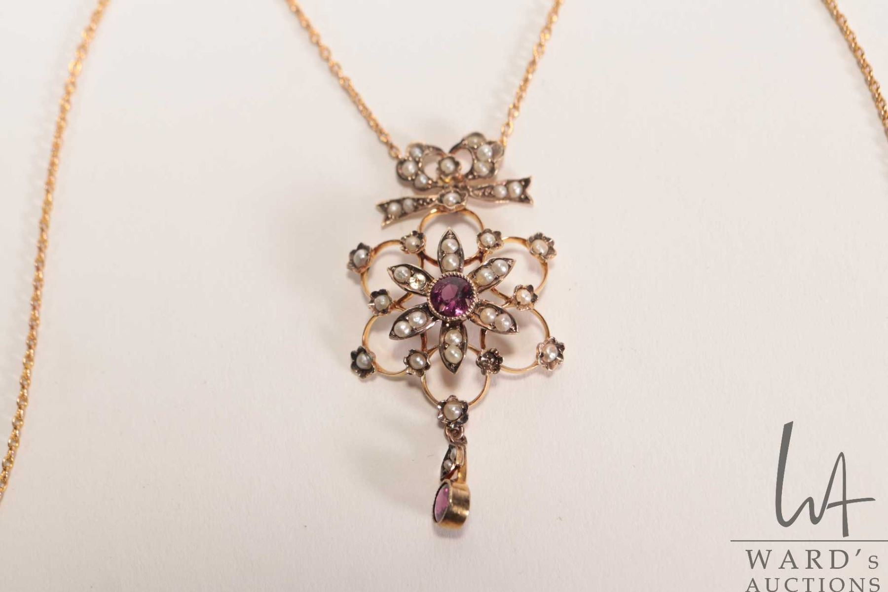 Antique English pearl and amethyst Victorian lavaliere marked 9ct on attached 20" unmarked neck chain