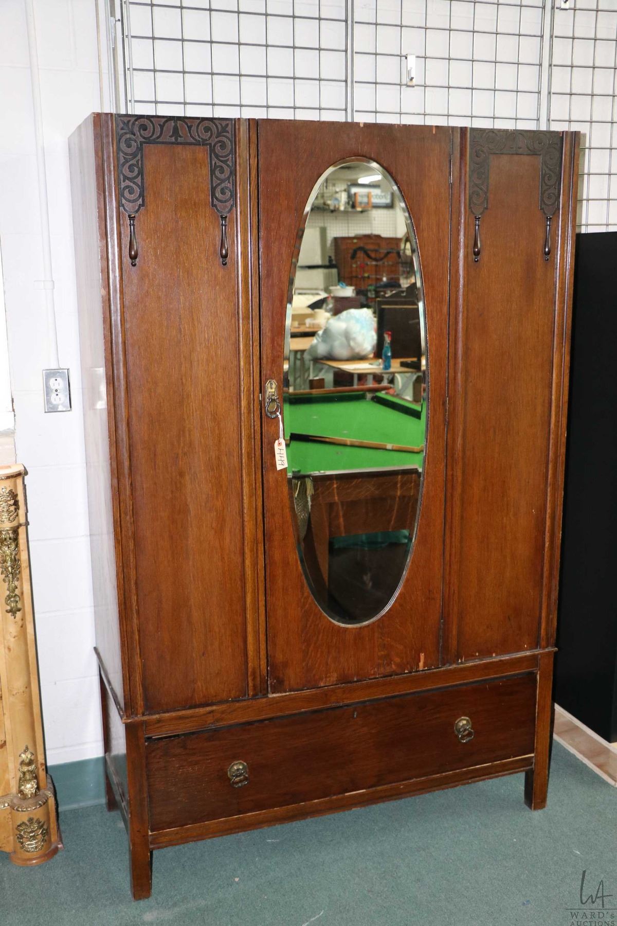 Antique English quarter cut oak, single door, single drawer wardrobe with bevelled glass mirror, not