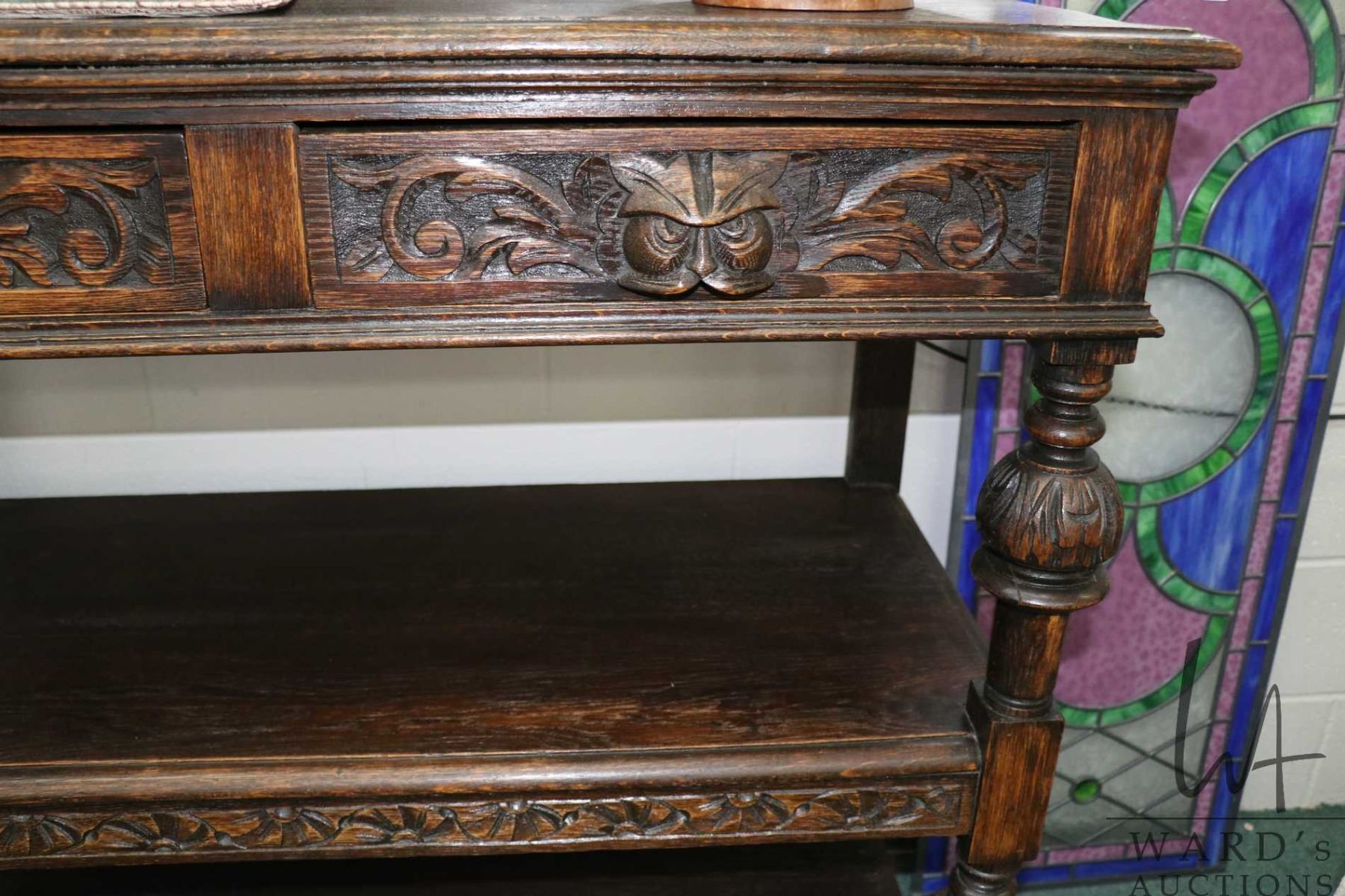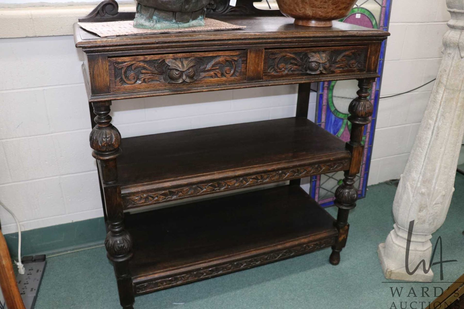 Antique European quarter cut oak server with two tiered base and two carved front drawers featuring Green Man pulls and backboard, 48" H X 42" W X 20" D
