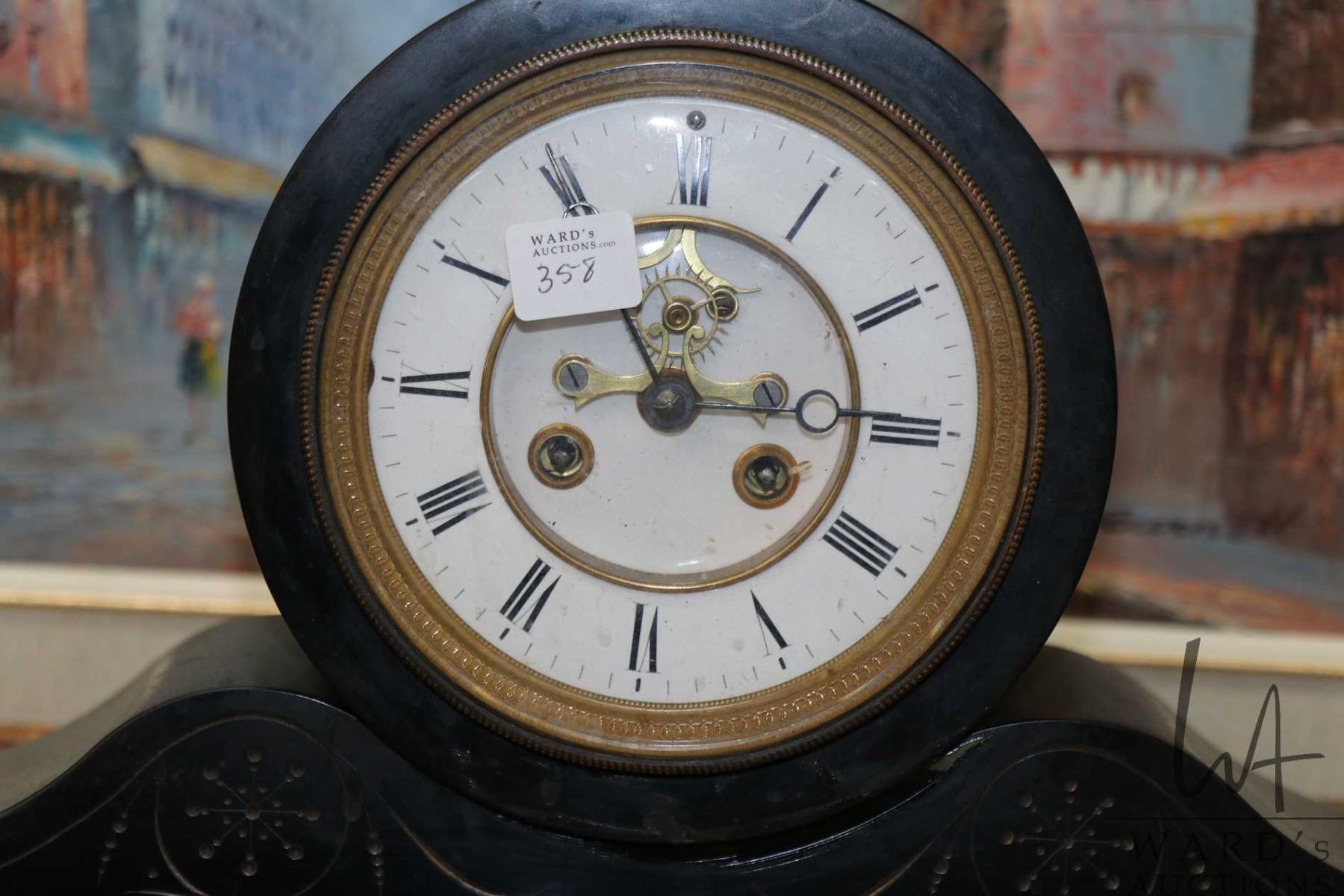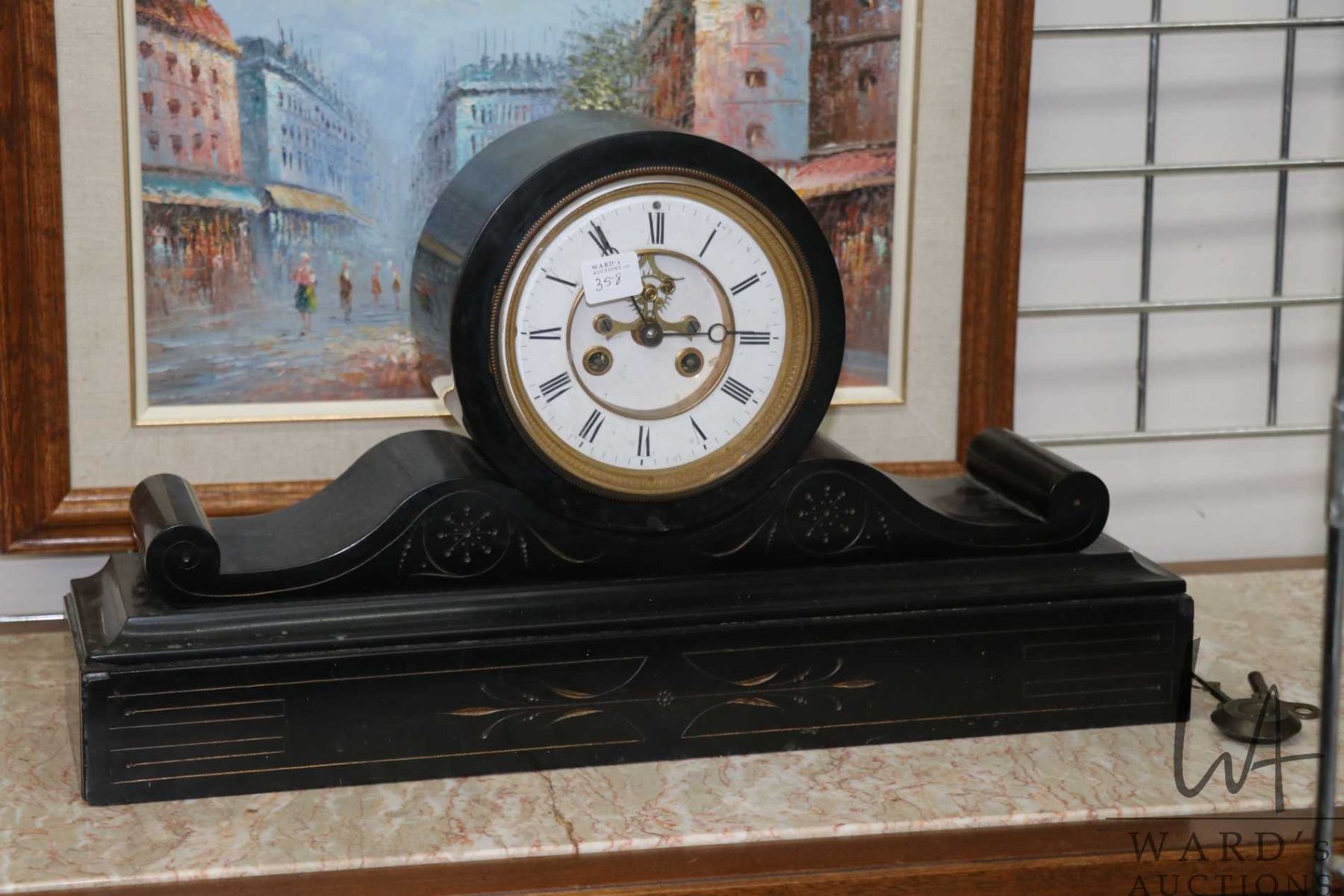 Antique French slate mantle clock with brass hardware, white enamel face and Roman numerals, note: not working at time of cataloguing, pendulum hanger is broke off, pendulum included, 11" H X 20" L
