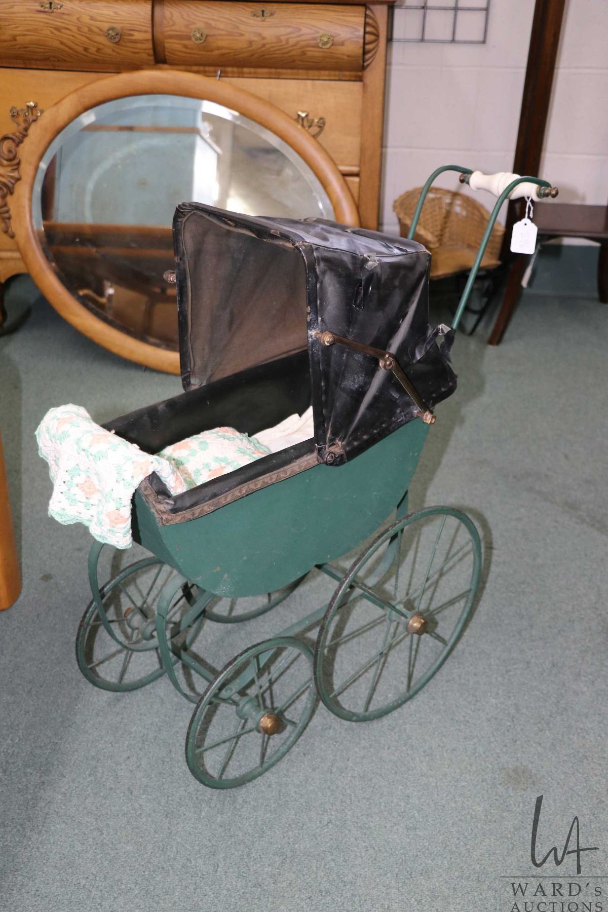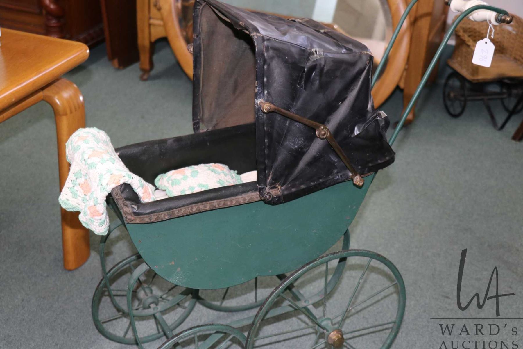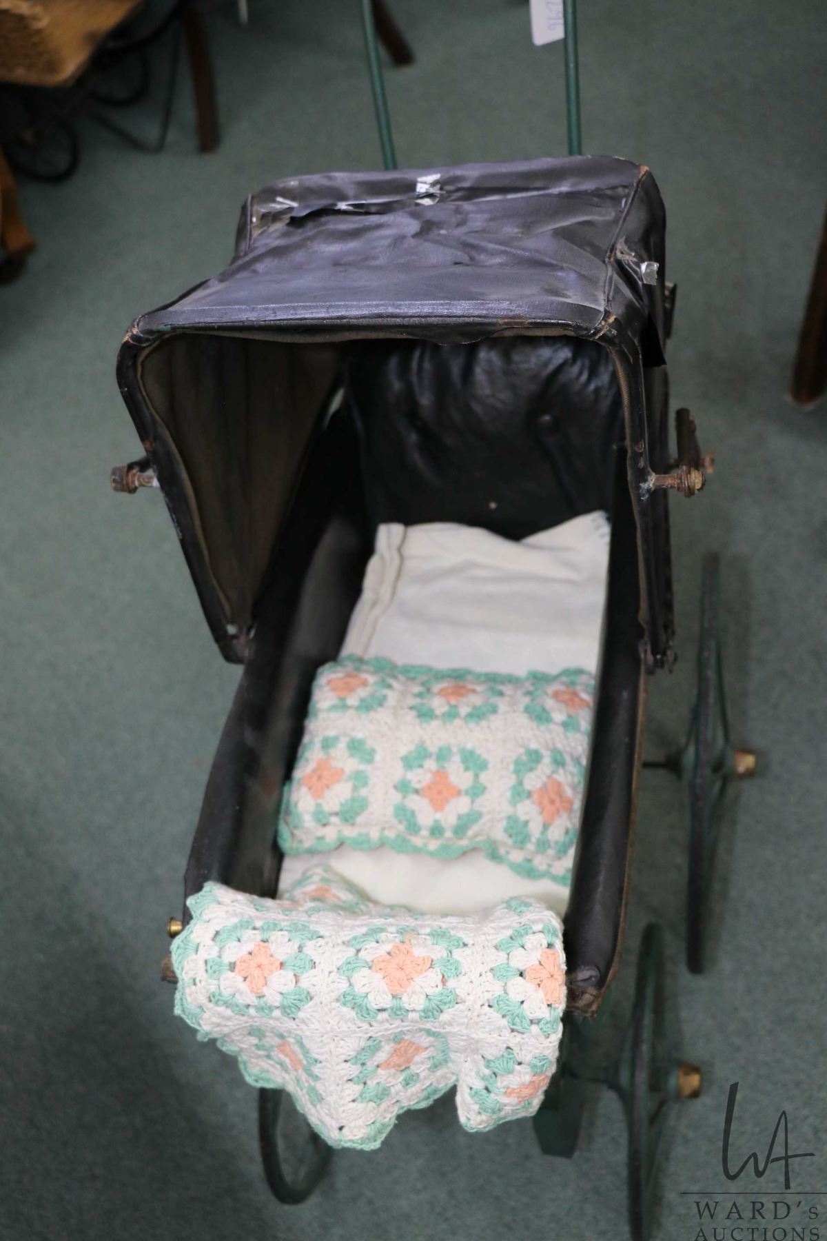 Antique G & J Lines, London doll pram with leather lining and bonnet, 25" to top of handle