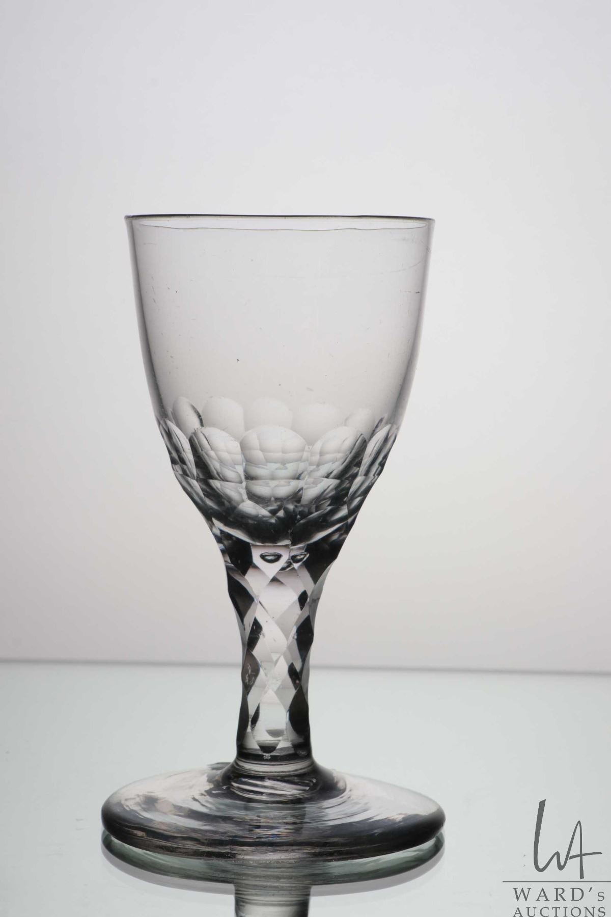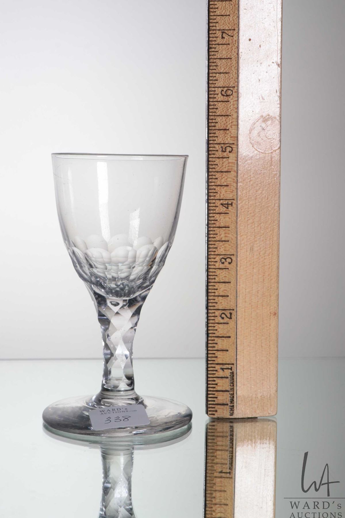 Antique Georgain cordial glass with polished, faceted stem and etched petal engraved bowl, circa mid 1700's, 12cm in height