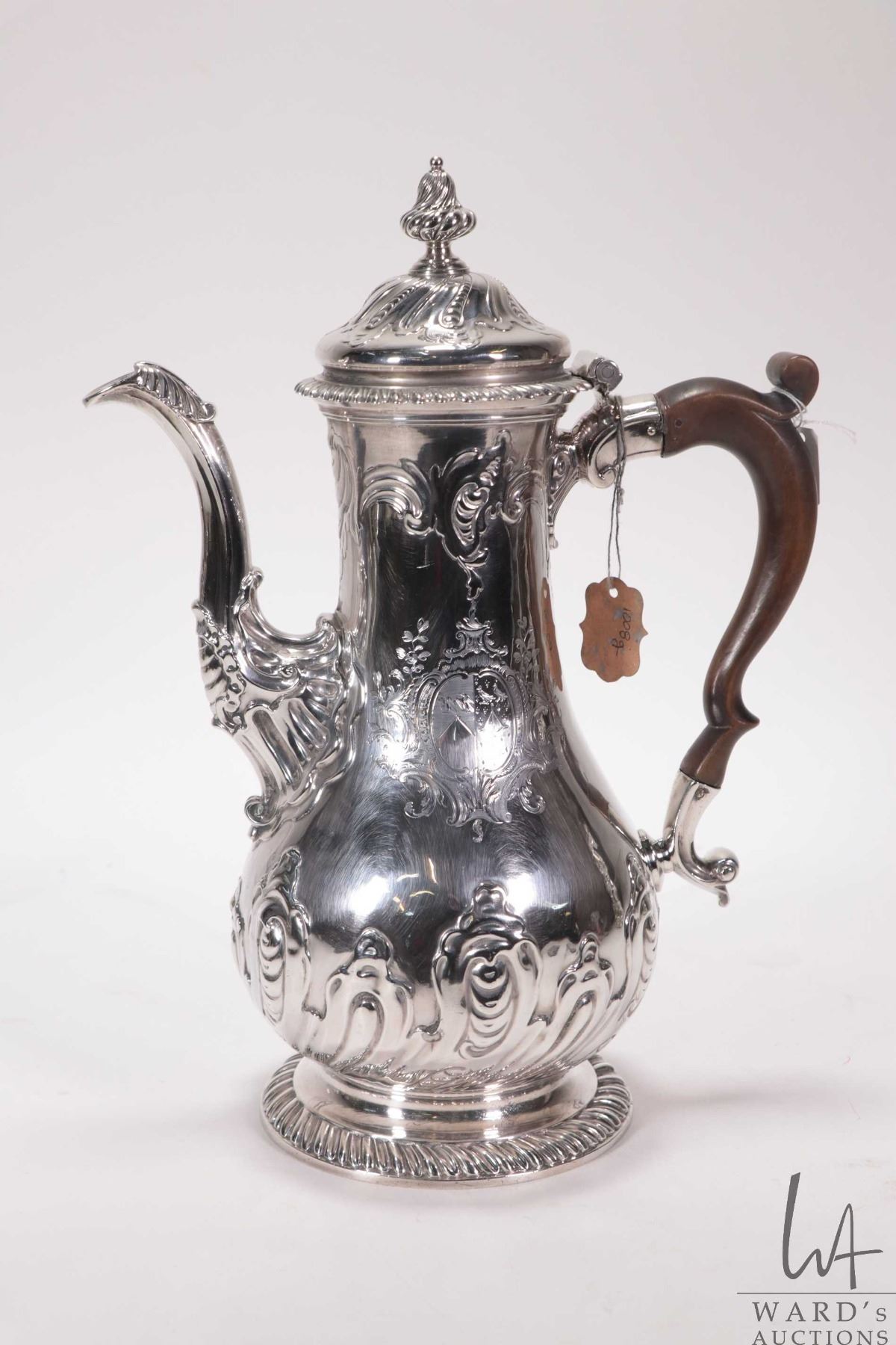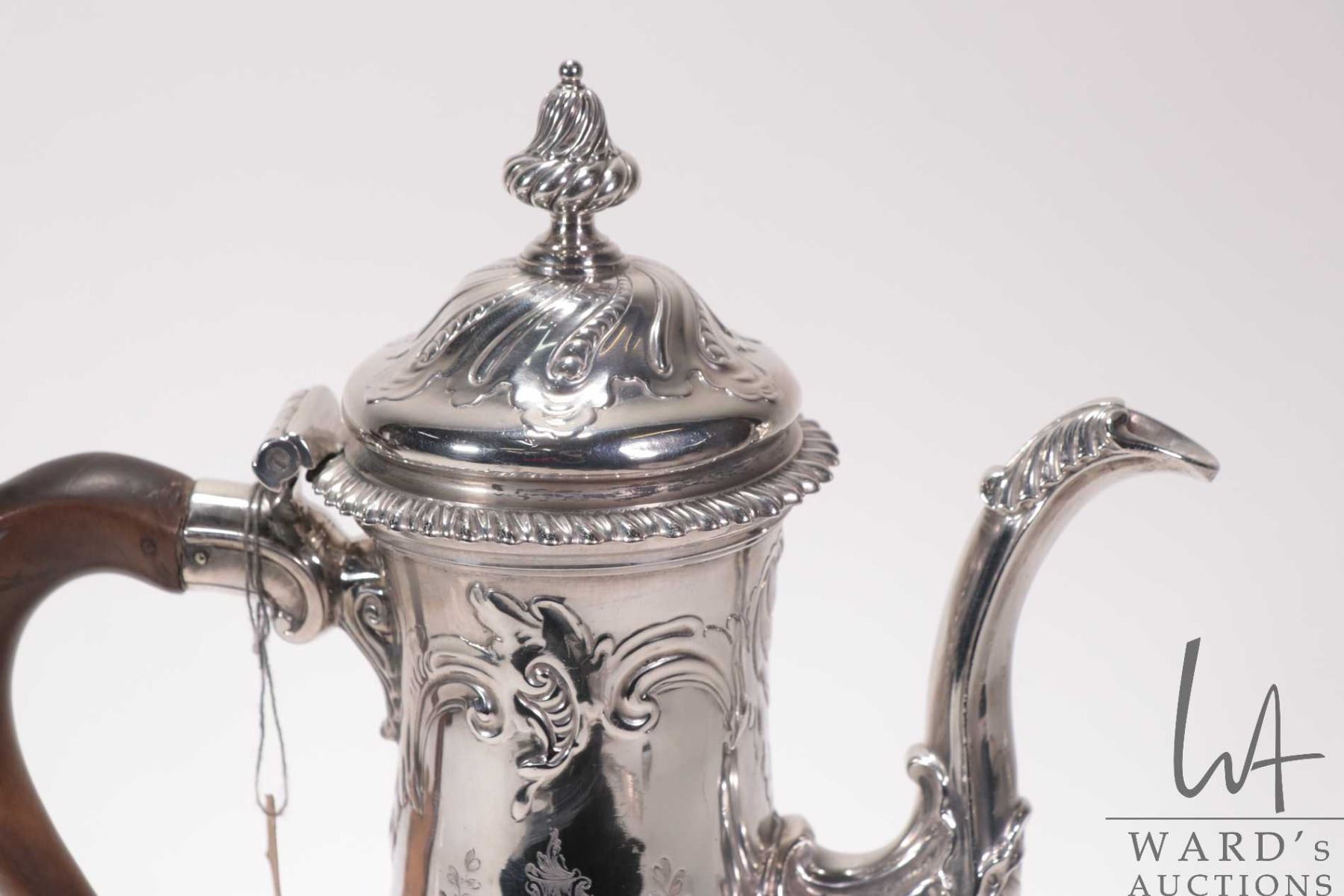 Antique George II repousse sterling silver 12" teapot with London hallmarks circa 1759 (1008 g) and a George II/ George III sterling silver creamer circa 1760 with London hallmarks (209 g). Note: this year had two date codes. After the death of George II (in October) the code change with the ascension of George III. This teapot is marked with the early 1759 date code.