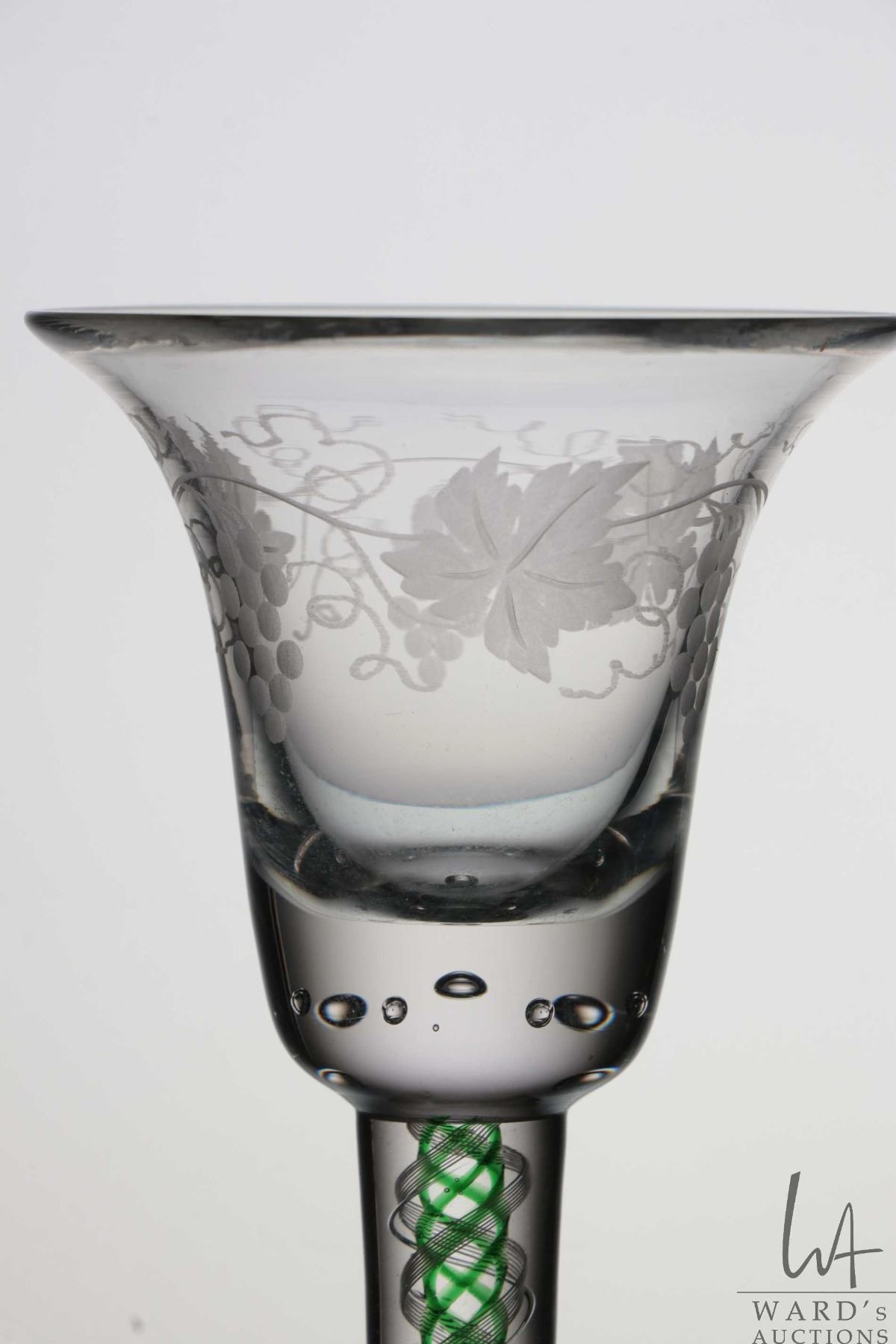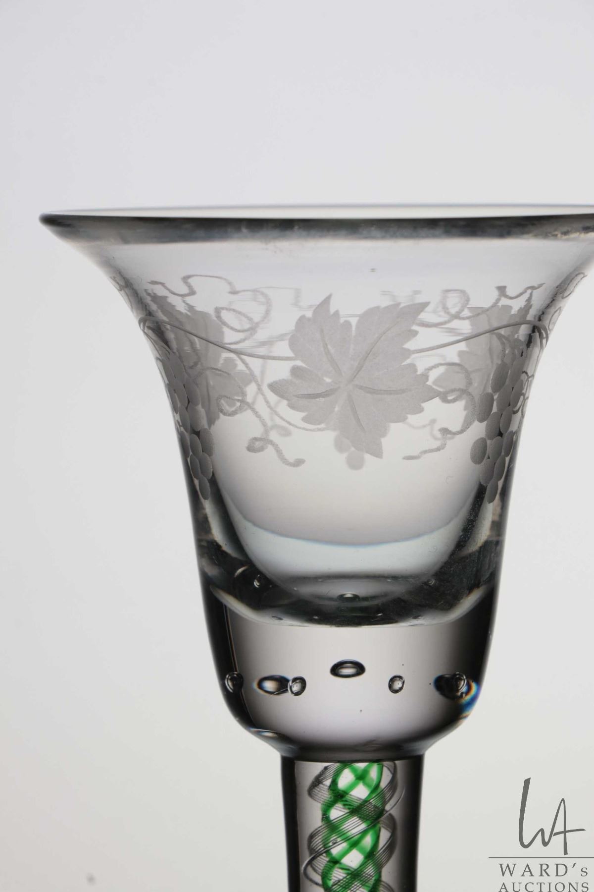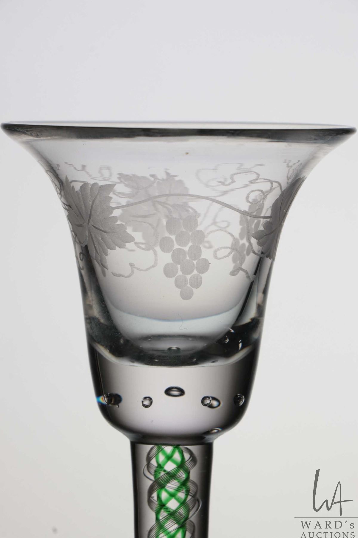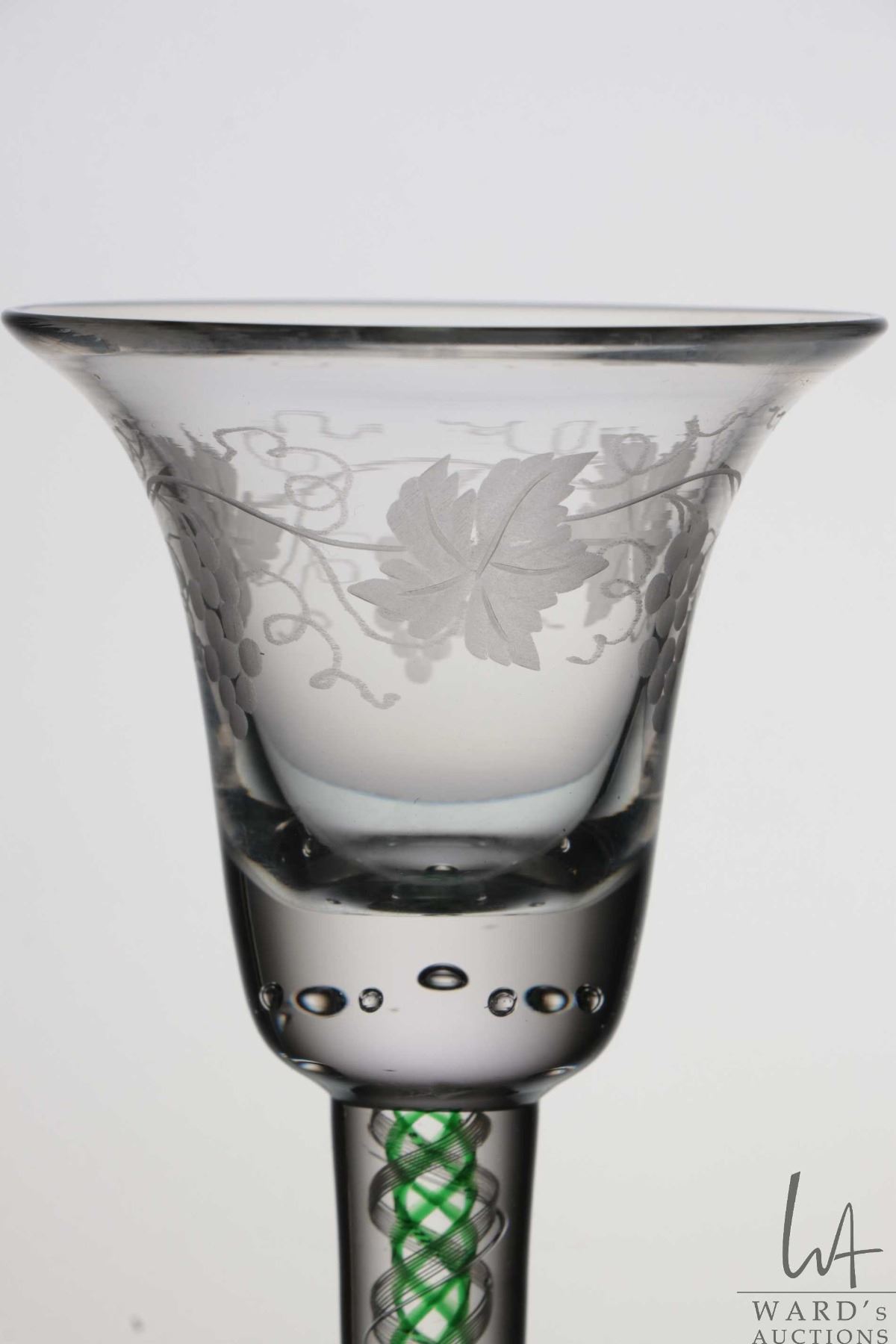 Antique Georgian cordial glass with etched grape and vine leaf on bell bowl with beaded bubble base, green and white spiral air twist stem, circa mid 1700's, 15.6cm in height
