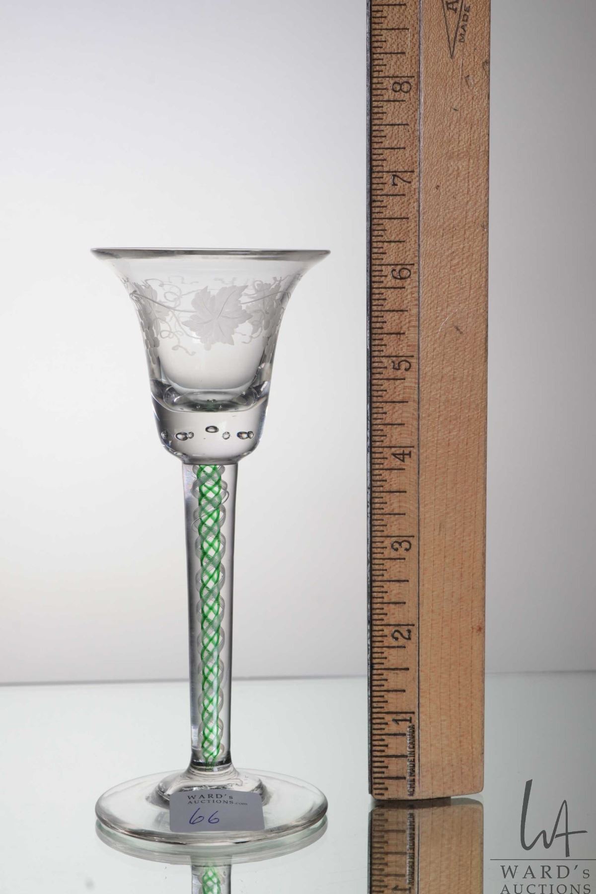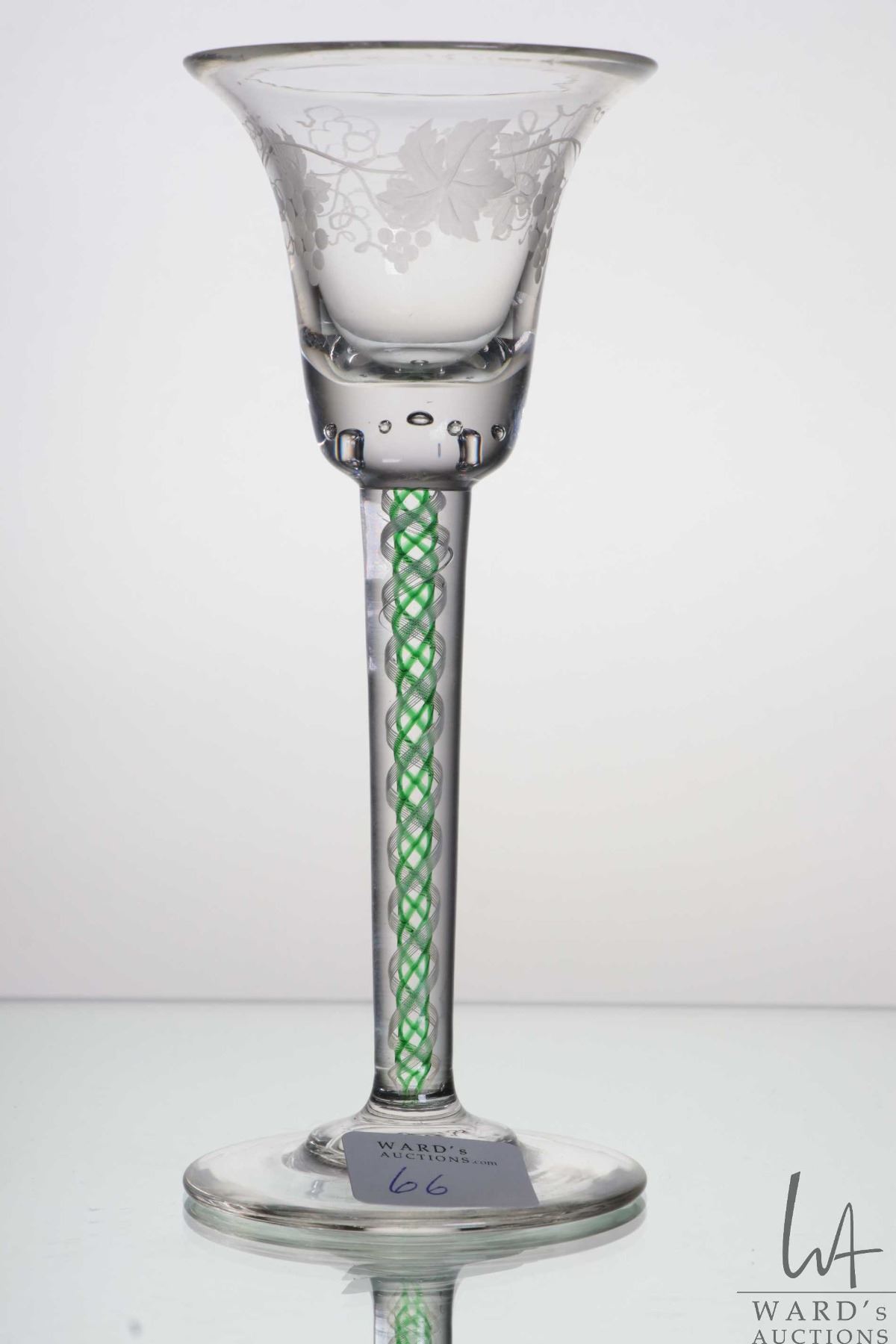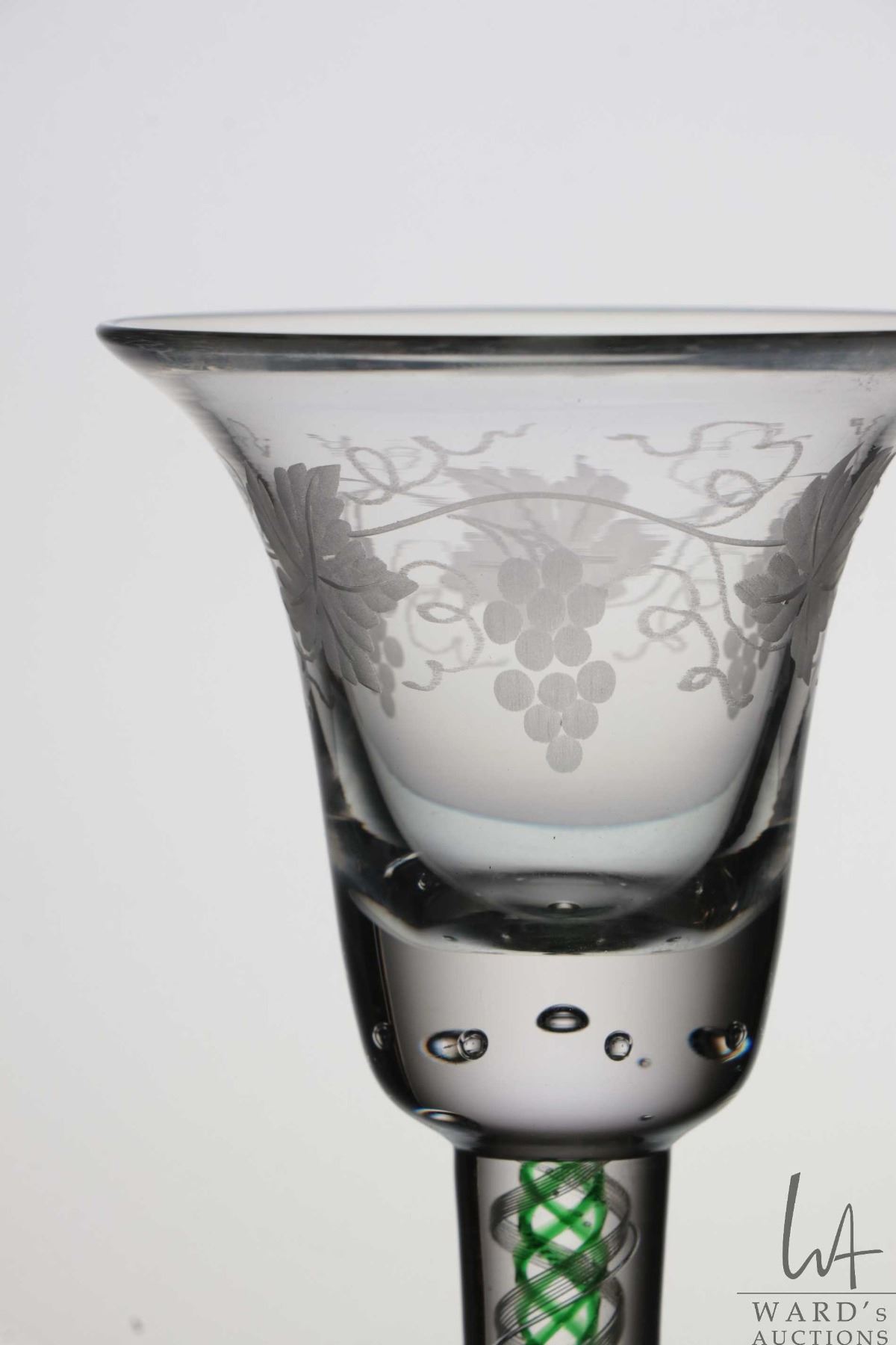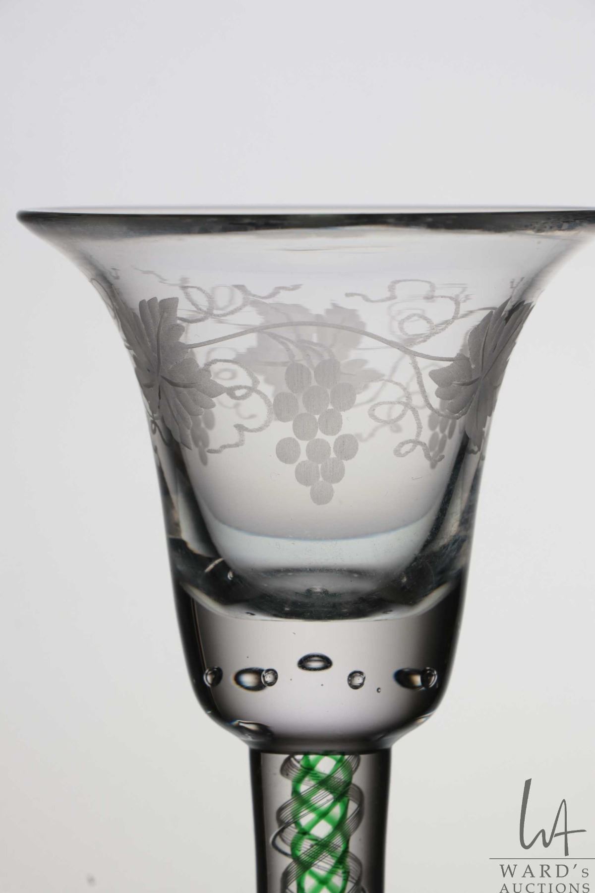 Antique Georgian cordial glass with etched grape and vine leaf on bell bowl with beaded bubble base, green and white spiral air twist stem, circa mid 1700's, 15.6cm in height