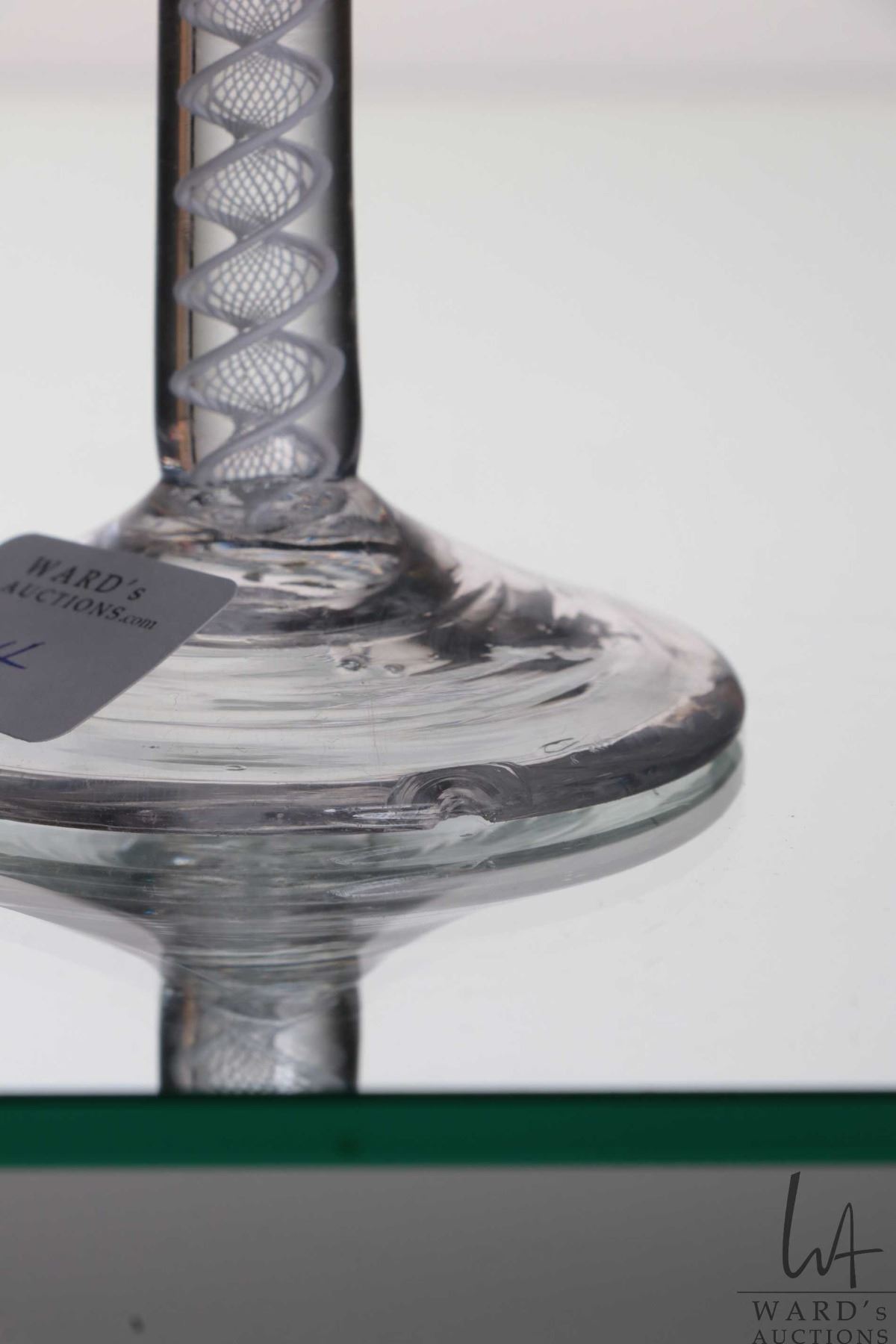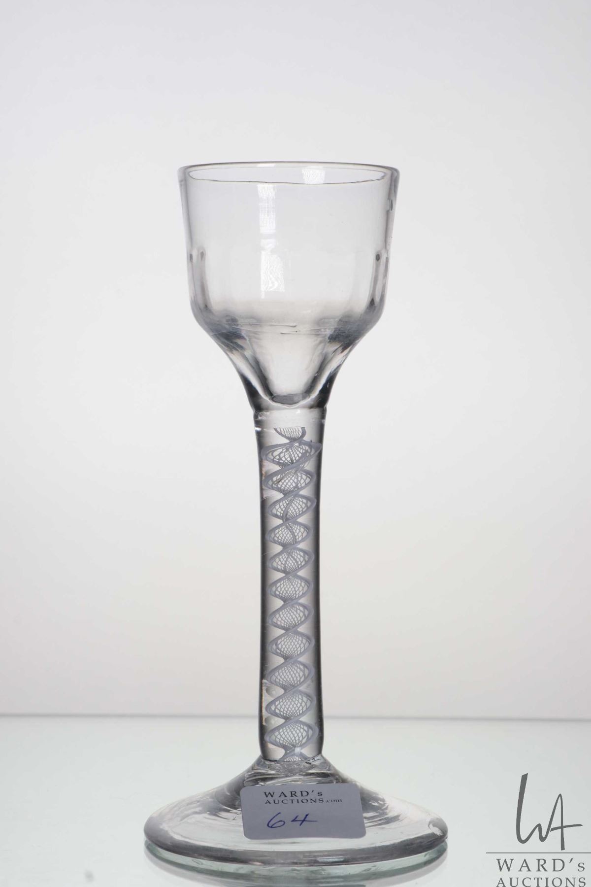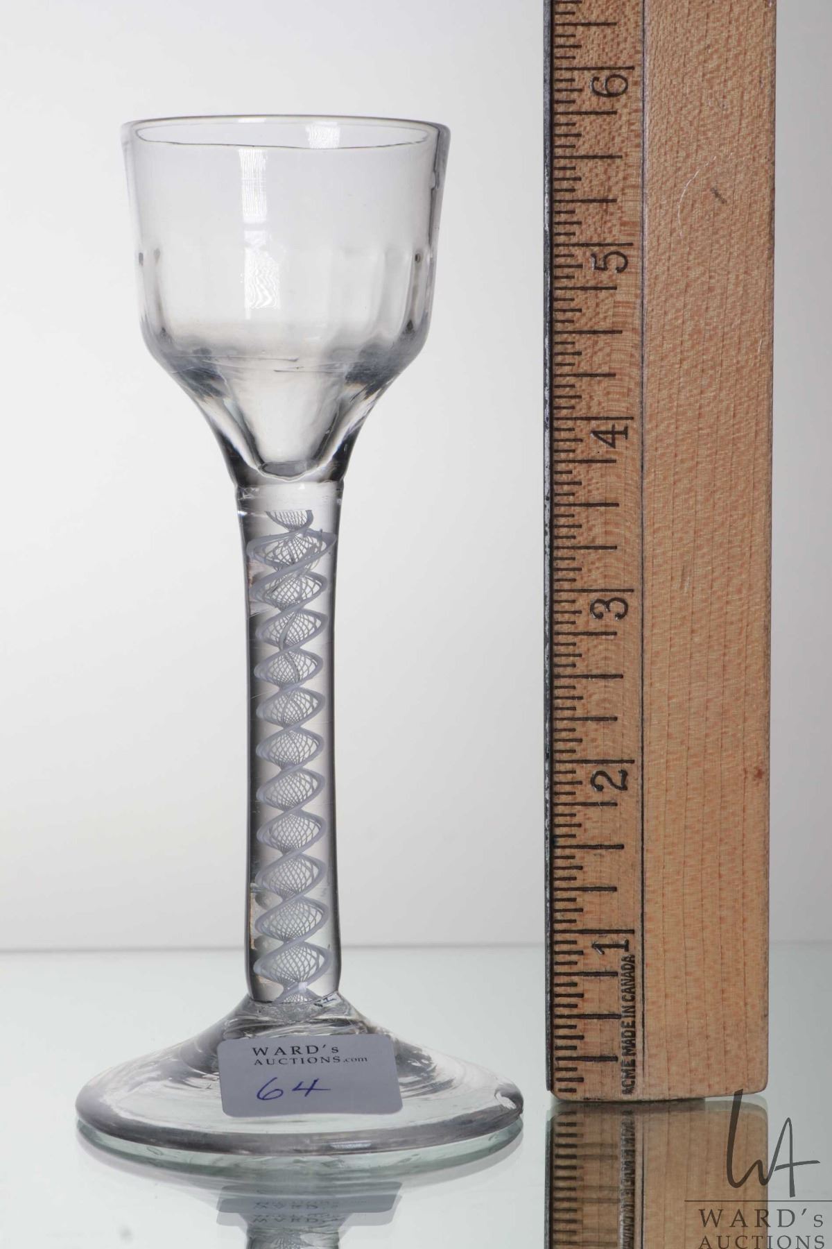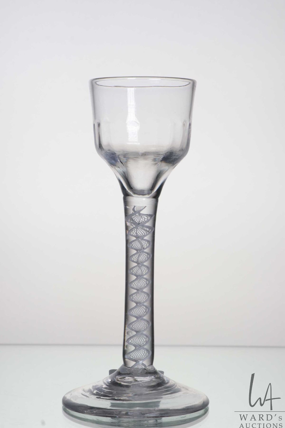 Antique Georgian cordial glass with ogee shaped bowl and white air twist stem, circa 1740, 14.3cm in height