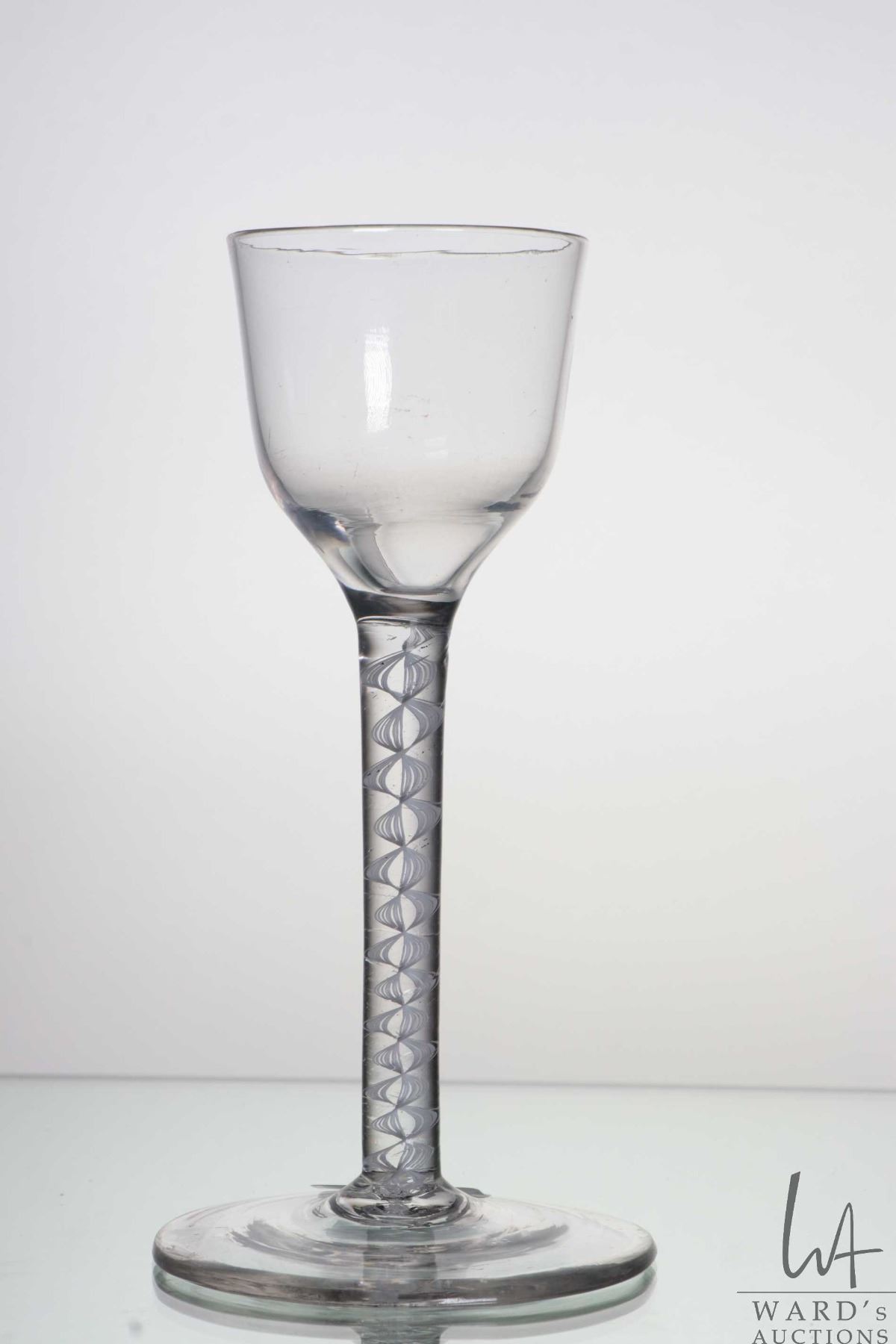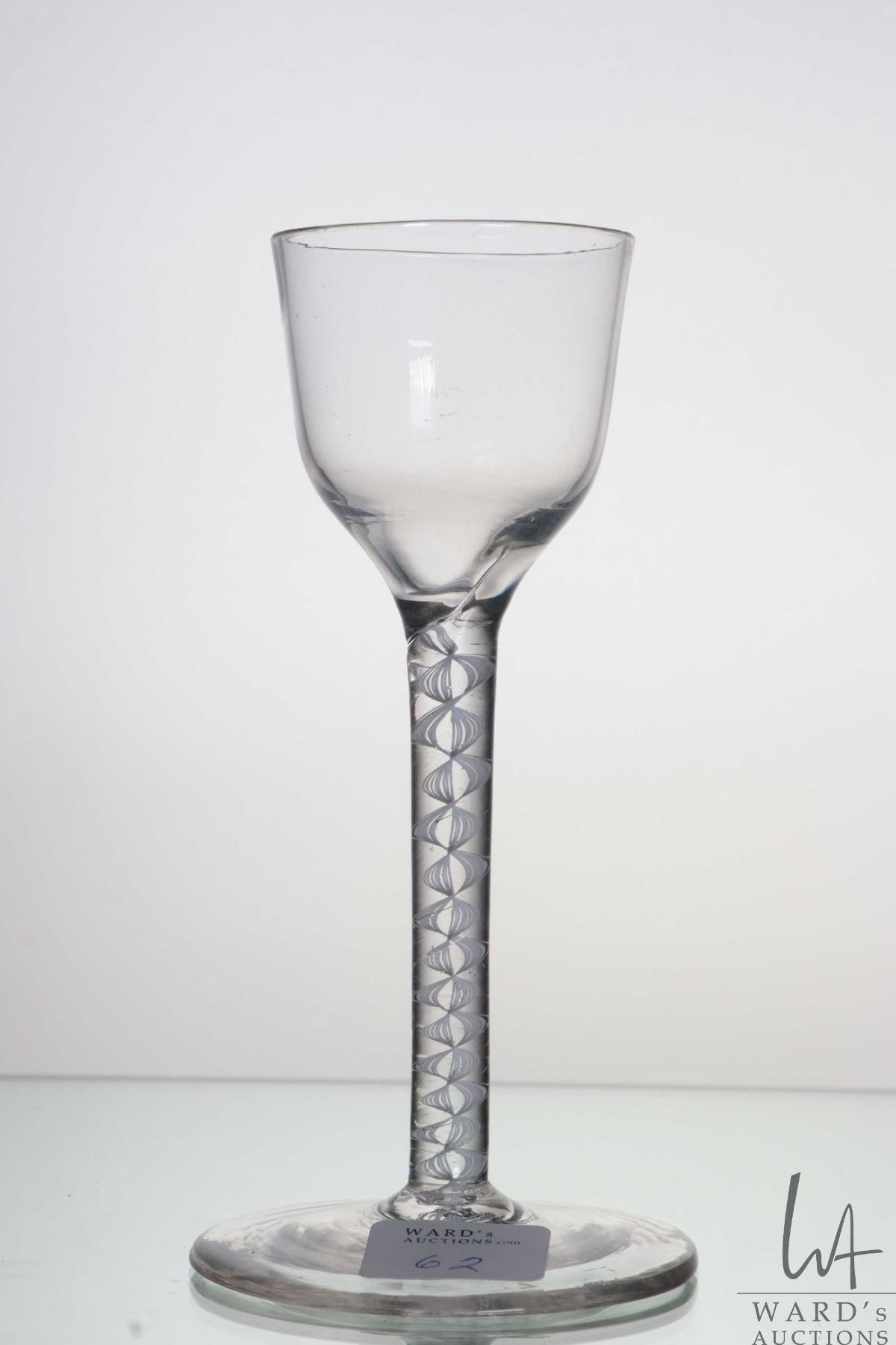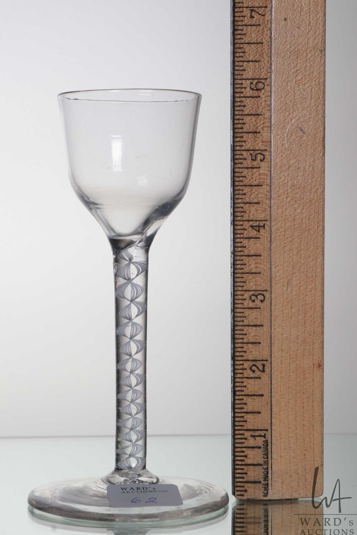 Antique Georgian cordial glass with ovoid shaped bowl and white air twist stem, circa 1740, 14.7cm in height