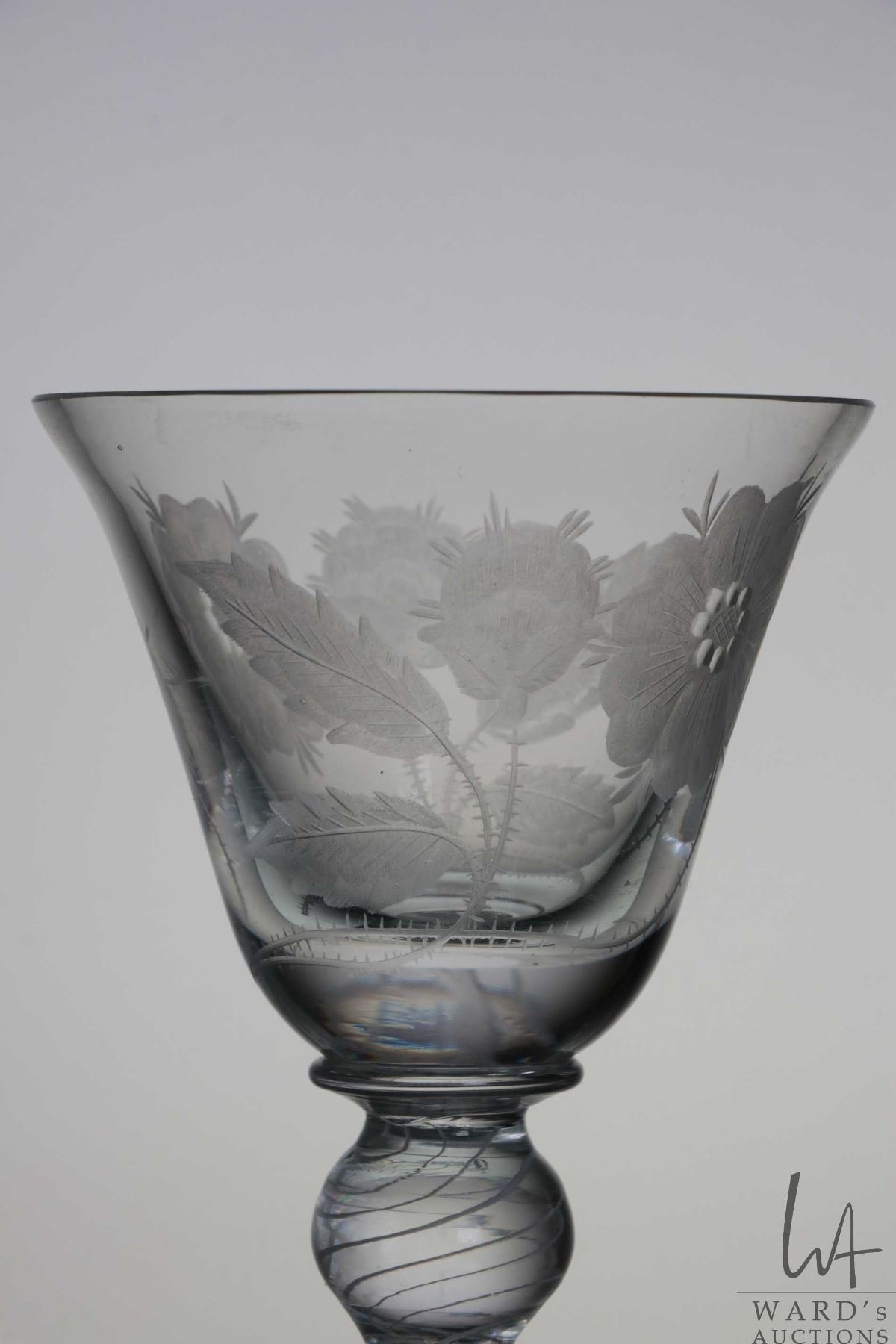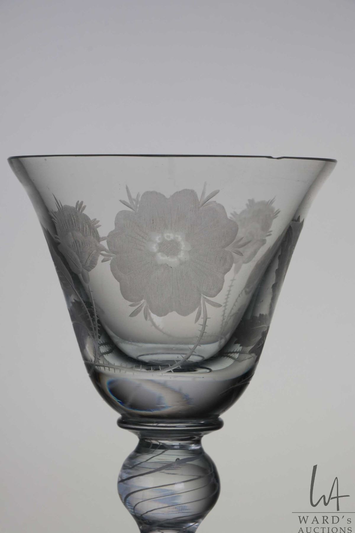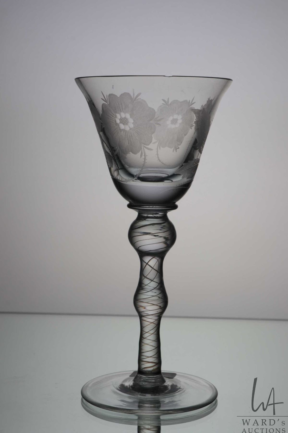 Antique Georgian era Jacobite wine glass with engraved with the white Jacobite rose and thistle on bell shaped bowl with double knob and air twist white stem, 21cm in height, circa mid 1740's, note: small chip to rim of bowl, matches lot 7
