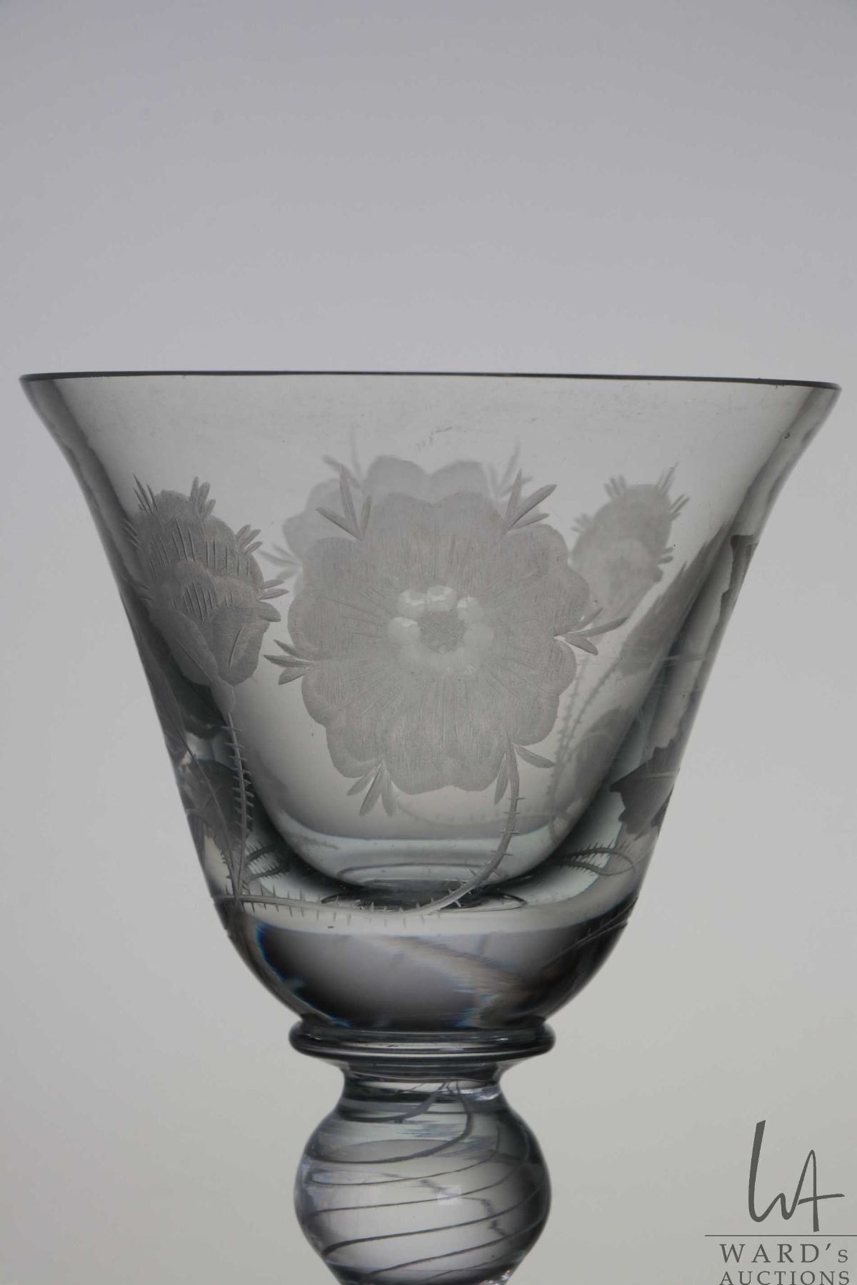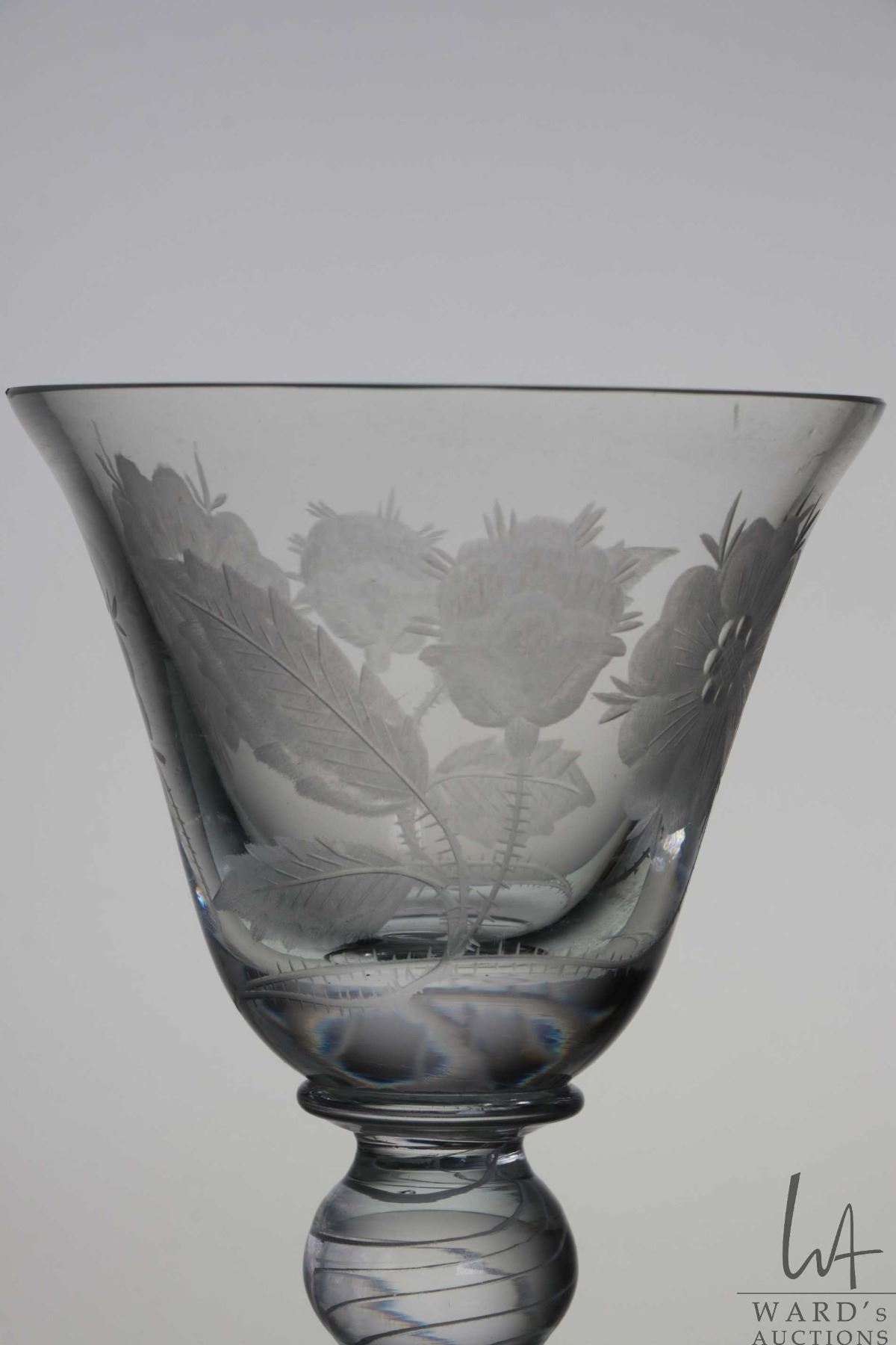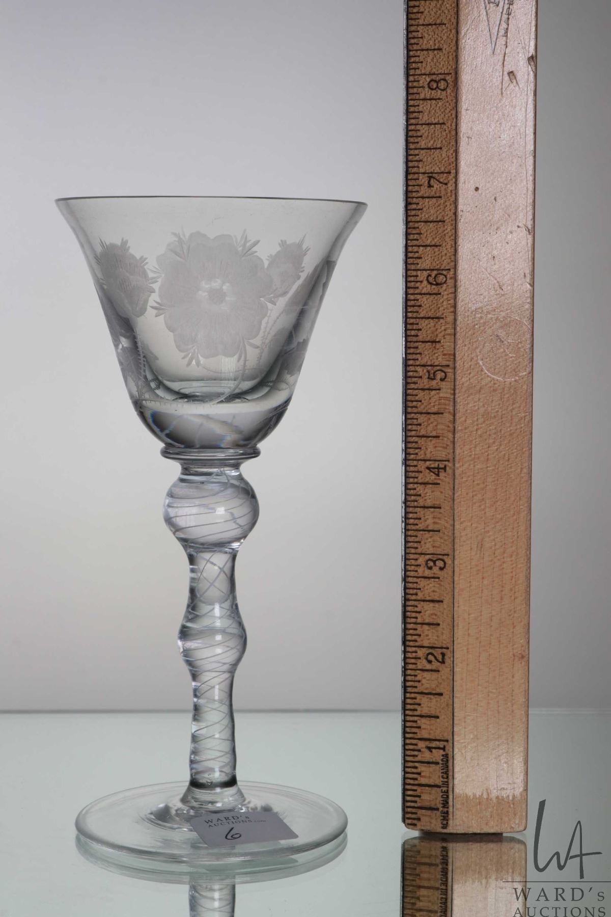 Antique Georgian era Jacobite wine glass with engraved with the white Jacobite rose and thistle on bell shaped bowl with double knob and air twist white stem, 21cm in height, circa mid 1740's, note: small chip to rim of bowl, matches lot 7