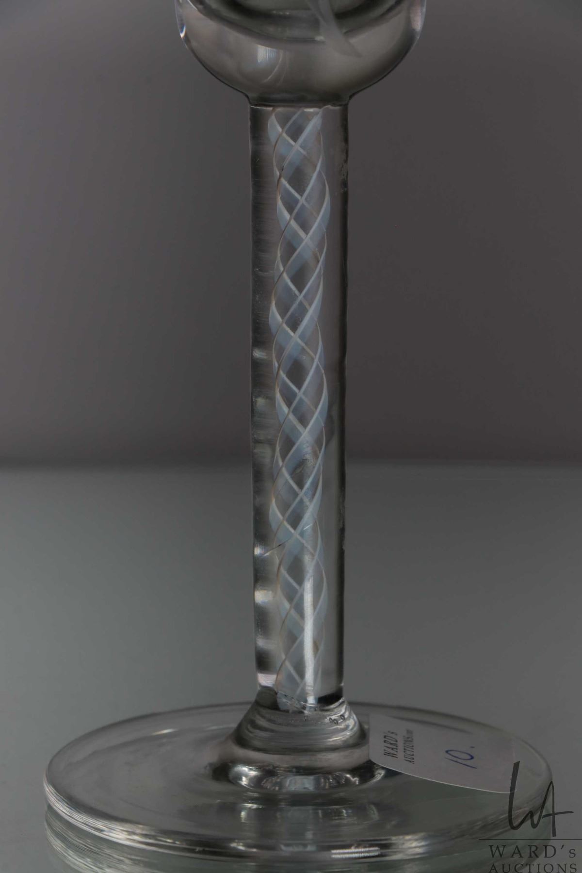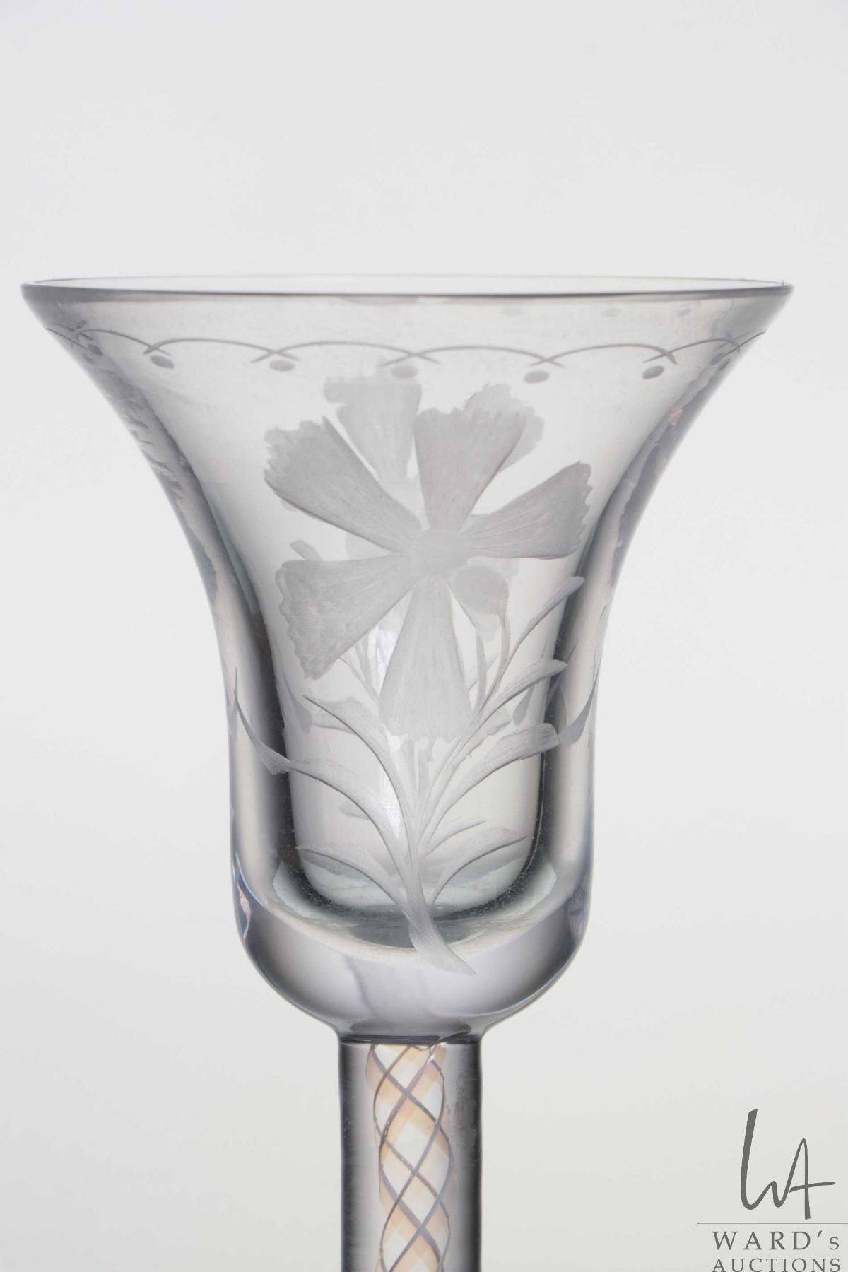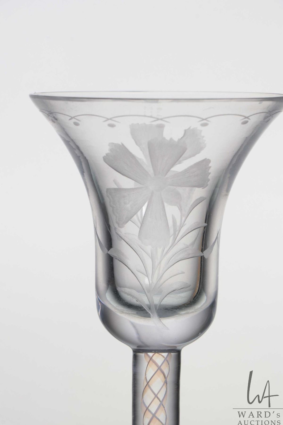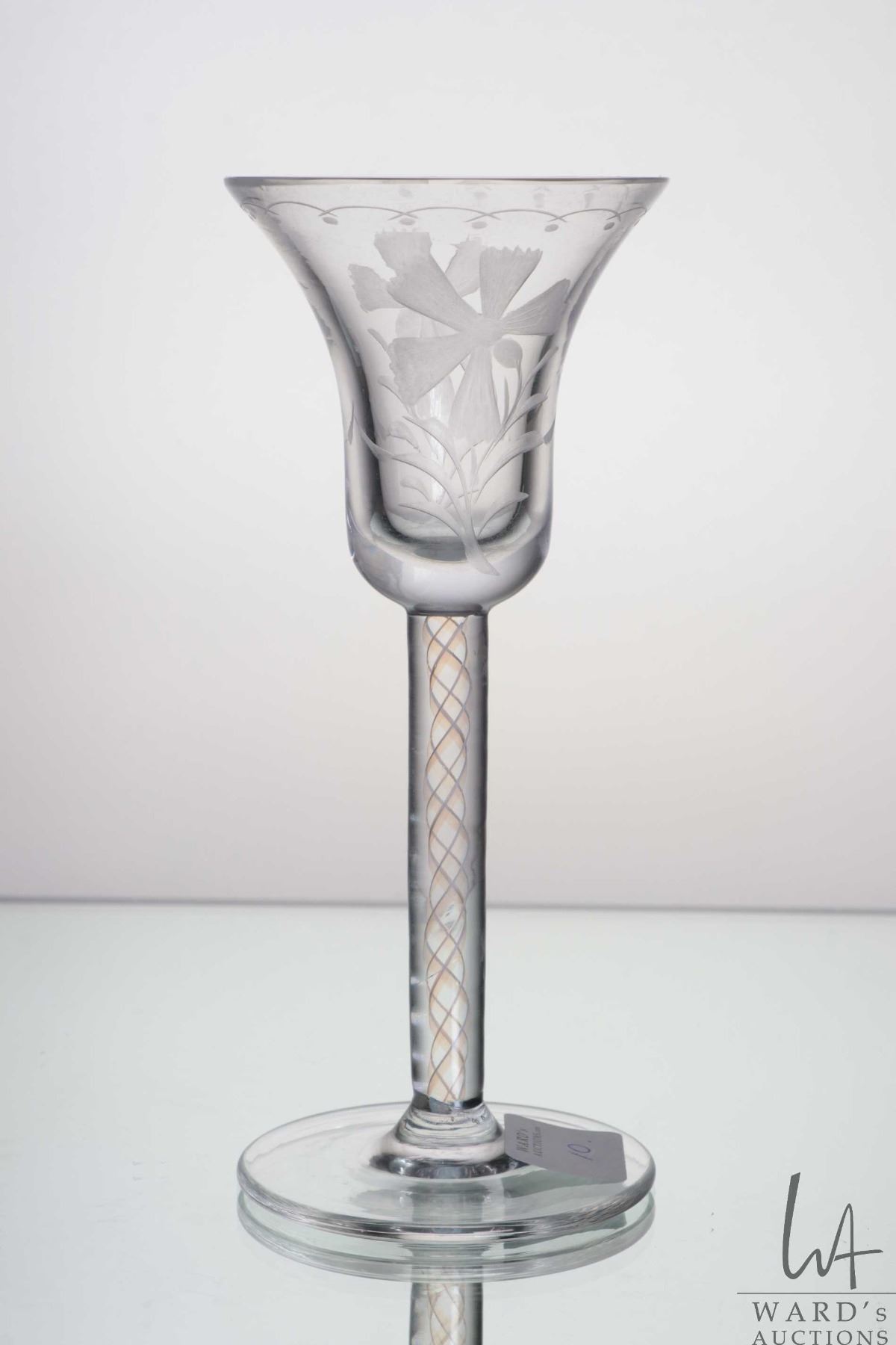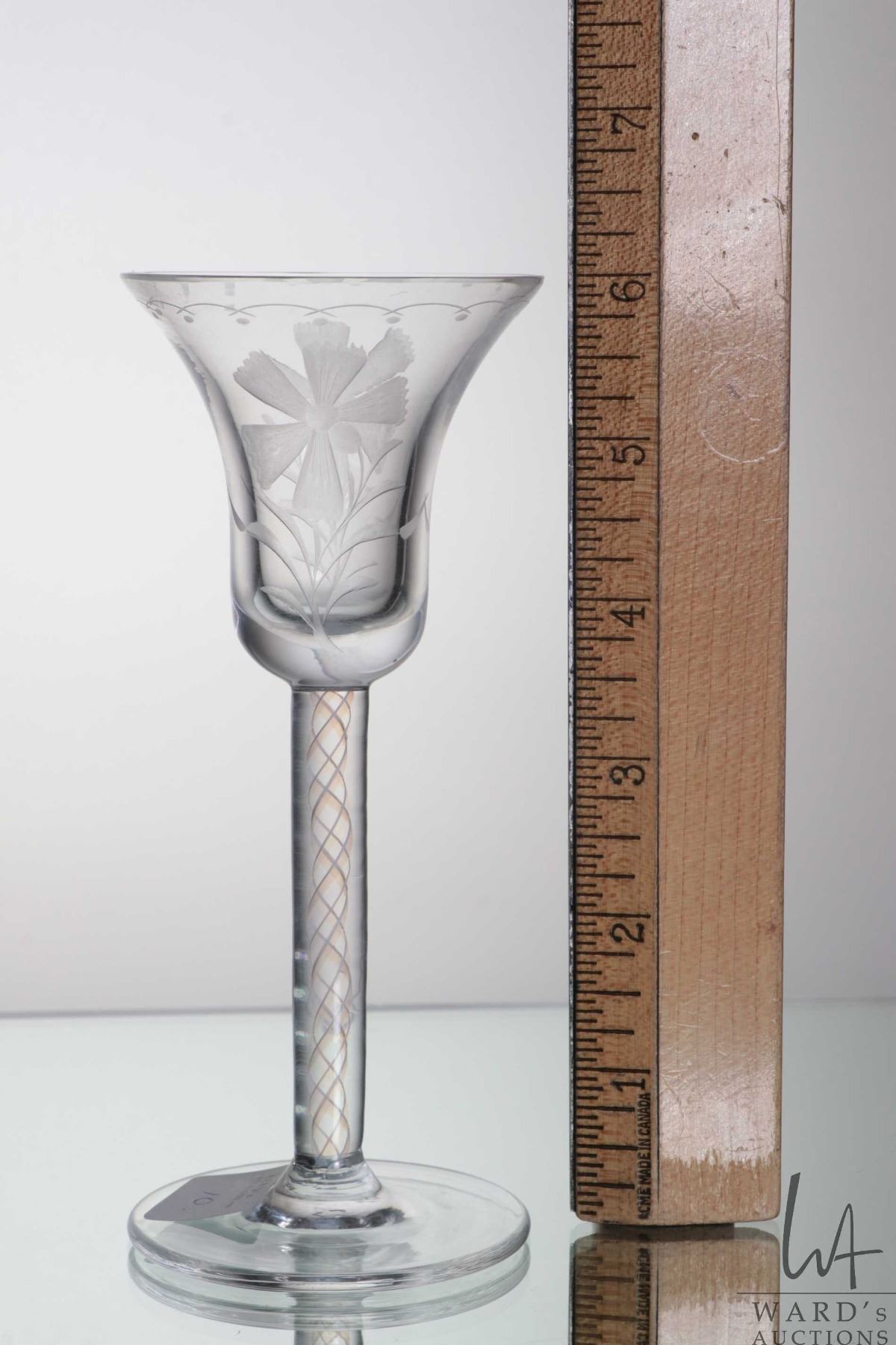 Antique Georgian era cordial glass with wild flower engraved bell shaped bowl and blue and white coloured air twist stem, circa 1740's, 15.3cm in height