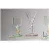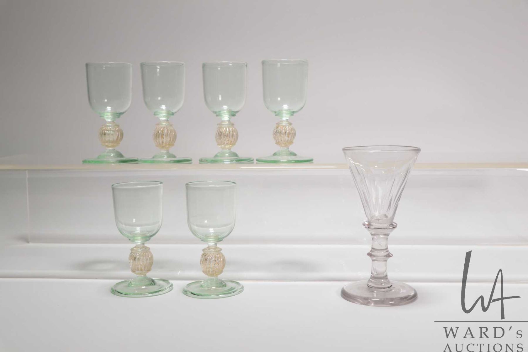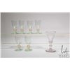 Antique Georgian petal cut 4 1/2" wine glass and six vintage Uranium apertif glasses with gilt bulbous stems, each 3 3/4" in height