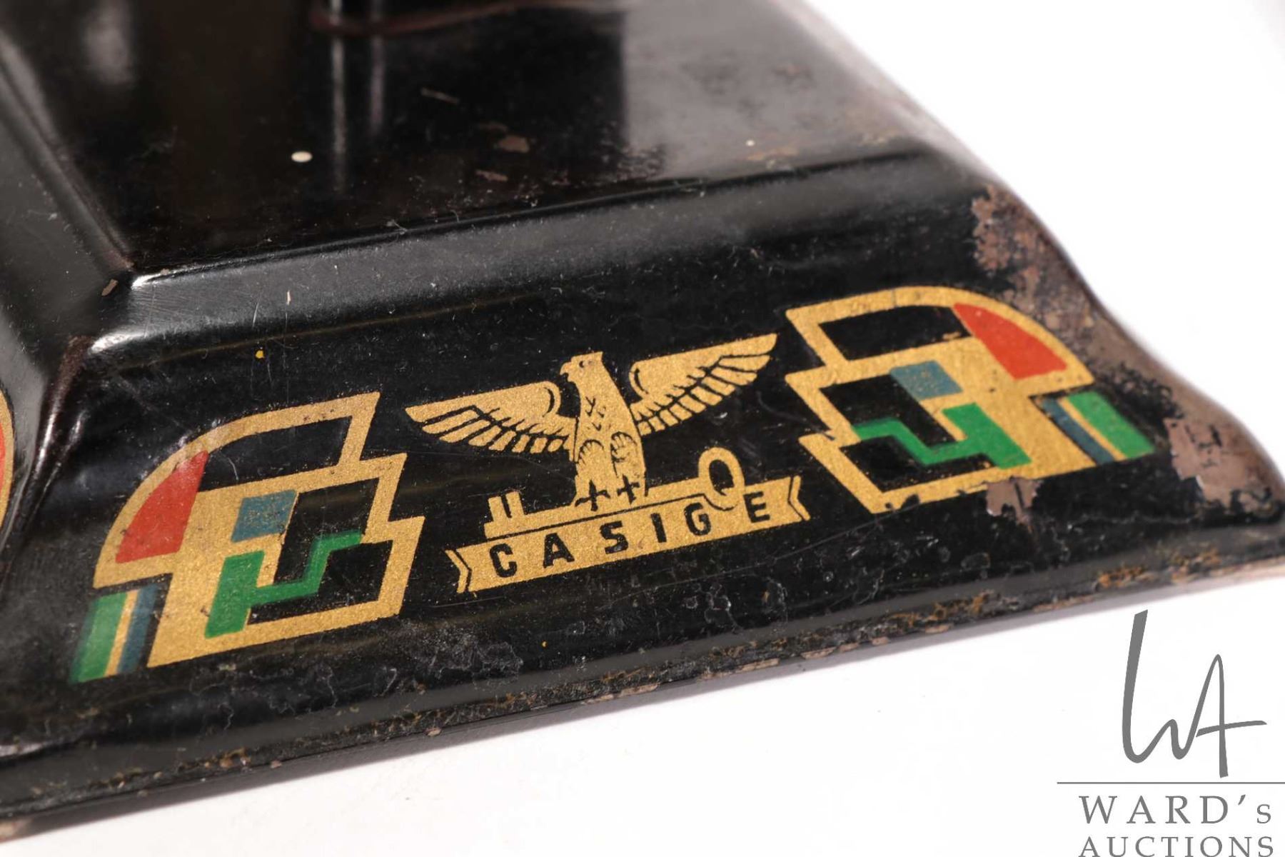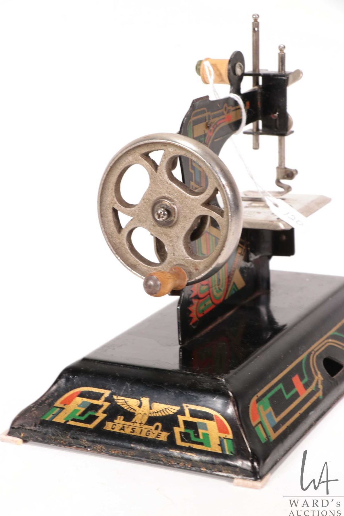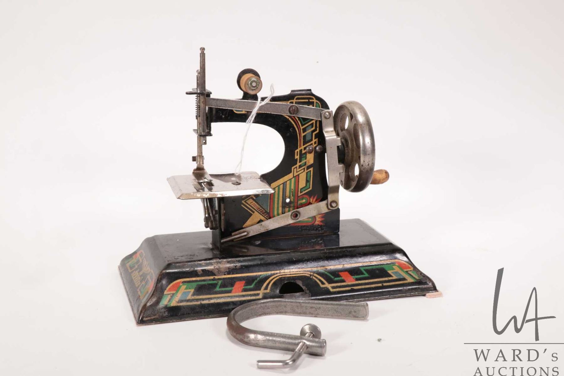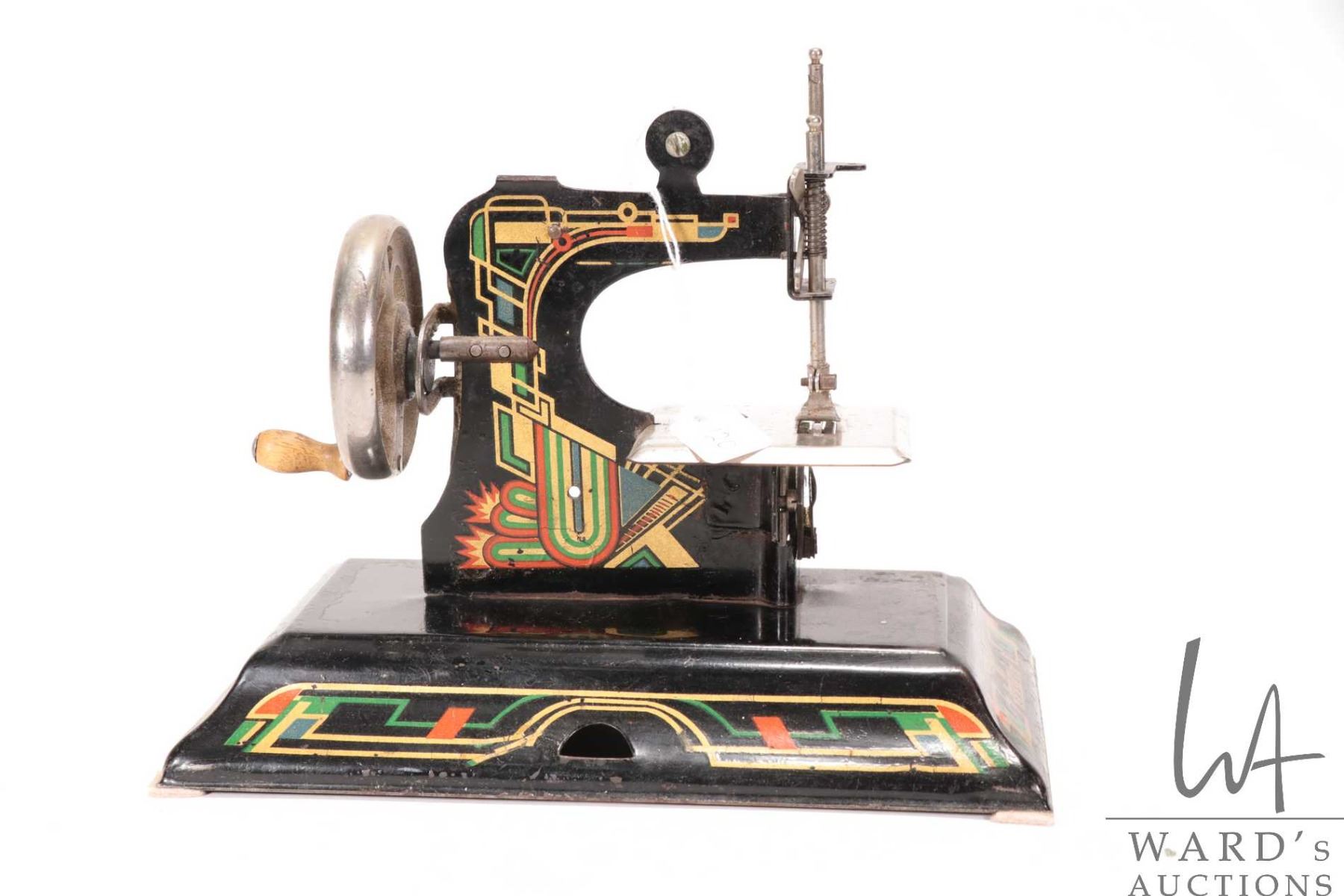 Antique German made Casiage toy sewing machine, circa 1920's with Art Deco style lithography, 6 1/2" H X 8" L