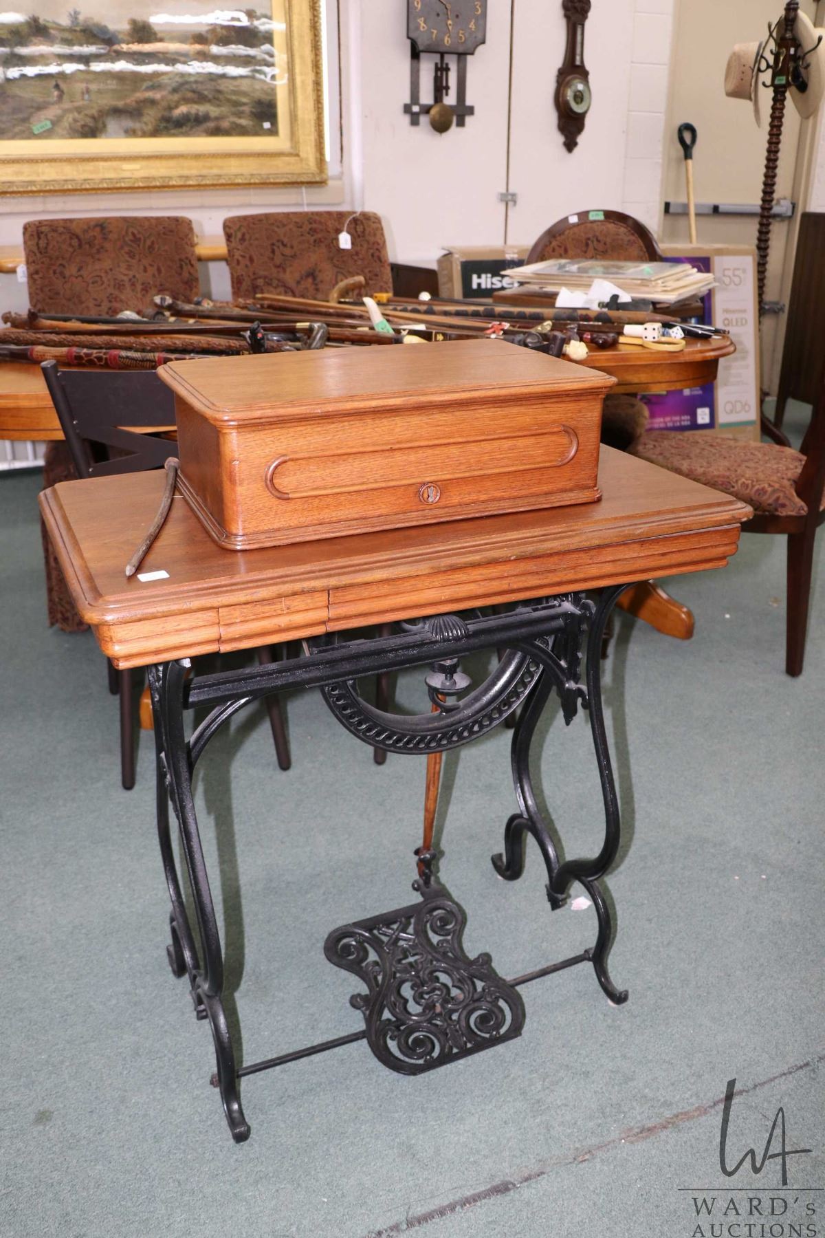 Antique Grober & Baker treadle sewing machine with silver-plate and gilt decoration in mahogany 30" H X 29" W X 17" D table plus height of machine