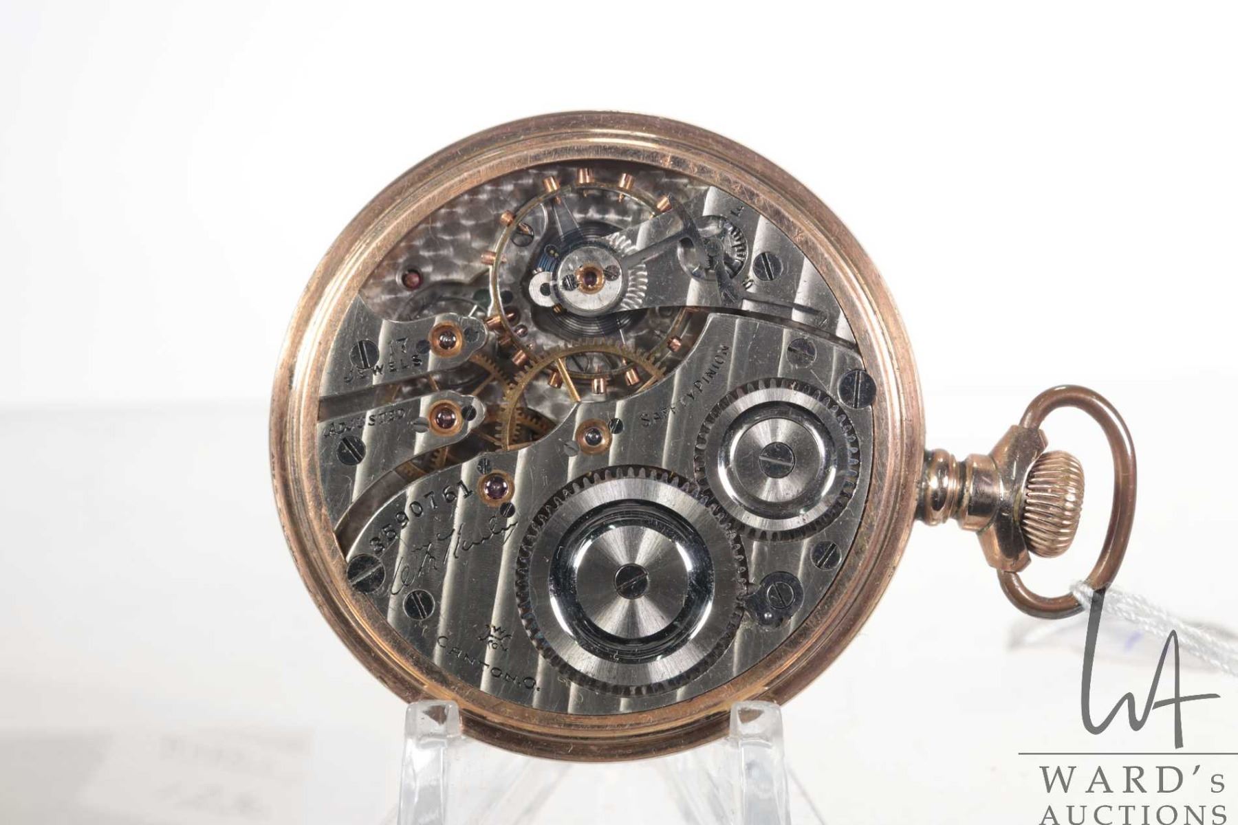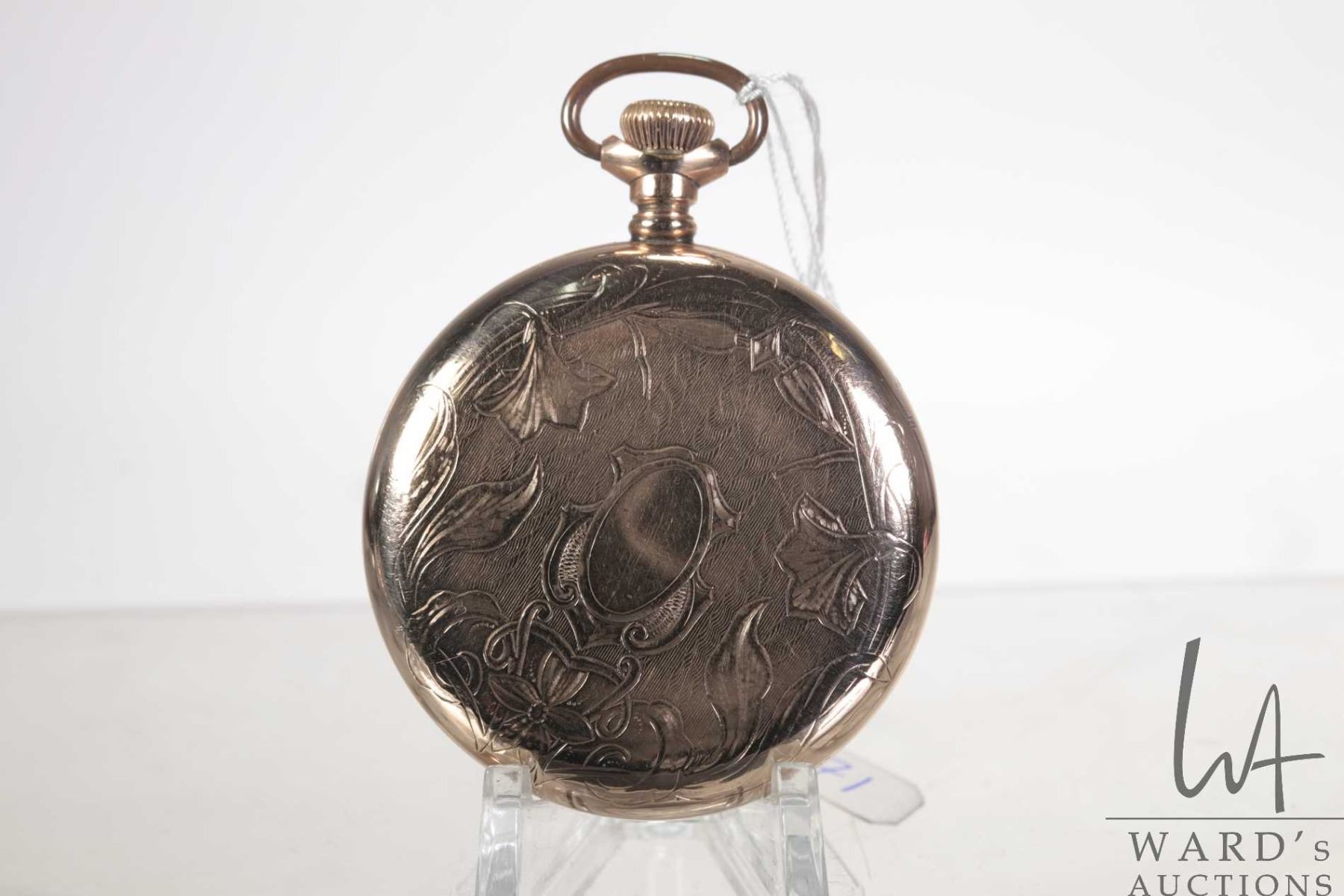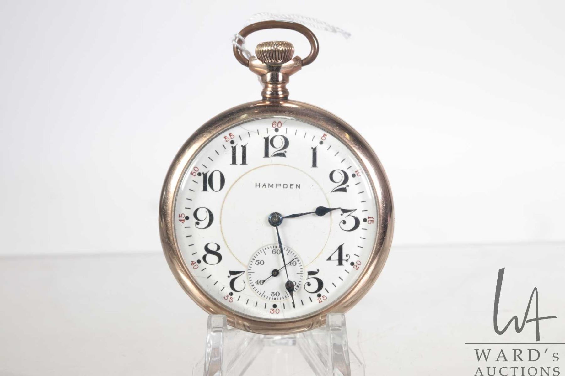 Antique Hampden 17 jewel pocket watch with double sunk second sweep and Arabic numerals on white porcelain dial. Open faced gold plated Dueber 20 year case. Size 16, serial number 3590761, circa 1917. Working at time of cataloguing