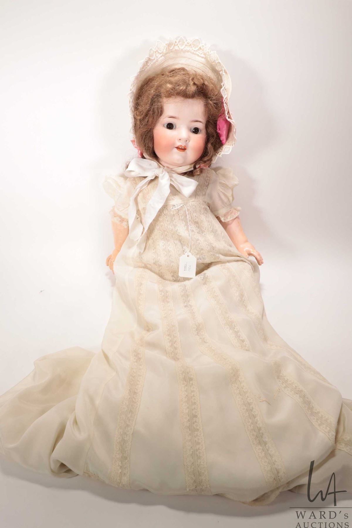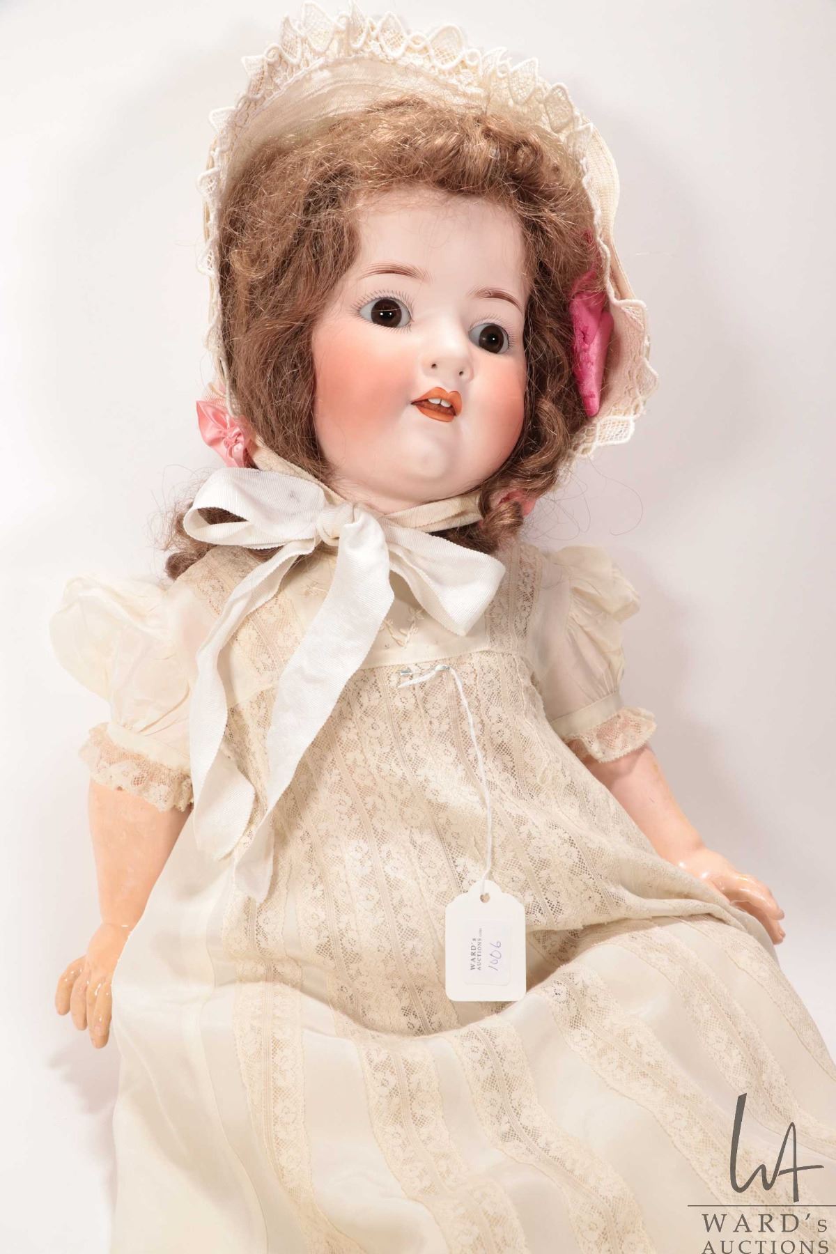 Antique Huebach Koppelsdorf bisque head doll "Hazel", mold no. 320.9 on "breather" composition body. Glass eyes and open mouth. No cracks seen to bisque. Note: Viewing in person recommended. Buyer must satisfy themselves as to condition