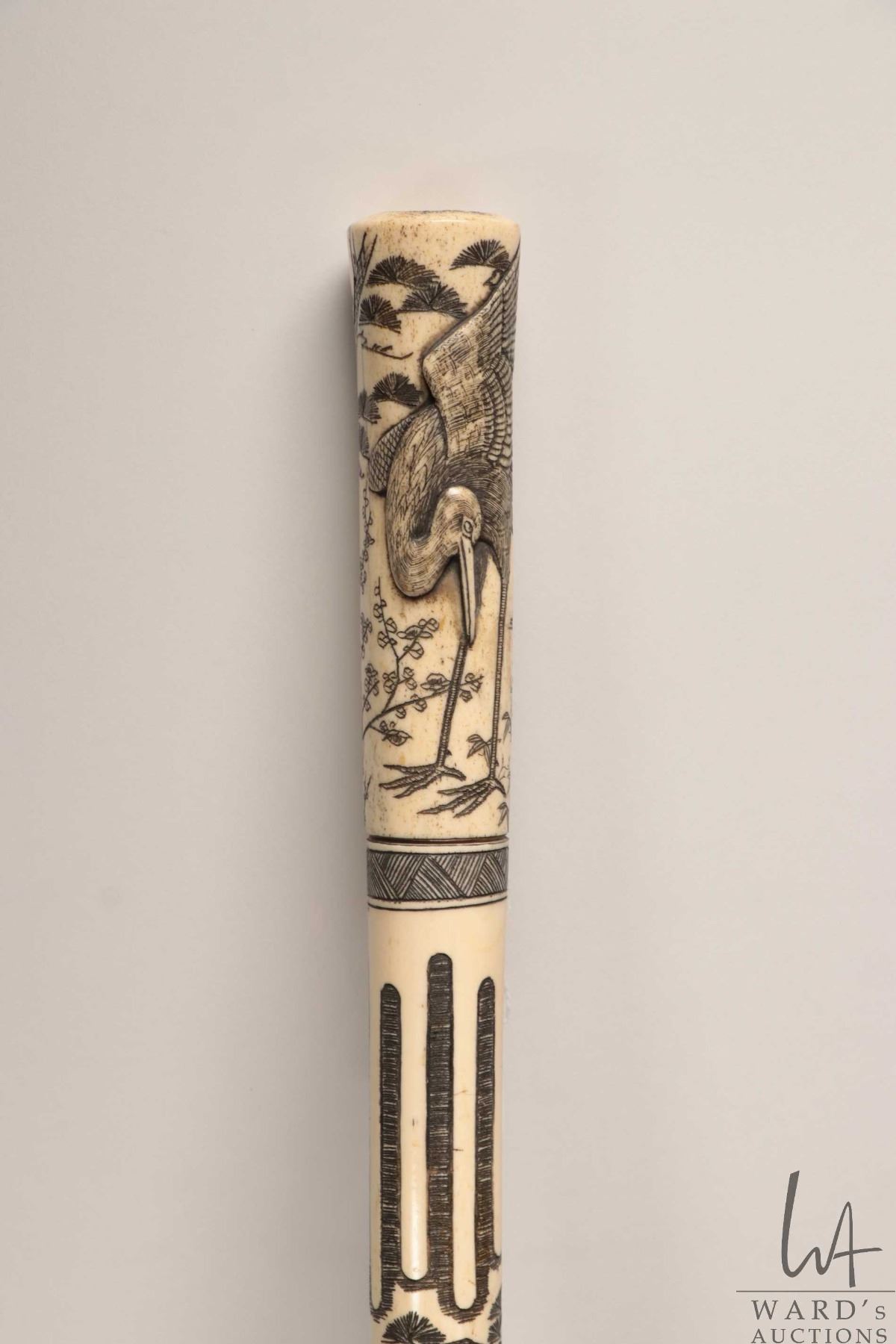 Antique Japanese hand carved bone walking stick, made up of nine intricately carved sections featuring Asian figure and crane, appears to be missing it's topper, brass tip, 35" in height. Note: some sections have cracking or splitting
