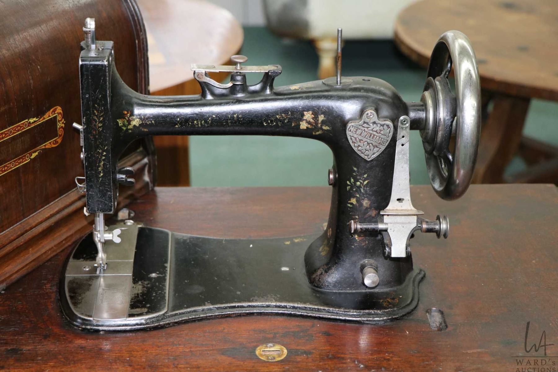 Antique New Williams treadle sewing machine in heavy cast base with mismatched machine topper marked Seamstress Vibrator