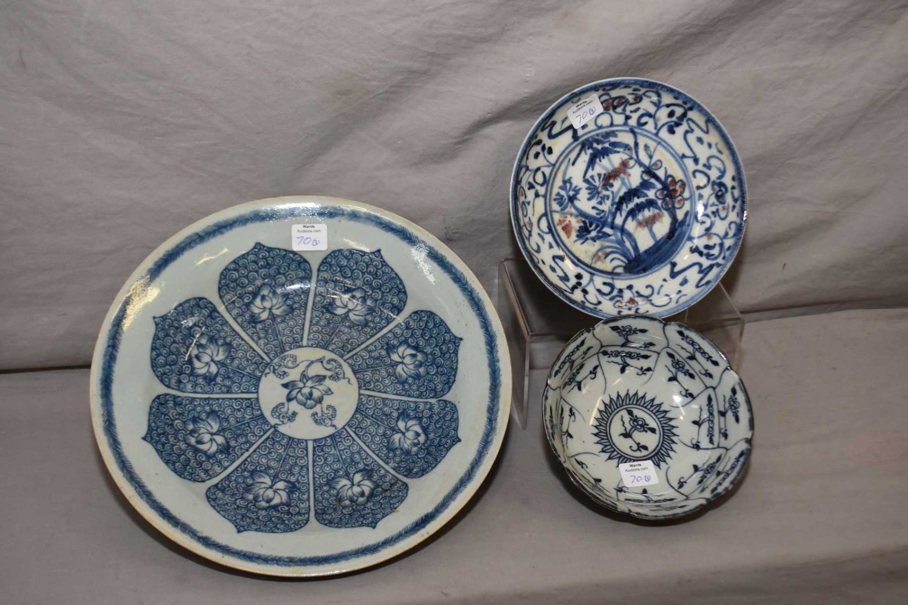 Antique Oriental blue and white branch motif bowl, a blue and white "Spring Garden dish"and a blue and white "Way of Buddhism" plate