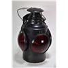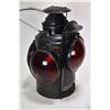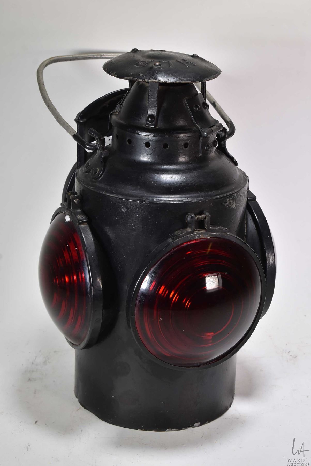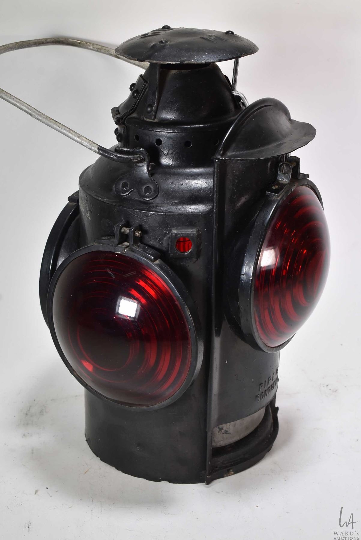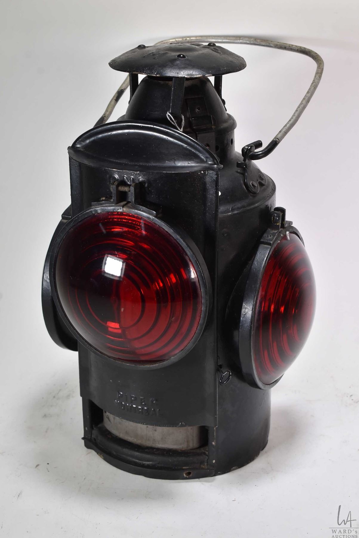 Antique Piper four way kerosene railway lantern made by Hiriam L. Piper Co. Montreal, complete with original red fresnel lenses, burner, lens and fuel can. Appears complete