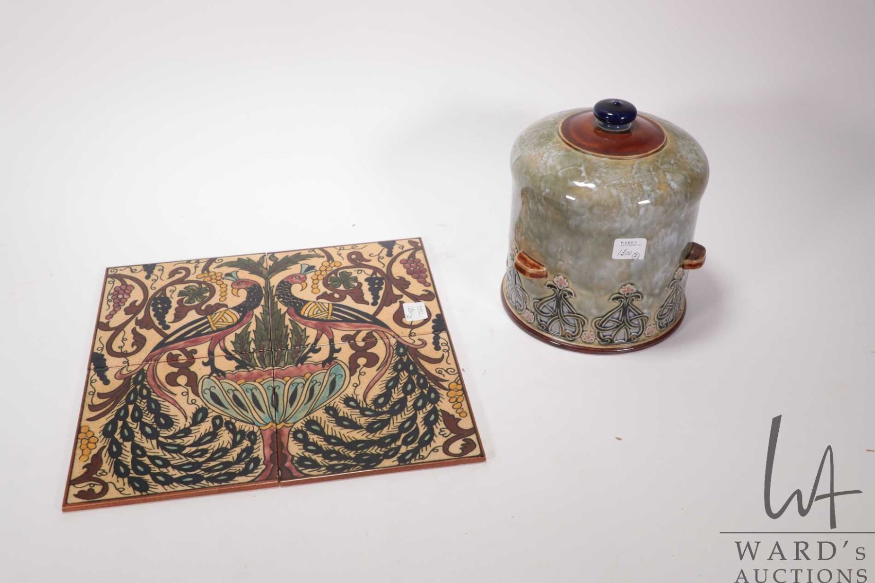Antique Royal Doulton glazed dome no. 3945, 8" in height and four peacock theme hand painted glazed terracotta tiles