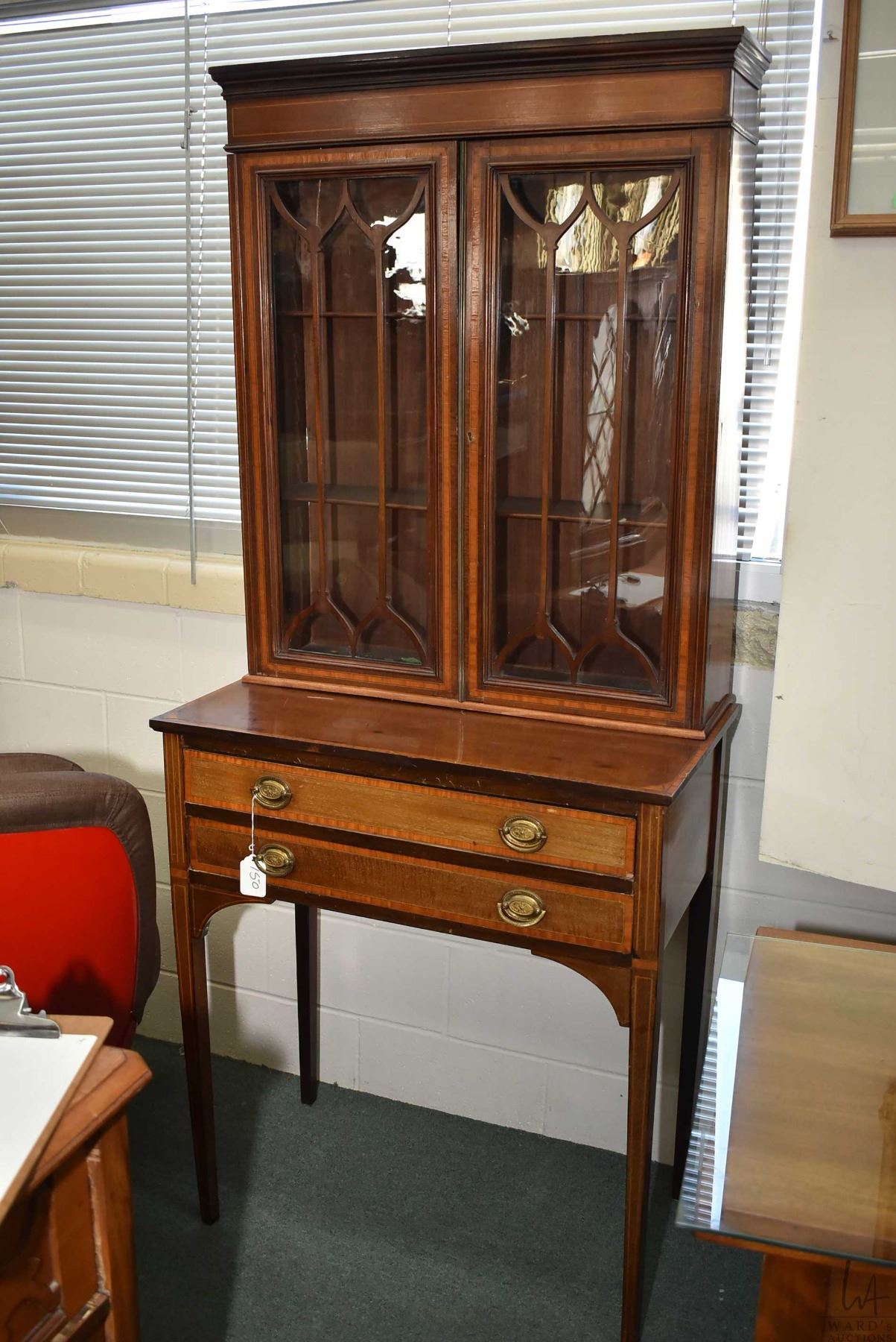 Antique Sheraton two drawer chest on tall supports with complimenting two door display hutch, each featuring inlaid stain wood banding, and original glass
