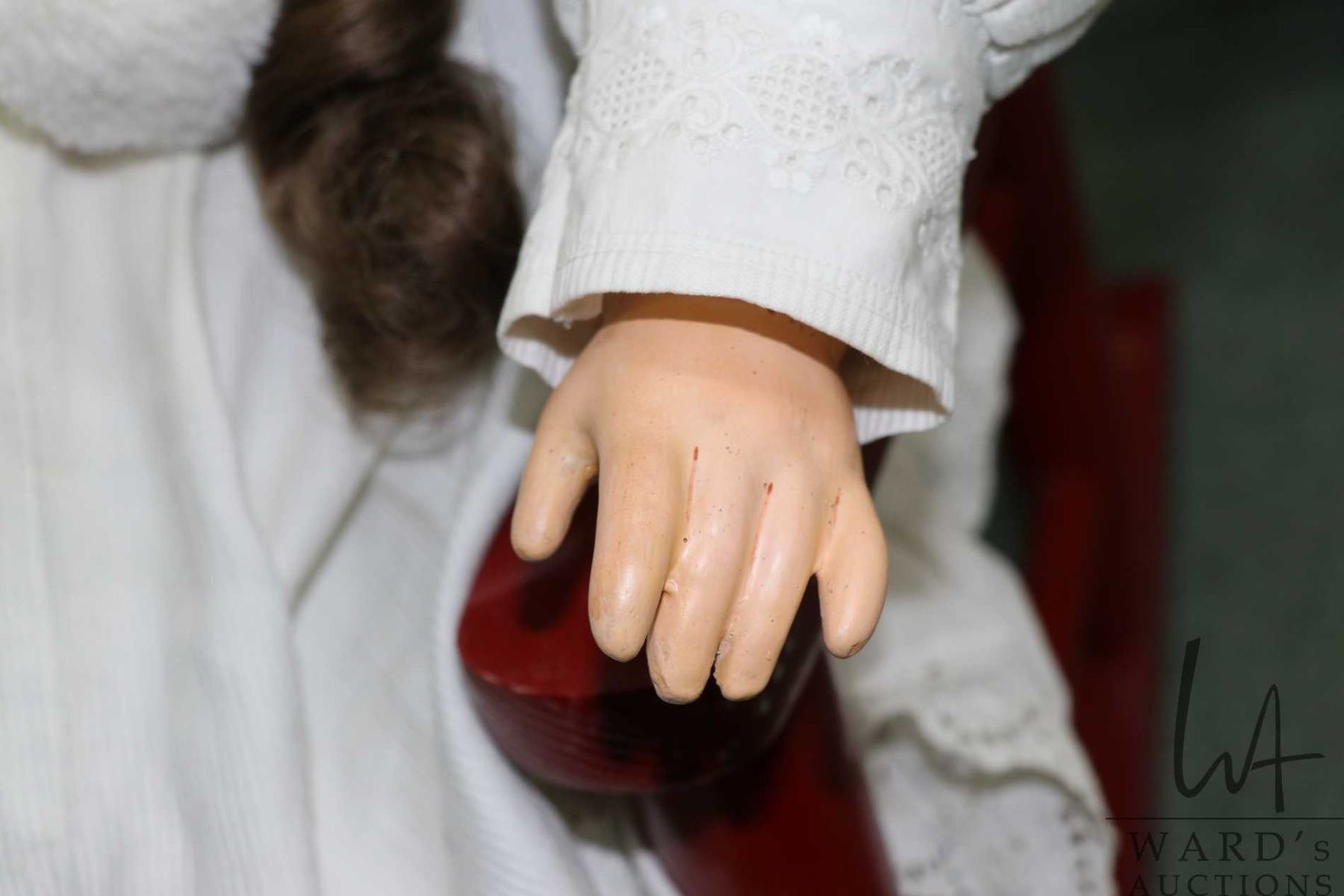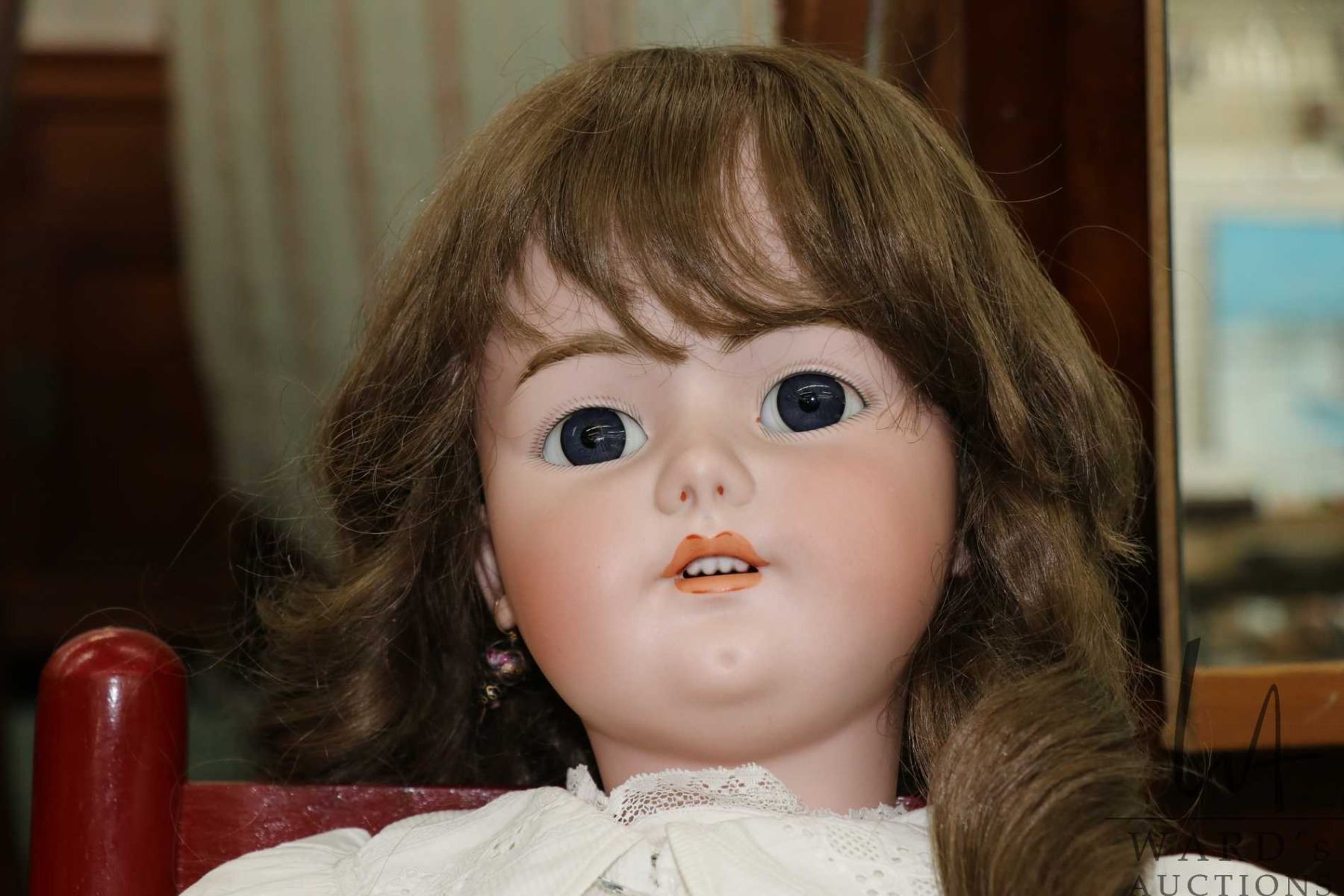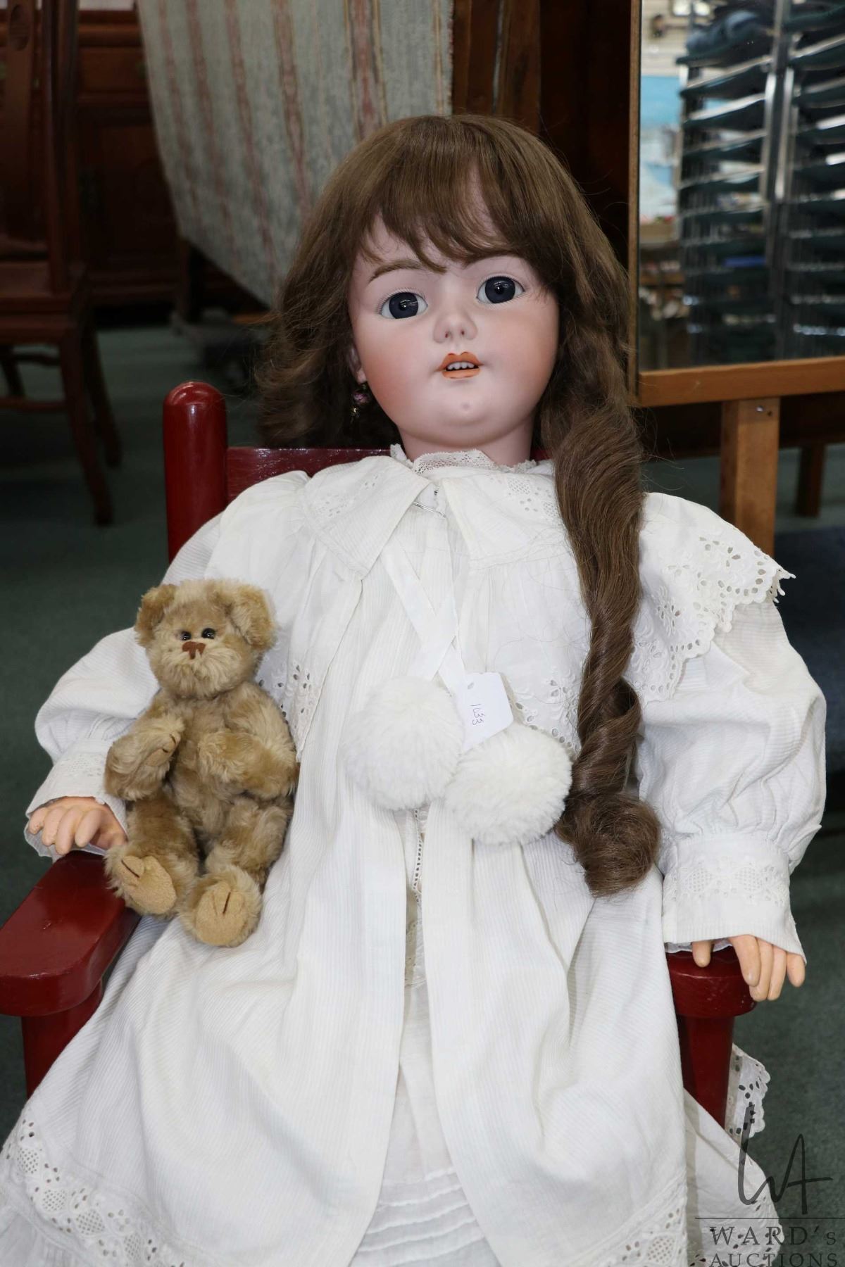 Antique Simon & Halbig 1079.16 bisque head doll on jointed composition body, 31" in height, sleep eyes, extra long human hair wig. No cracks seen to bisque. Includes small child's wooden rocking chair and tiny bear. Note: Viewing in person recommended. Buyer must satisfy themselves as to condition