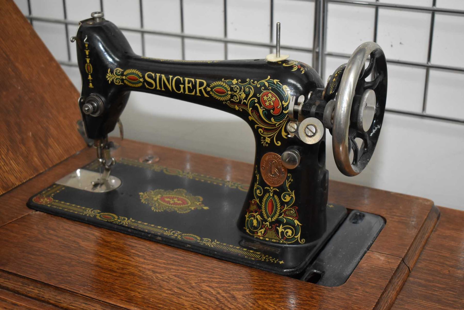 Antique Singer treadle sewing machine in oak and metal cabinet