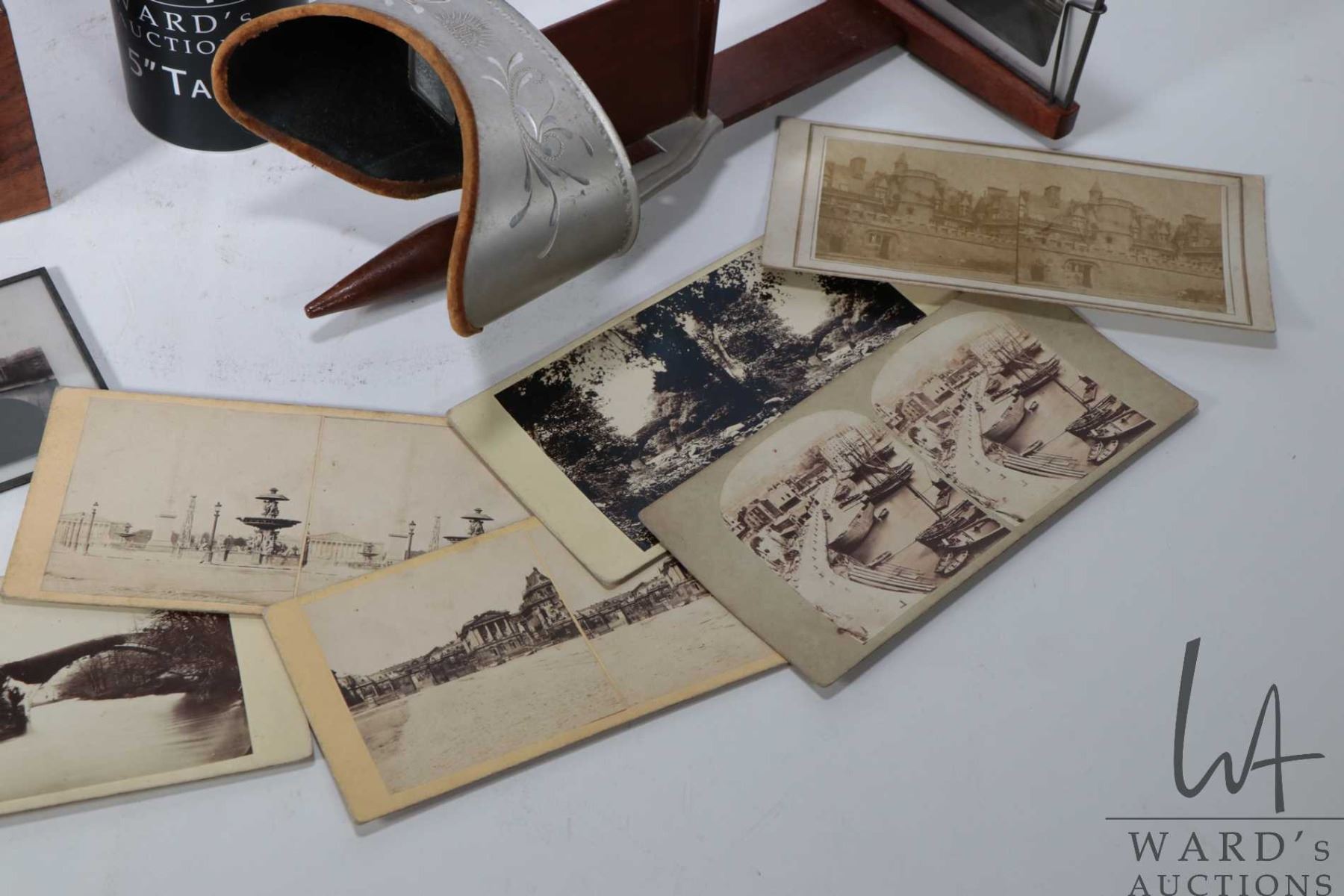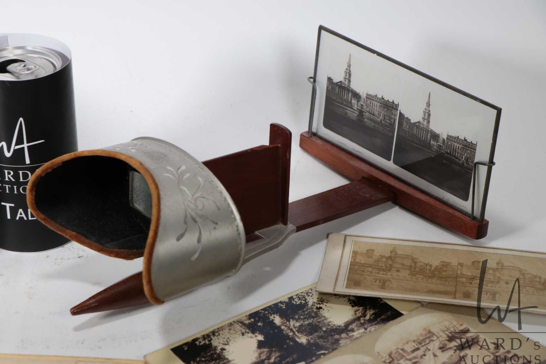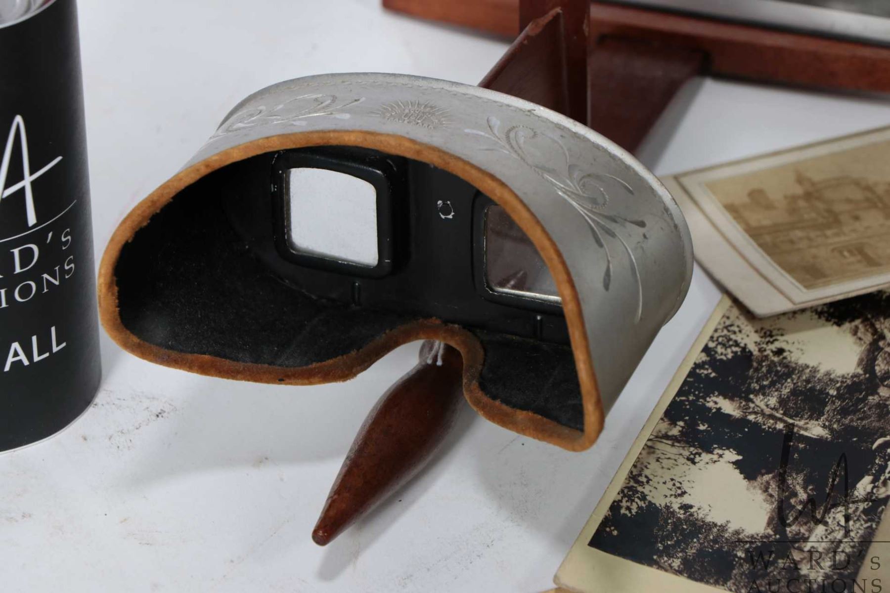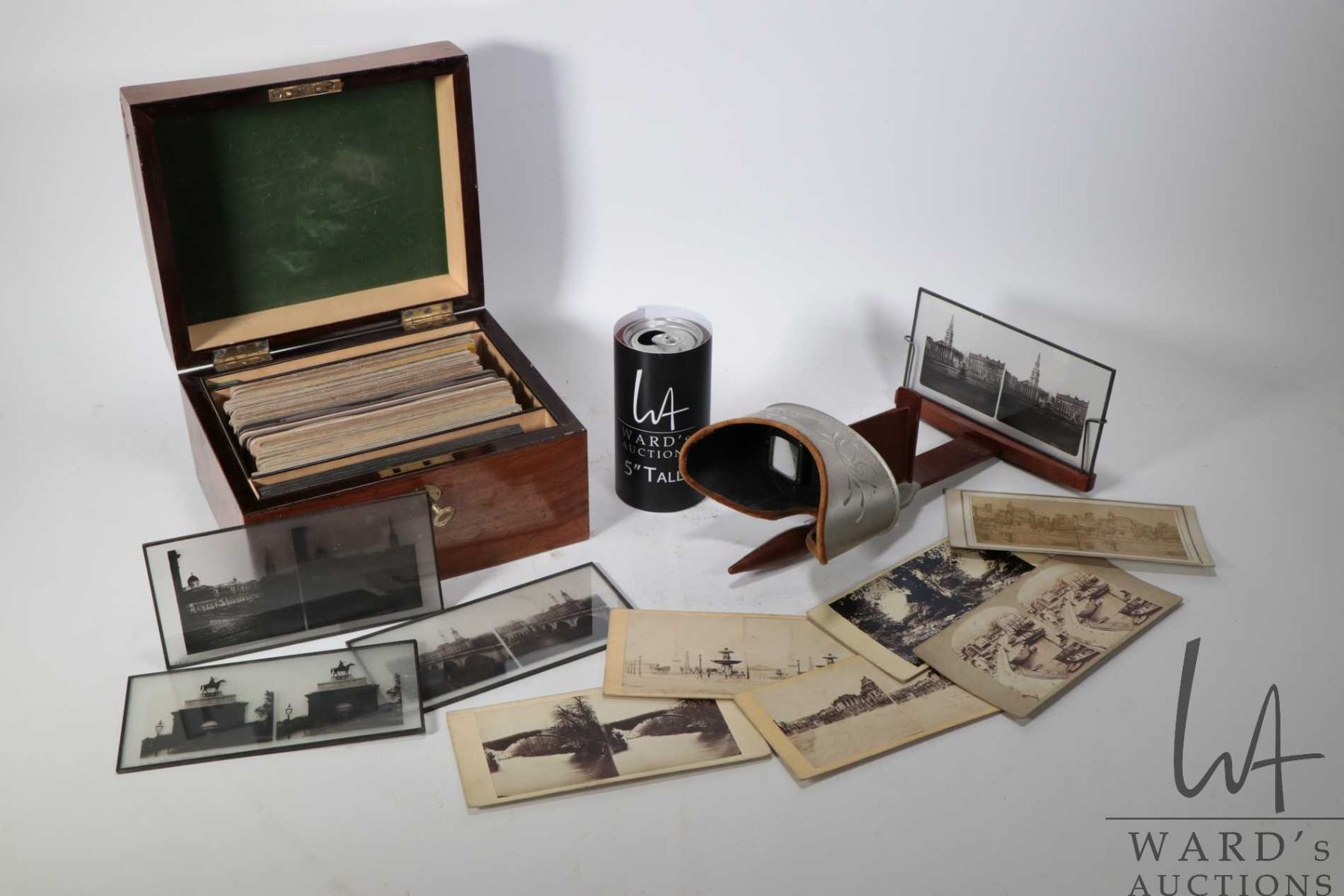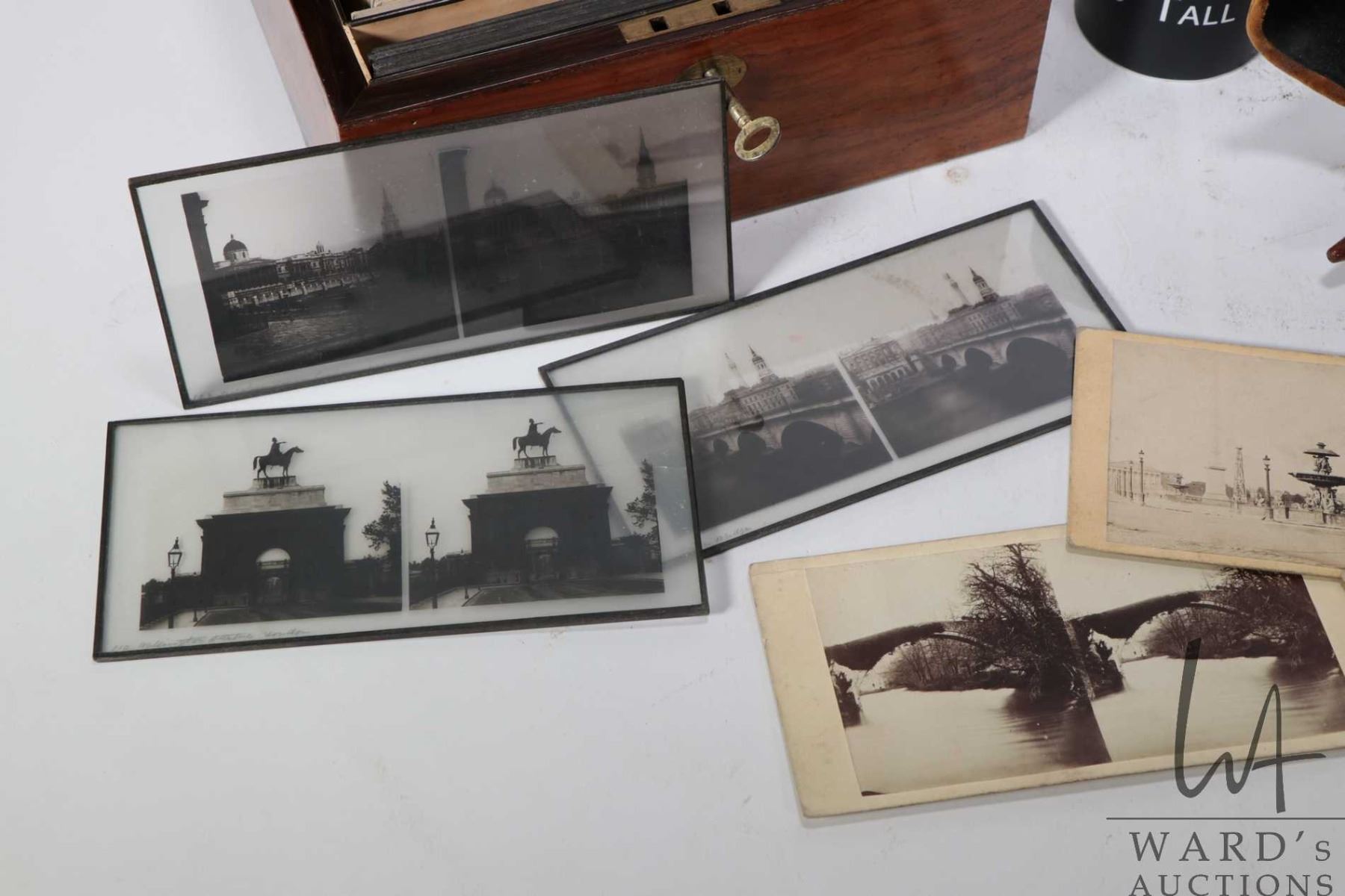 Antique Sun Sculpture U & U stereoscope with domed, locking rosewood "Stereoscopic Treasure" box with key and slides including European travel scenes, coloured slides, domestic farm scenes etc., 81 cardboard slides and eight glass slides which feature architectural London scenes
