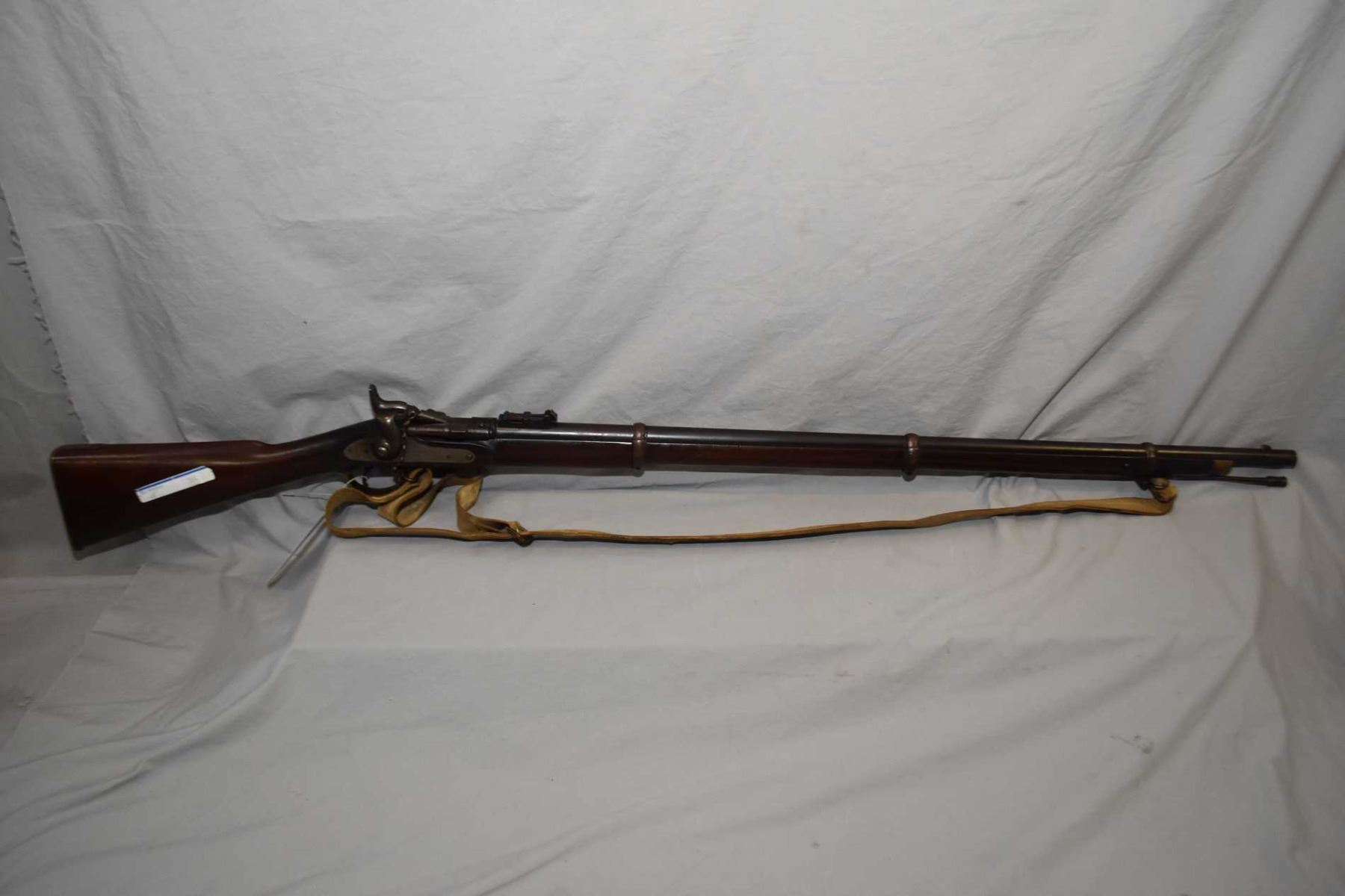 Antique - Thomas Turner ( Fisher St. Birmingham ) Snider Enfield Three Band .577 Snider Cal Full Wood Military Rifle w/ 36 1/2" bbl [ blued finish turning brown, barrel sights, iron furniture, brass nose cap, trigger guard and butt plate, with Thomas Turner cartouche on right side butt stock, various marks and scratches to wood and metal, with nipple protector on chain, sling swivels, leather sling, c/w cleaning rod ] Ser # Nil