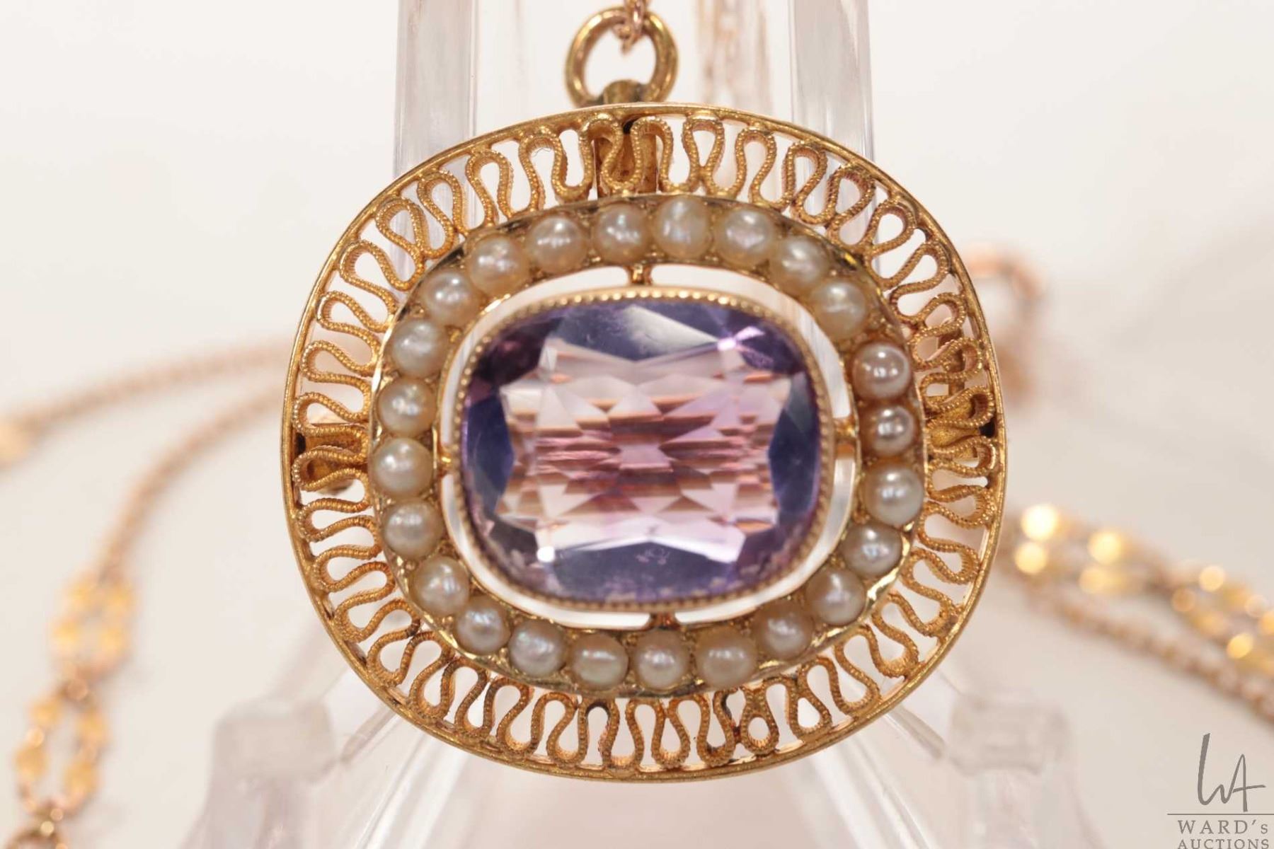 Antique Victorian 14kt yellow gold brooch/ pendant set with amethyst and seed pearl and a 14kt gold necklace 20" in length