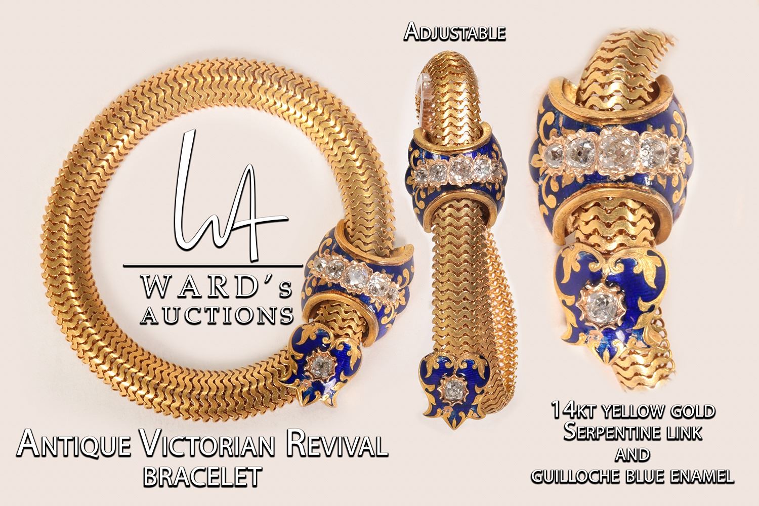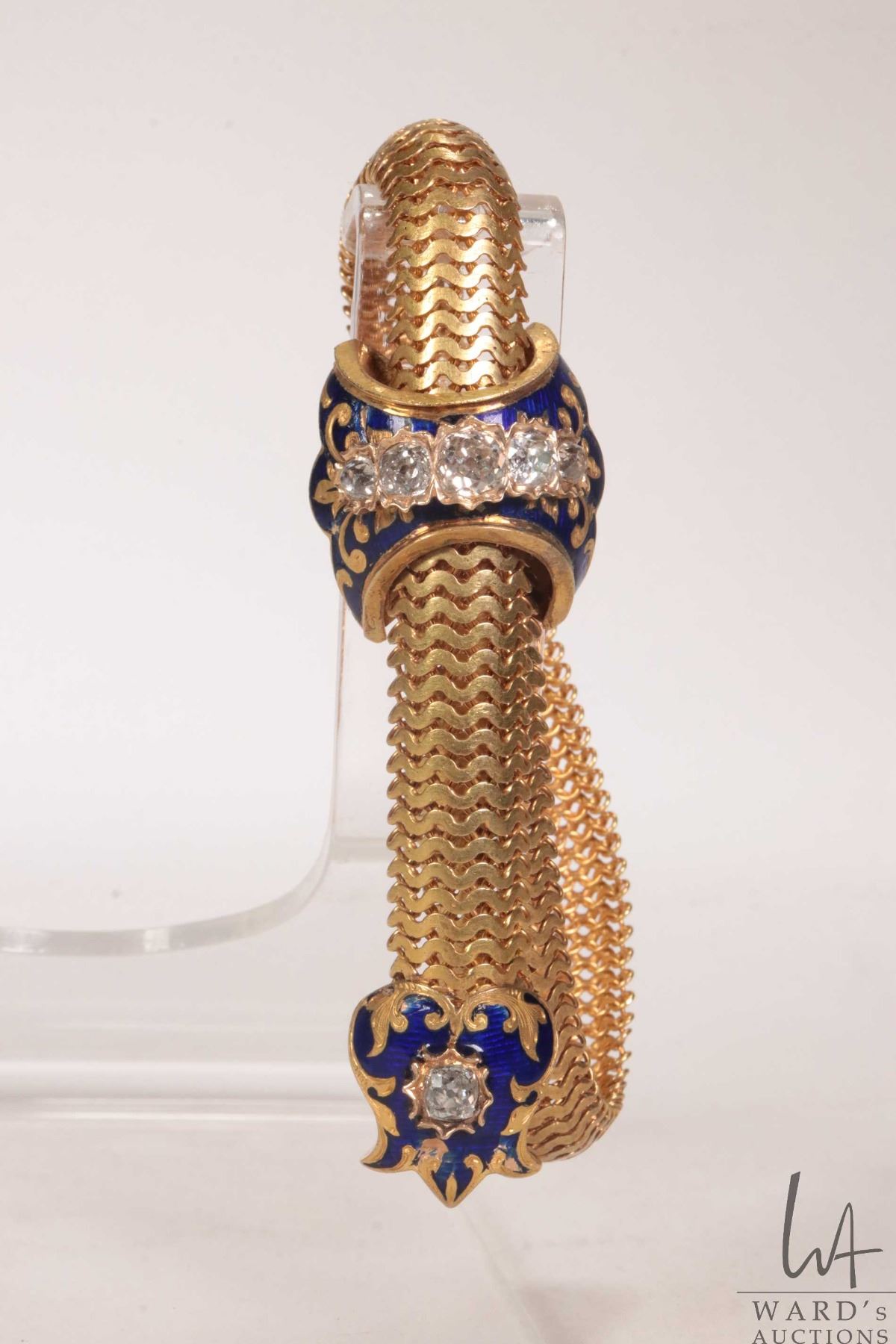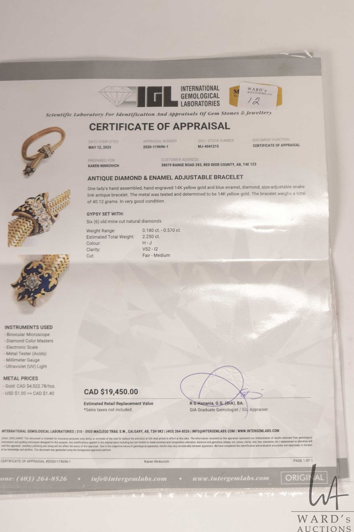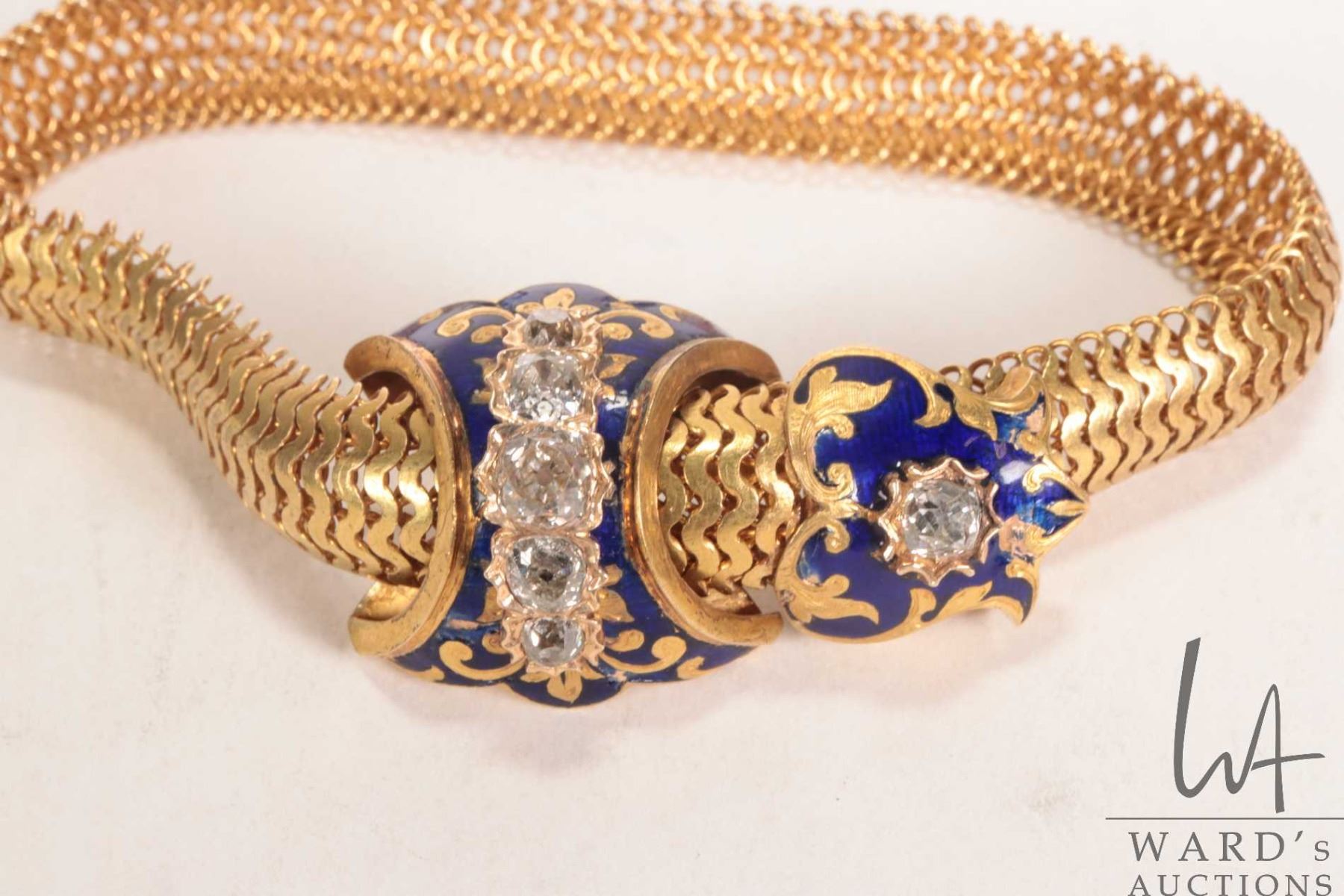 Antique Victorian Revival 14kt yellow gold, diamond, serpentine link and guilloche blue enamel adjustable bracelet Set with 2.250ct of natural old mine cut diamonds. Retail replacement value $19, 450.00